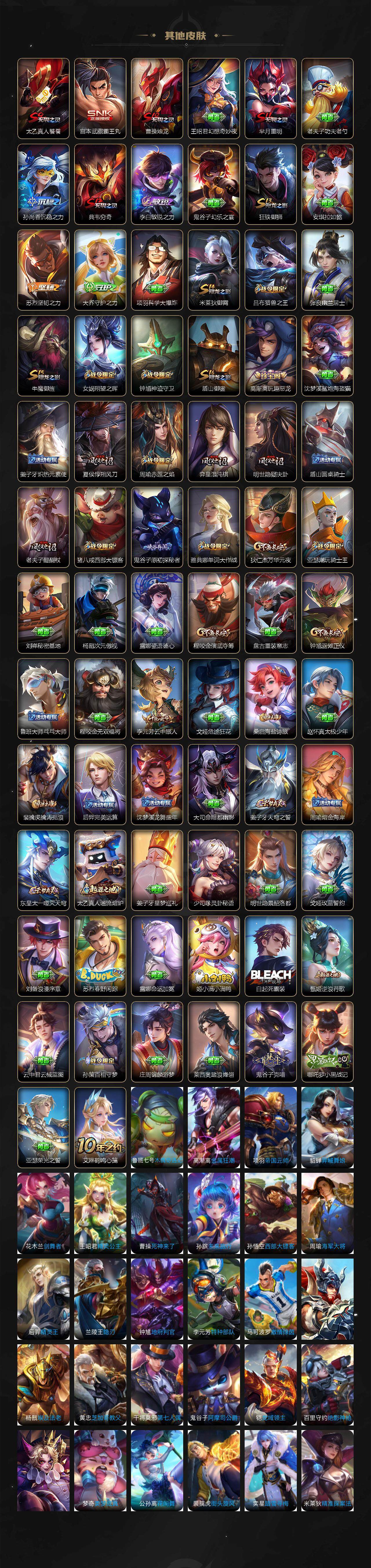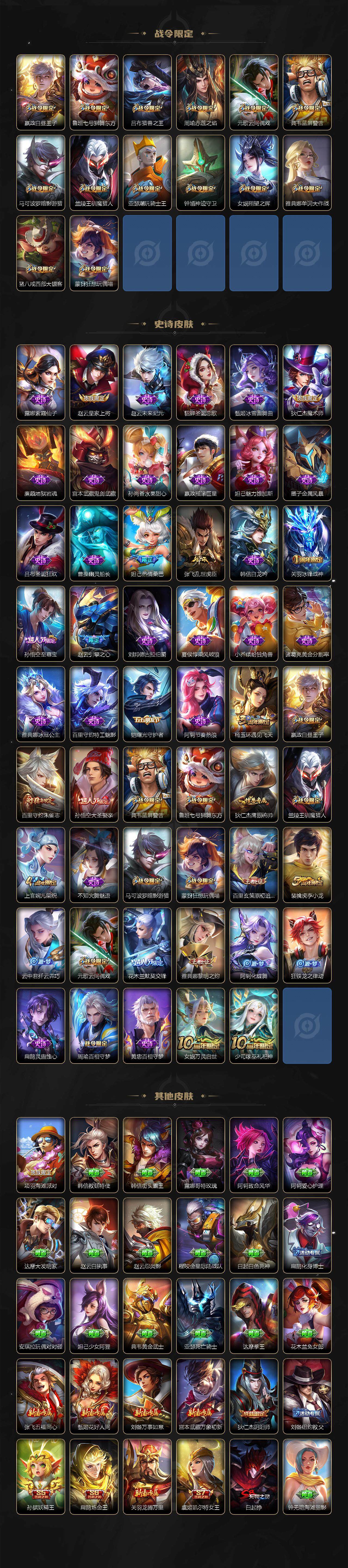 【限定皮肤】:白起狰,姜子牙天穹之誓,狄仁杰阴阳师,虞姬凯尔特女王,赵云皇家上将,赵云引擎之心,妲己热情桑巴,嬴政白昼王子,鲁班七号狮舞东方,高渐离玩趣恶龙,孙膑妖精王,扁鹊炼金王,芈月重明,吕布猎兽之王,周瑜赤莲之焰,元歌云间偶戏,夏侯惇朔风刀,曹操烛龙,典韦穷奇,典韦蓝屏警告,马可波罗暗影游猎,狄仁杰魔术师,狄仁杰万华元夜,项羽海滩派对,老夫子醍醐杖,关羽冰锋战神,程咬金演武夺筹,兰陵王驯魔猎人,花木兰默契交锋,亚瑟潮玩骑士王,孙悟空至尊宝,孙悟空大圣娶亲,牛魔御旌,李元芳云中旅人,钟馗神迹守卫,钟馗驱傩正仪,杨玉环遇见飞天,女娲朔望之晖,雅典娜单词大作战,雅典娜黎明之约,太乙真人饕餮,鬼谷子原初探秘者,百里玄策原初追逐者,百里守约朱雀志,弈星混沌棋,明世隐疑决卦,裴擒虎李小龙,裴擒虎擒涛扼浪,狂铁御狮,米莱狄御霄,云中君纤云弄巧,盾山御銮,猪八戒西部大镖客,上官婉儿梁祝,蒙犽狂想玩偶喵,桑启海盐诗旅,沈梦溪龙舞盛年,周瑜熔金海岸