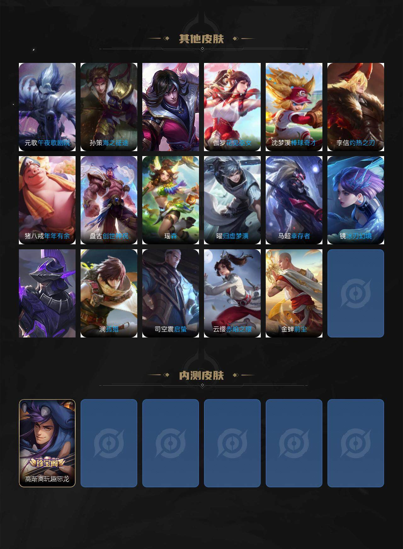 孙膑妖精王,扁鹊炼金王,虞姬凯尔特女王,白起狰,太乙真人饕餮,曹操烛龙,芈月重明,典韦穷奇,狂铁御狮,米莱狄御霄,牛魔御旌,盾山御銮,夏侯惇朔风刀,明世隐疑决卦,老夫子醍醐杖,鬼谷子原初探秘者,狄仁杰万华元夜,程咬金演武夺筹,钟馗驱傩正仪,吕布猎兽之王,嬴政白昼王子,女娲朔望之晖,典韦蓝屏警告,钟馗神迹守卫,鲁班七号狮舞东方,马可波罗暗影游猎,蒙犽狂想玩偶喵,元歌云间偶戏,弈星混沌棋,李元芳云中旅人,桑启海盐诗旅,裴擒虎擒涛扼浪