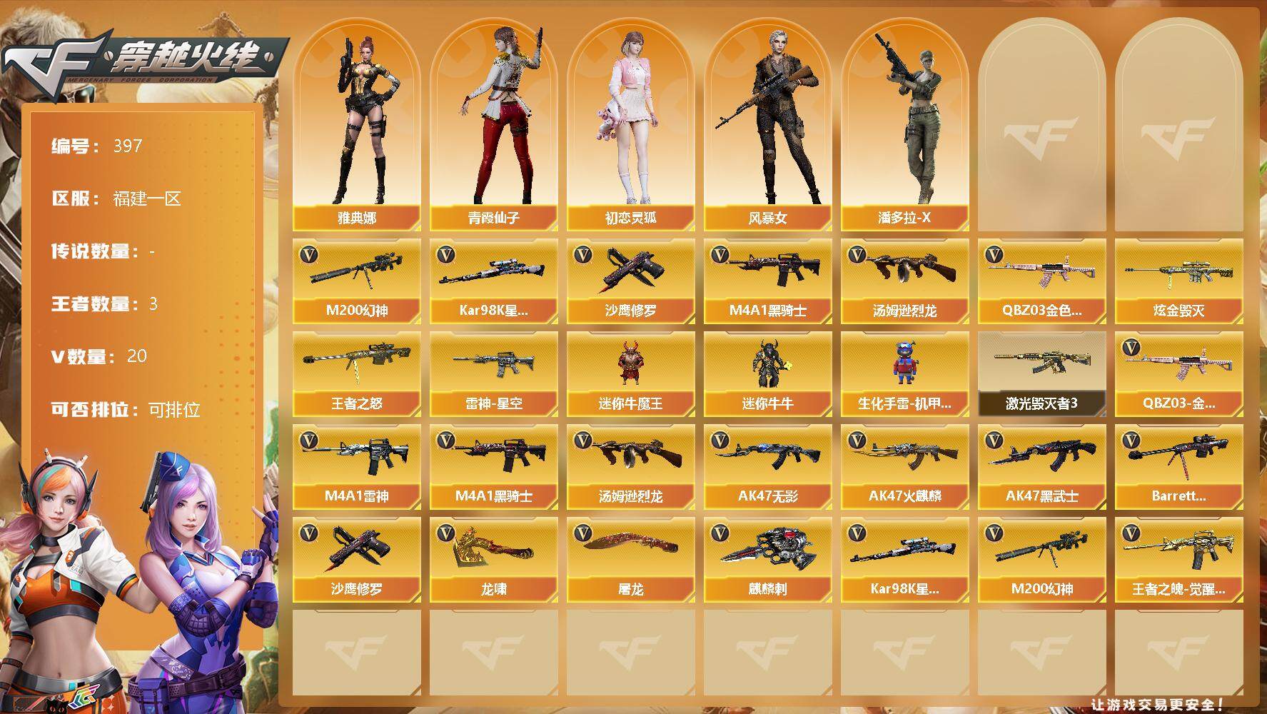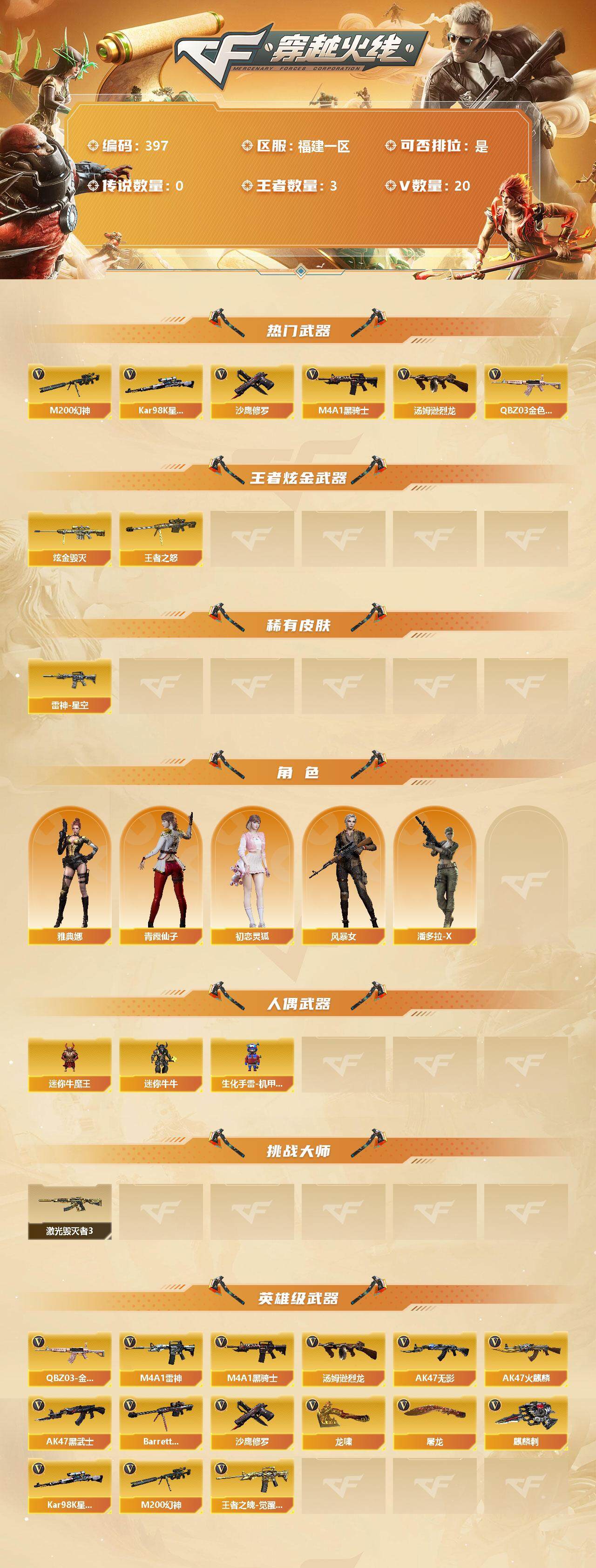 [13141268]福建一区-20V-3王者-1炫金 【热门武器】:QBZ03-金色蔷薇,M200-幻神,Kar98K-星神,M4A1-黑骑士,汤姆逊-烈龙,沙鹰-修罗*2 【王者炫金武器】:王者之怒,炫金毁灭 【皮肤】:雷神-星空 【角色】:初恋灵狐,风暴女,潘多拉-X,青霞仙子,雅典娜 【人偶武器】:迷你牛魔王,迷你牛牛,生化手雷-机甲核心 【挑战大师】:激光毁灭者III 【英雄级武器】:AK47-火麒麟,M4A1-雷神*2,M4A1-黑骑士,AK47-无影,AK47-黑武士,QBZ03-金色蔷薇,王者之魄-觉醒版,Barrett-毁灭,M200-幻神,Kar98K-星神,汤姆逊-烈龙,沙鹰-修罗*2,屠龙*3,龙啸*2,麒麟刺 【特殊枪械】:1黑骑士,1烈龙