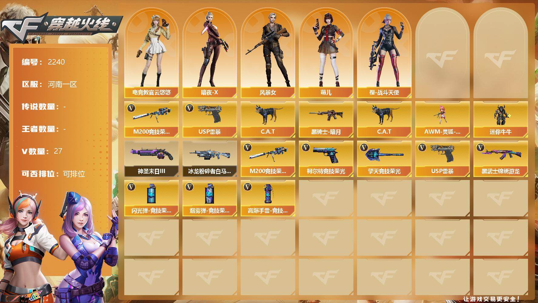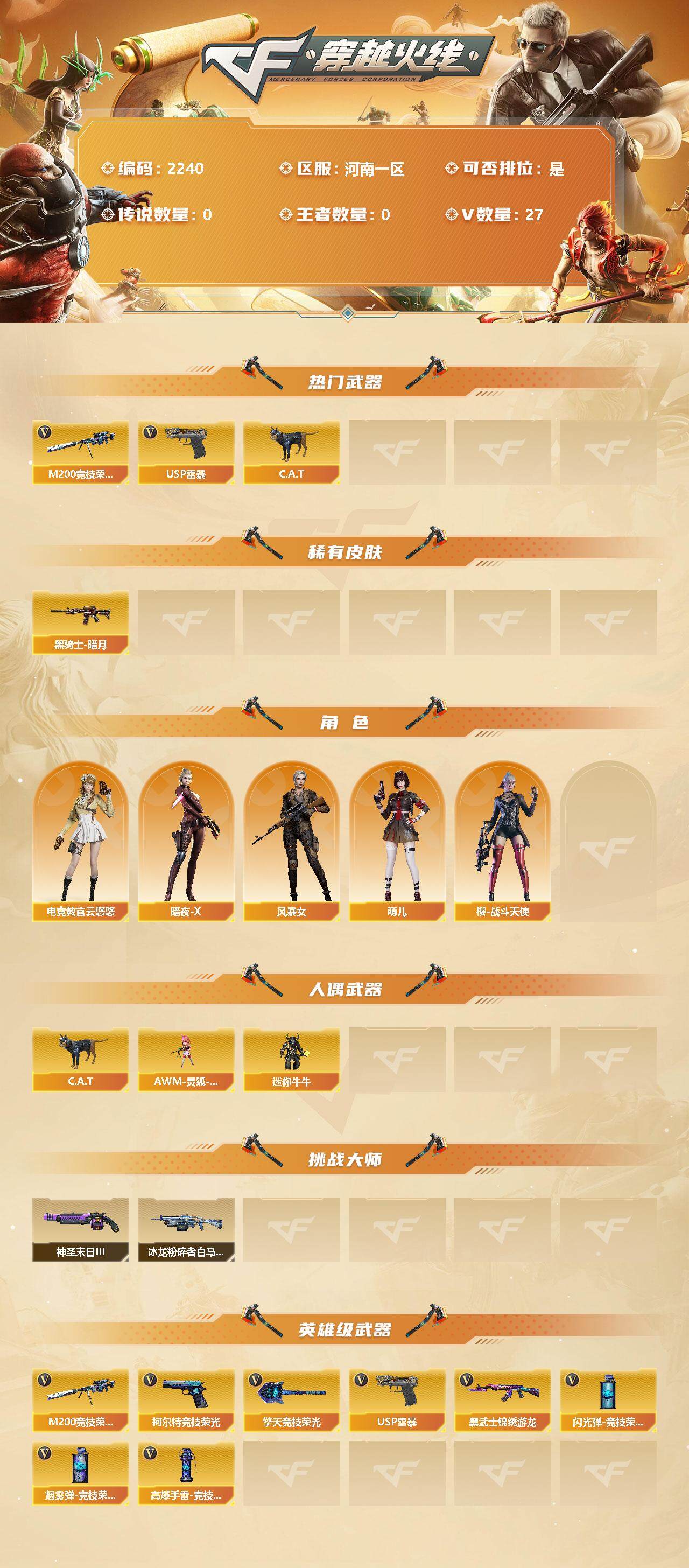 [13142423]河南一区-27V-0王者-0炫金 【热门武器】:M200-竞技荣光,C.A.T,USP-雷暴 【皮肤】:雷神-暗月,黑骑士-暗月*2 【角色】:电竞教官-云悠悠,暗夜-X,风暴女,萌儿,樱-战斗天使 【人偶武器】:AWM-灵狐-15周年嘉年华,C.A.T,迷你牛牛 【挑战大师】:冰龙粉碎者-白马银枪,神圣爆裂者-末日III 【英雄级武器】:黑武士-锦绣游龙,M200-竞技荣光,USP-雷暴,柯尔特-竞技荣光,擎天-竞技荣光*4,高爆手雷-竞技荣光*6,闪光弹-竞技荣光*6,烟雾弹-竞技荣光*6 【特殊枪械】: