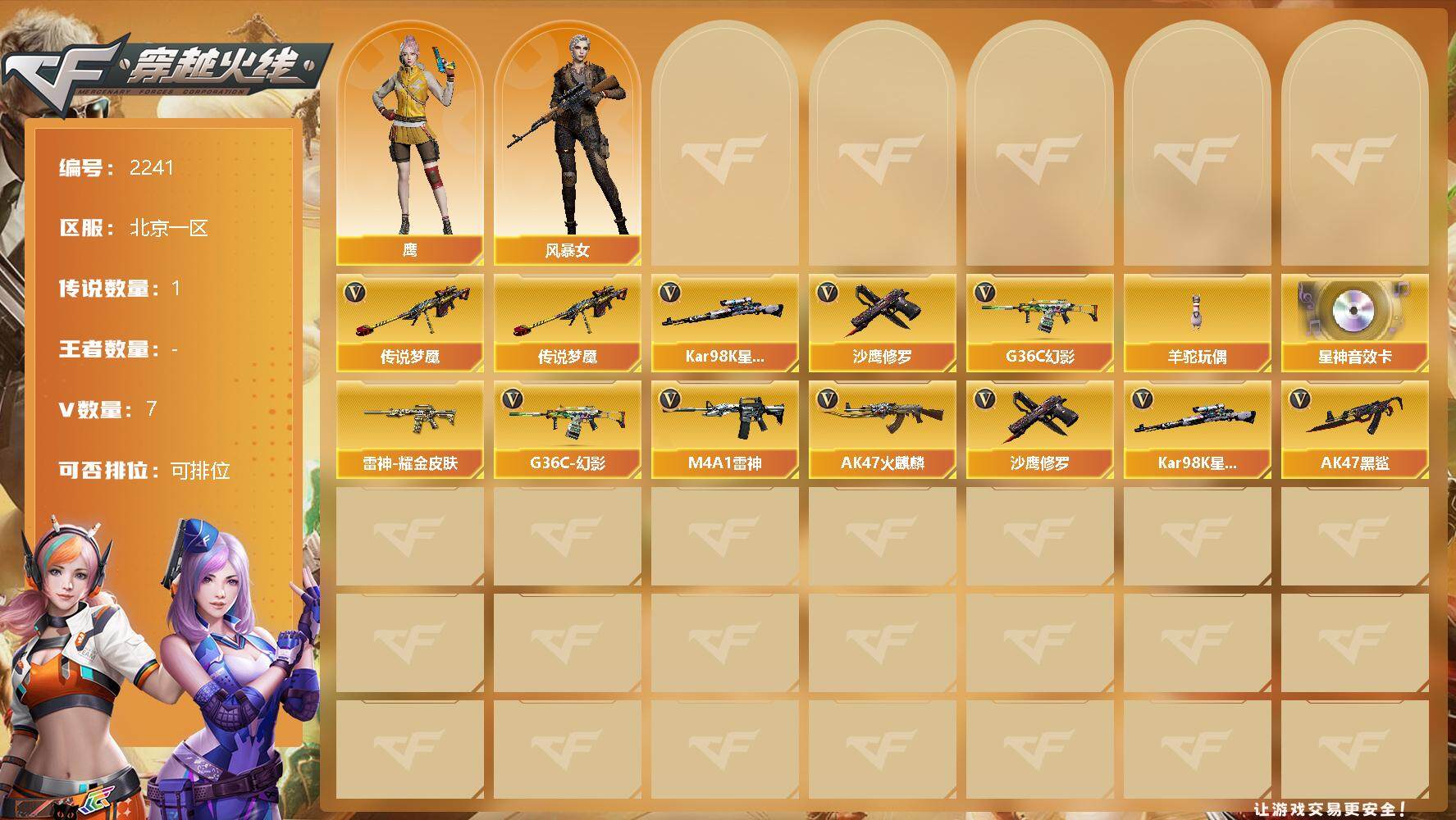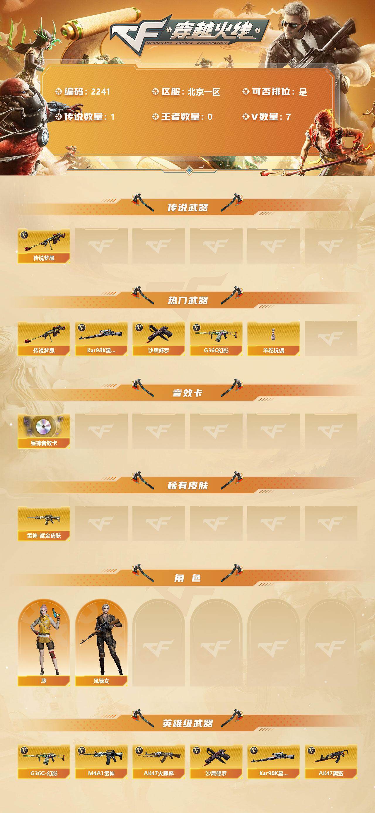 [13142645]北京一区-7V-0王者-0炫金 【传说武器】:传说梦魇 【热门武器】:传说梦魇,G36C-幻影,Kar98K-星神,羊驼玩偶,沙鹰-修罗 【音效卡】:Kar98K-星神音效卡 【皮肤】:雷神-耀金皮肤 【角色】:鹰,风暴女 【英雄级武器】:AK47-火麒麟,M4A1-雷神,AK47-黑鲨,G36C-幻影,Kar98K-星神,沙鹰-修罗 【特殊枪械】: