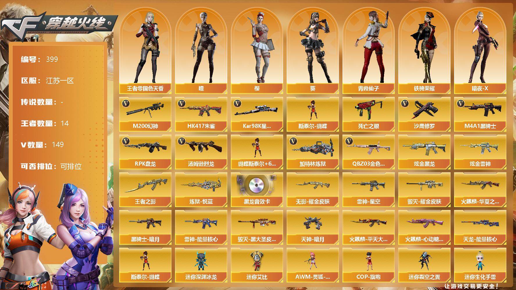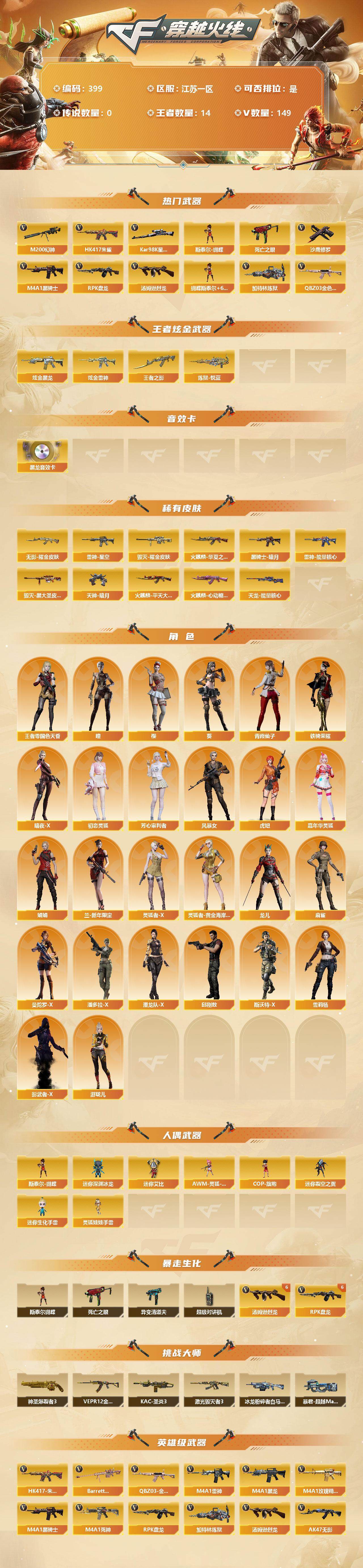 [13142772]江苏一区-149V-14王者-2炫金 【热门武器】:QBZ03-金色蔷薇,HK417-朱雀,M200-幻神,死亡之眼*4,Kar98K-星神,M4A1-黑骑士*5,汤姆逊-烈龙*17,RPK-盘龙*11,加特林-炼狱*2,斯泰尔-蝴蝶,沙鹰-修罗*9 【王者炫金武器】:王者之影,炼狱-悦蓝*2,炫金黑龙,炫金雷神 【音效卡】:M4A1-黑龙音效卡 【皮肤】:雷神-暗月,雷神-能量核心,雷神-星空*2,火麒麟-华夏之心*3,火麒麟-平天大圣,火麒麟-心动糖果,毁灭耀金皮肤,毁灭-黑大圣皮肤,M4A1-千变-孔明皮肤*2,黑龙-暗月*2,黑骑士-暗月*2,无影-暗月,无影-能量核心,无影耀金皮肤,天启-暗月,战神-粉色甜心皮肤,战神-紫绶金章皮肤,天龙-能量核心,极光-能量核心,修罗-能量核心*3,天神-暗月 【角色】:葵,樱,瞳,王者-零-国色天香,暗夜-X,初恋灵狐,芳心审判者,风暴女*2,虎妞,嘉年华灵狐,娟娟,兰-新年限定,灵狐者-X,灵狐者-黄金海岸,龙儿,麻雀,曼陀罗-X,潘多拉-X,潜龙队-X,邱刚敖,青霞仙子,斯沃特-X,铁骑荣耀,雪莉杨,影武者-X,游珑儿 【人偶武器】:斯泰尔-蝴蝶,AWM-灵狐-15周年嘉年华,COP-旗袍,迷你艾比,迷你深渊冰龙,迷你裂空之翼,迷你生化手雷*2,灵狐娃娃手雷 【暴走生化】:异变清道夫,斯泰尔-蝴蝶,死亡之眼*4,超级对讲机 【挑战大师】:暴君乱世-超越Max,神圣爆裂者III,冰龙粉碎者-白马银枪,VEPR-12-金魔,激光毁灭者III,KAC-圣炎切割者III 【英雄级武器】:M4A1-千变*2,AK47-火麒麟*3,M4A1-黑龙,M4A1-雷神*6,M4A1-黑骑士*5,AK47-无影*2,M4A1-死神,AK47-黑武士*2,AK12-天启*3,AN94-超新星*3,M4A1-武圣,AK47-机械迷城,AK47-黑鲨*2,HK417-朱雀,无影-神兵利器,黑武士-锦绣游龙,M4A1-玫瑰精灵,QBZ03-金色蔷薇,M4A1-猎神,王者之心-觉醒版,王者之魄-觉醒版,王者之势-觉醒版,AK-47-猩红传说,王者之鲨-觉醒版,王者冰魄-觉醒版,黑骑士-海王*3,黑武士-CF网剧冠军*2,AWM-天龙,Barrett-毁灭*5,Barrett-极光*2,AWM-裁决,M200-幻神,Kar98K-星神,Barr