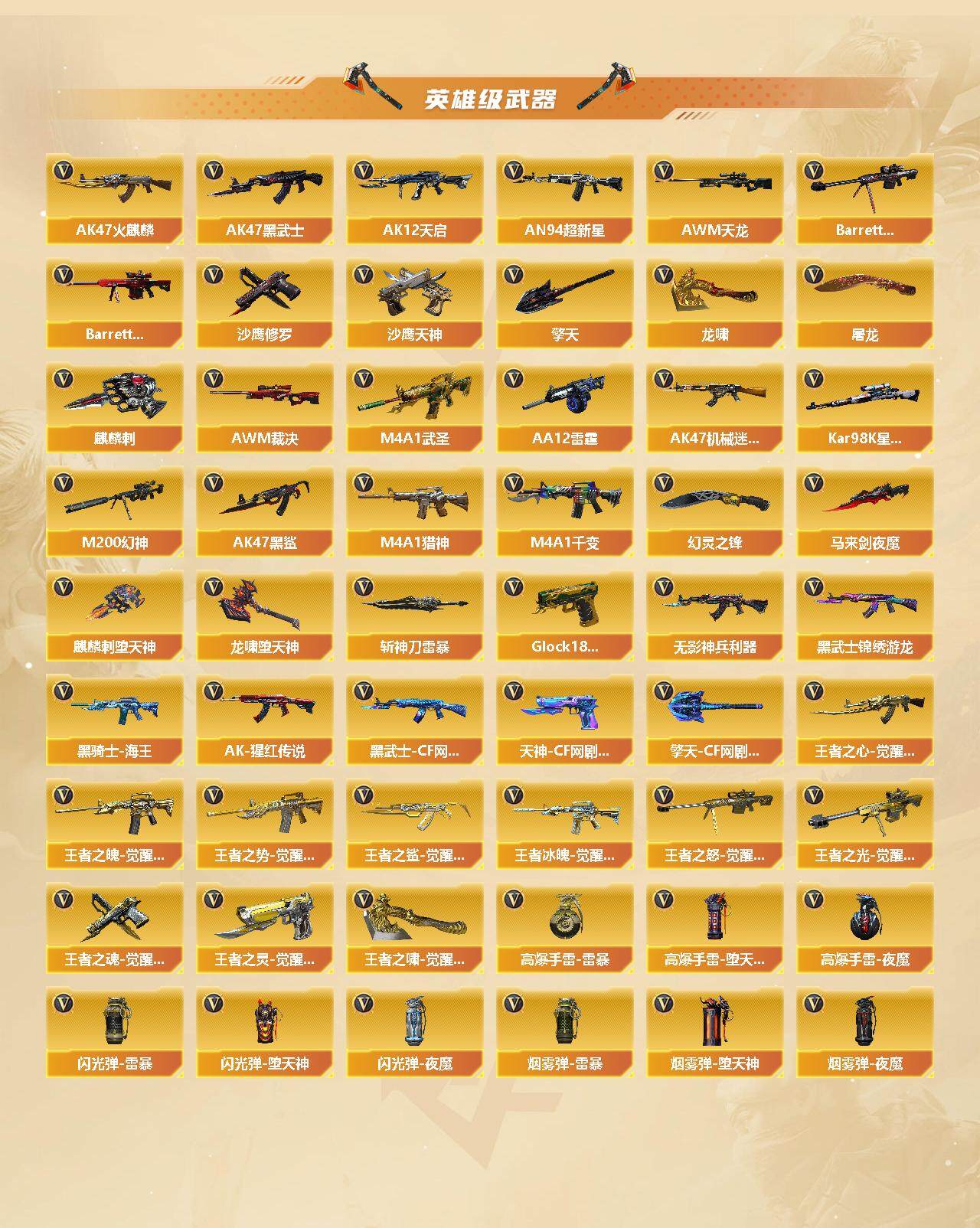 【英雄级武器】:M4A1-千变*2,AK47-火麒麟*3,M4A1-黑龙,M4A1-雷神*6,M4A1-黑骑士*5,AK47-无影*2,M4A1-死神,AK47-黑武士*2,AK12-天启*3,AN94-超新星*3,M4A1-武圣,AK47-机械迷城,AK47-黑鲨*2,HK417-朱雀,无影-神兵利器,黑武士-锦绣游龙,M4A1-玫瑰精灵,QBZ03-金色蔷薇,M4A1-猎神,王者之心-觉醒版,王者之魄-觉醒版,王者之势-觉醒版,AK-47-猩红传说,王者之鲨-觉醒版,王者冰魄-觉醒版,黑骑士-海王*3,黑武士-CF网剧冠军*2,AWM-天龙,Barrett-毁灭*5,Barrett-极光*2,AWM-裁决,M200-幻神,Kar98K-星神,Barr