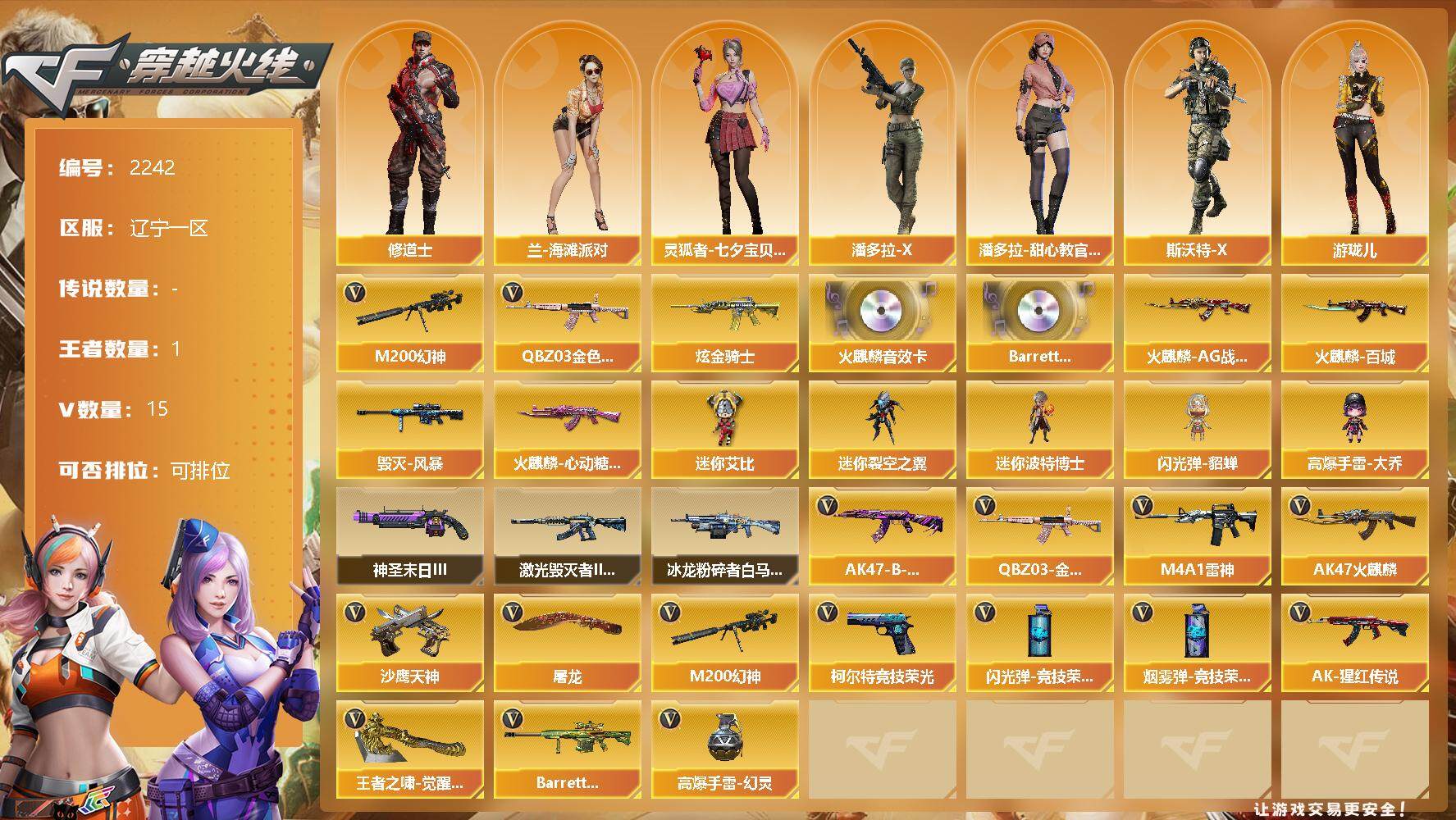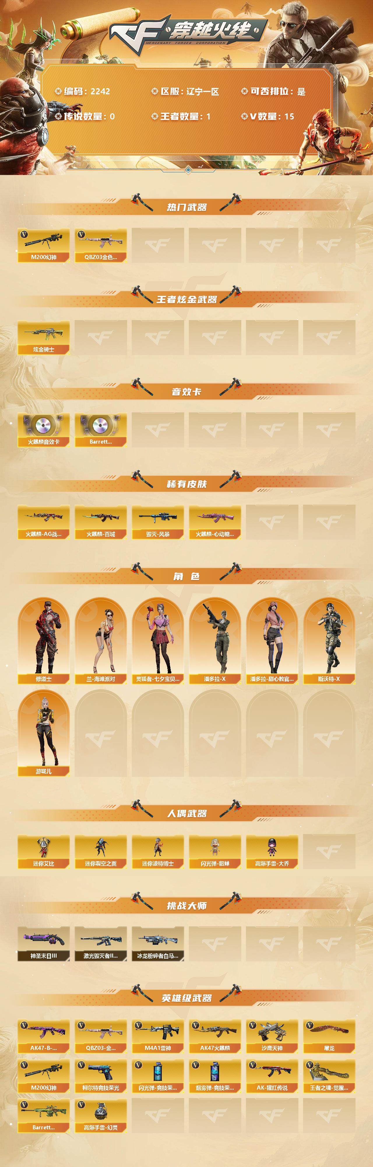 [13142824]辽宁一区-15V-1王者-1炫金 【热门武器】:QBZ03-金色蔷薇,M200-幻神 【王者炫金武器】:炫金骑士 【音效卡】:AK47-火麒麟音效卡,Barrett-碧霄极光音效卡 【皮肤】:火麒麟-AG战队皮肤,火麒麟-百城,火麒麟-心动糖果,毁灭-风暴*2,战神-粉色甜心皮肤,战神-紫绶金章皮肤*2,AK47-B-常胜将军-曹操,AK47-B-常胜将军-刘备,AK47-B-常胜将军-孙权*2 【角色】:修道士,兰-海滩派对,灵狐者-七夕宝贝,潘多拉-X,潘多拉-甜心教官,斯沃特-X,游珑儿 【人偶武器】:迷你艾比,迷你裂空之翼,迷你波特博士,闪光弹-貂蝉,高爆手雷-大乔 【挑战大师】:冰龙粉碎者-白马银枪,激光毁灭者III-白马银枪,神圣爆裂者-末日III 【英雄级武器】:AK47-火麒麟,M4A1-雷神,QBZ03-金色蔷薇,AK-47-猩红传说,AK47-B-常胜将军,M200-幻神,沙鹰-天神,柯尔特-竞技荣光,屠龙,王者之啸-觉醒版,高爆手雷-幻灵,闪光弹-竞技荣光,烟雾弹-竞技荣光,Barrett-碧霄极光 【特殊枪械】: