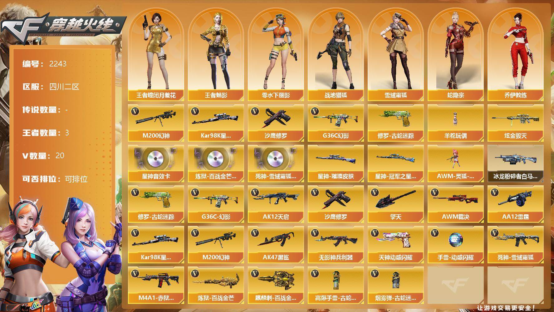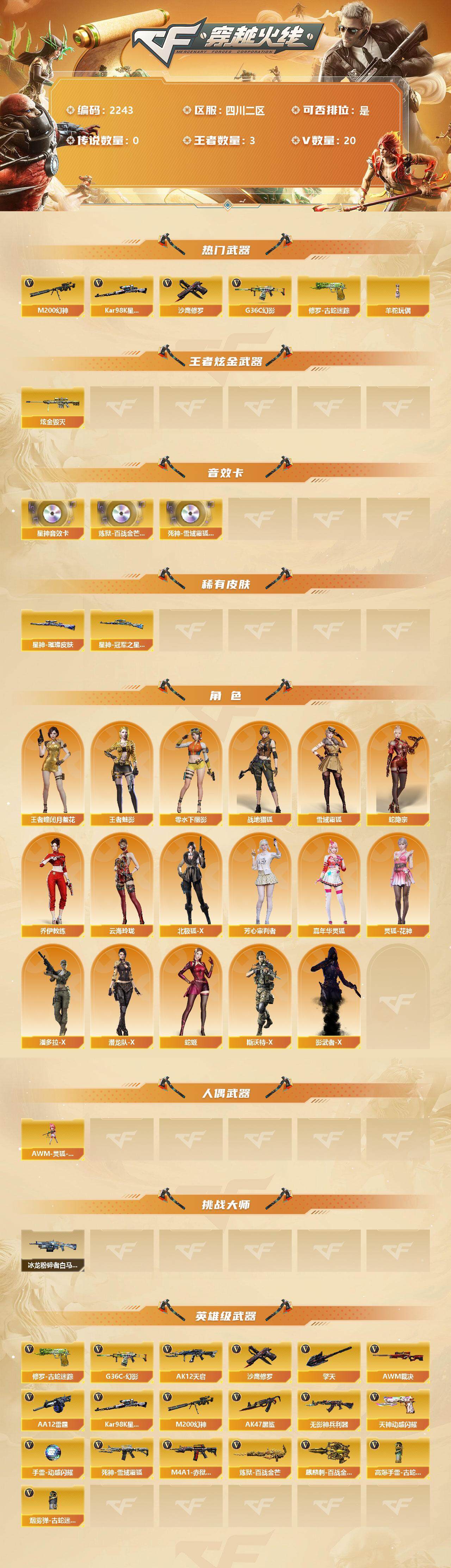 [13143002]四川二区-20V-3王者-1炫金 【热门武器】:G36C-幻影,M200-幻神,修罗-古蛇迷踪,Kar98K-星神,羊驼玩偶*3,沙鹰-修罗*2 【王者炫金武器】:炫金毁灭 【音效卡】:Kar98K-星神音效卡,炼狱-百战金芒-庆典舞曲音效卡,死神-雪域霜狐-怀旧音效卡 【皮肤】:星神-璀璨皮肤,Kar98K-星神-冠军之星皮肤,M4A1-再燃火线,修罗-能量核心,轻型军用手斧-再燃火线 【角色】:战地猎狐,王者-瞳-闭月羞花,王者-魅影,雪域霜狐,蛇隐宗,乔伊教练,云海玲珑,北极狐-X,芳心审判者,嘉年华灵狐,零-水下丽影,灵狐-花神,潘多拉-X,潜龙队-X,蛇姬,斯沃特-X,影武者-X 【人偶武器】:AWM-灵狐-15周年嘉年华 【挑战大师】:冰龙粉碎者-白马银枪 【英雄级武器】:AK12-天启,AK47-黑鲨,无影-神兵利器,G36C-幻影,死神-雪域霜狐,AWM-裁决,M200-幻神,Kar98K-星神,炼狱-百战金芒,AA-12-雷霆,沙鹰-修罗*2,天神-动感闪耀,修罗-古蛇迷踪,擎天,麒麟刺-百战金芒,手雷-动感闪耀,高爆手雷-古蛇迷踪,烟雾弹-古蛇迷踪,M4A1-赤狱骑士 【特殊枪械】: