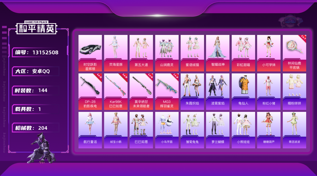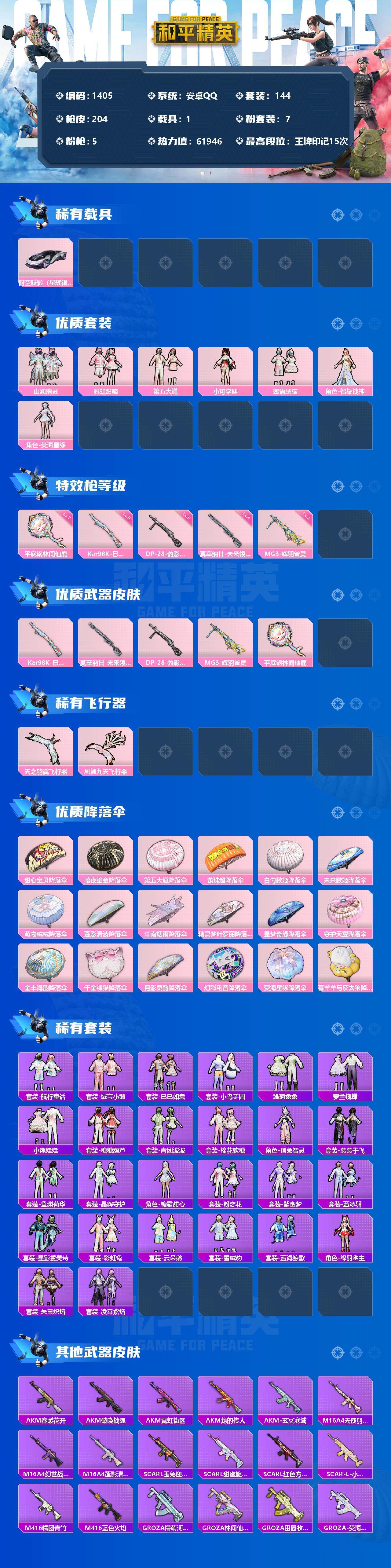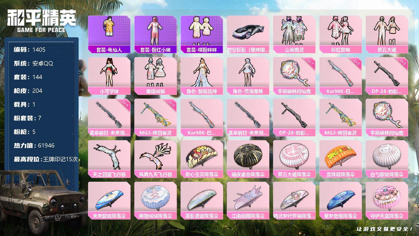 [13152508]安卓 手Q-7粉装-5特效枪-1载具-2粉色飞行器-61946热力值-15王牌印记-144套装-204枪皮 【热门品类】:套装-龟仙人,套装-粉红小猪,套装-糯粉咩咩 【粉色载具】:时空跃影(星辉银) 【粉色套装】:粉装-山涧鹿灵,粉装-彩虹甜喵,粉装-第五大道,角色-小可学妹,粉装-蜜语绒猫,角色-智耀战神,角色-荧海星豚 【粉色枪皮等级】:Kar98K-巳巳如意(五级),莫辛纳甘-未来领航者(四级),DP-28-豹影疾电(五级),MG3-辉羽雀灵(三级),平底锅-林间仙鹿(七级) 【粉色枪皮】:Kar98K-巳巳如意,莫辛纳甘-未来领航者,DP-28-豹影疾电,MG3-辉羽雀灵,平底锅-林间仙鹿 【粉色飞行器】:天之羽翼飞行器,凤舞九天飞行器 【粉色降落伞】:甜心宝贝降落伞,暗夜鎏金降落伞,第五大道降落伞,龙珠超降落伞,白勺歌姬降落伞,未来歌姬降落伞,萌物绒绒降落伞,莲影清波降落伞,江南烟雨降落伞,精灵梦叶罗丽降落伞,星梦奇缘降落伞,守护天翼降落伞,金丰海韵降落伞,千金淑猫降落伞,月影灵韵降落伞,幻彩电音降落伞,荧海星豚降落伞,喜羊羊与灰太狼降落伞 【稀有套装】:套装-龟仙人,套装-航行童话,套装-绒宝小鹅,套装-巳巳如意,套装-小鸟芋圆,套装-雏菊兔兔,套装-萝兰蝴蝶,套装-小熊娃娃,套装-糖糖葫芦,套装-青团波波,套装-棉花软糖,角色-俏兔智灵,套装-燕燕于飞,套装-鱼渊荷华,套装-晶辉守护,角色-糖霜甜心,套装-粉恋花,套装-紫幽梦,套装-蓝冰羽,套装-星影赞美诗,套装-彩虹兔,套装-云朵鹅,套装-雪绒豹,套装-蓝海鲸歌,角色-绛羽幽主,套装-朱霞炽焰,套装-凌霄紫焰 【稀有枪皮】:AKM-春暖花开,AKM-破晓战魂,AKM-霓虹街区,AKM-龙的传人,AKM-玄冥寒域,M16A4-天使羽翼,M16A4-幻世战舞者,M16A4-莲影清波,SCAR-L-玉兔迎春,SCAR-L-甜蜜旋律,SCAR-L-红色方程式,SCAR-L-小狗蛇点点,M416-糯团青竹,M416-蓝色火焰,GROZA-懵萌河马,GROZA-林间仙鹿,GROZA-田园牧歌,GROZA-荧海星豚,AUG-天降萌叽,AUG-耀粉歌者,QBZ-洛神天依,M762-天降萌叽,M762-云朵鹅,Mk47-妙红点点,Mk47-洛神天依,G36C-懵萌河马,AC-VAL-天降萌叽,AC-VAL-彩虹甜