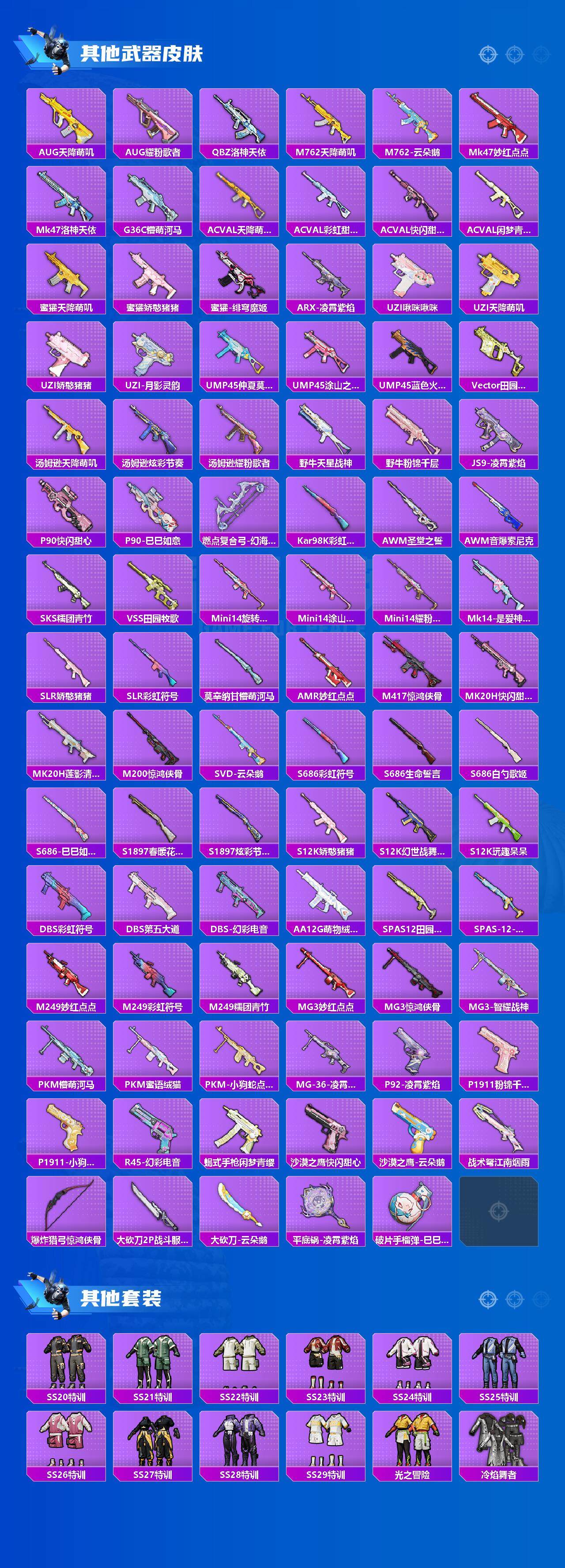 【稀有枪皮】:AKM-春暖花开,AKM-破晓战魂,AKM-霓虹街区,AKM-龙的传人,AKM-玄冥寒域,M16A4-天使羽翼,M16A4-幻世战舞者,M16A4-莲影清波,SCAR-L-玉兔迎春,SCAR-L-甜蜜旋律,SCAR-L-红色方程式,SCAR-L-小狗蛇点点,M416-糯团青竹,M416-蓝色火焰,GROZA-懵萌河马,GROZA-林间仙鹿,GROZA-田园牧歌,GROZA-荧海星豚,AUG-天降萌叽,AUG-耀粉歌者,QBZ-洛神天依,M762-天降萌叽,M762-云朵鹅,Mk47-妙红点点,Mk47-洛神天依,G36C-懵萌河马,AC-VAL-天降萌叽,AC-VAL-彩虹甜