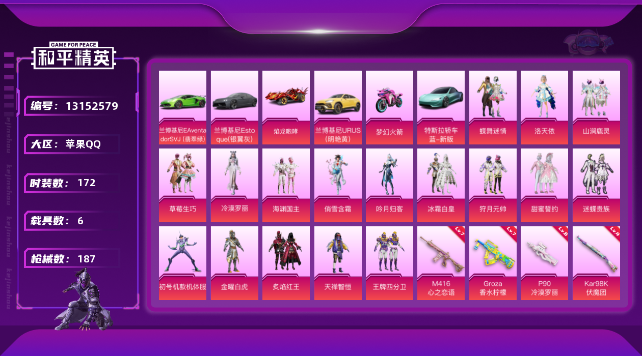 [13152579]苹果 手Q-18粉装-5特效枪-6载具-1粉色飞行器-76024热力值-9王牌印记-172套装-187枪皮