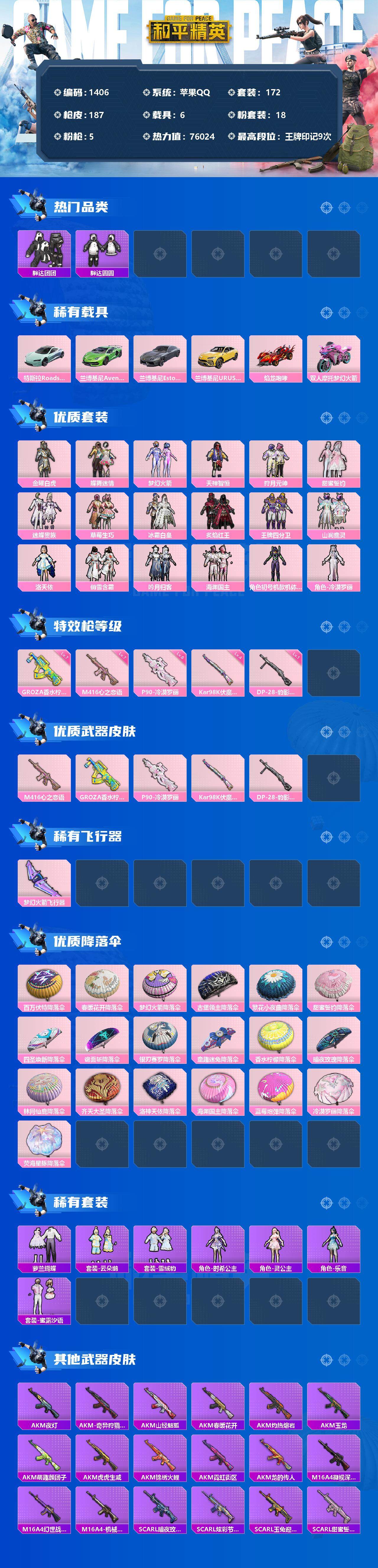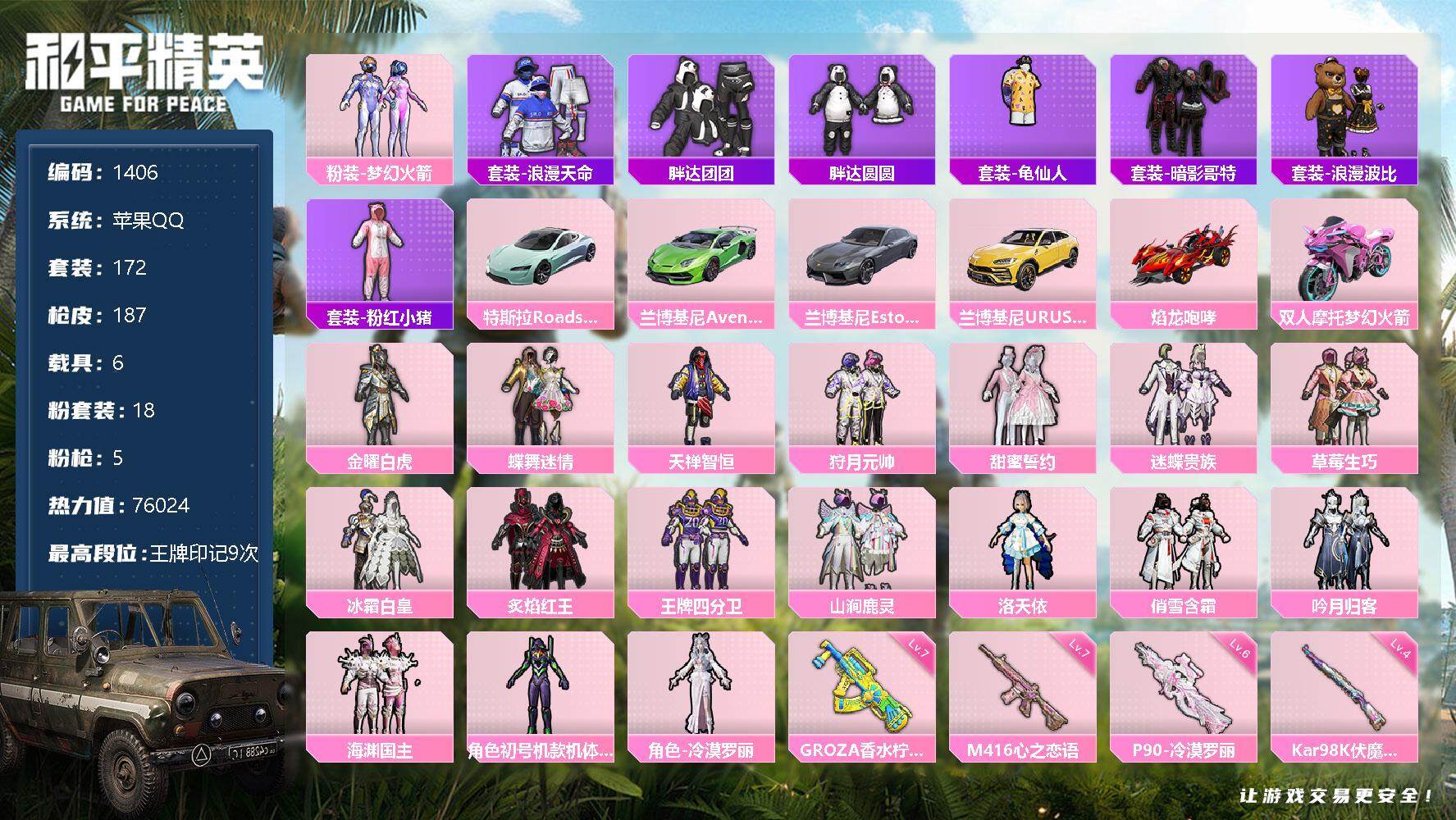 [13152579]苹果 手Q-18粉装-5特效枪-6载具-1粉色飞行器-76024热力值-9王牌印记-172套装-187枪皮 【热门品类】:粉装-梦幻火箭,套装-浪漫天命,套装-胖达团团,套装-胖达圆圆,套装-龟仙人,套装-暗影哥特,套装-浪漫波比,套装-粉红小猪 【粉色载具】:特斯拉Roadster(水滴蓝),兰博基尼Aventador SVJ(翡翠绿),兰博基尼Estoque(银翼灰),兰博基尼URUS(明艳黄),焰龙咆哮,双人摩托-梦幻火箭 【粉色套装】:粉装-金曜白虎,粉装-蝶舞迷情,粉装-梦幻火箭,粉装-天禅智恒,粉装-狩月元帅,粉装-甜蜜誓约,粉装-迷蝶贵族,粉装-草莓生巧,粉装-冰霜白皇,粉装-炙焰红王,粉装-王牌四分卫,粉装-山涧鹿灵,角色-洛天依,粉装-俏雪含霜,粉装-吟月归客,粉装-海渊国主,角色-初号机款机体服,角色-冷漠罗丽 【粉色枪皮等级】:M416-心之恋语(七级),GROZA-香水柠檬(七级),P90-冷漠罗丽(六级),Kar98K-伏魔团(四级),DP-28-豹影疾电(一级) 【粉色枪皮】:M416-心之恋语,GROZA-香水柠檬,P90-冷漠罗丽,Kar98K-伏魔团,DP-28-豹影疾电 【粉色飞行器】:梦幻火箭飞行器 【粉色降落伞】:百万伏特降落伞,春暖花开降落伞,梦幻火箭降落伞,古堡领主降落伞,繁花小夜曲降落伞,甜蜜誓约降落伞,四圣焕新降落伞,诡面斩降落伞,银刃赛罗降落伞,童趣迷兔降落伞,香水柠檬降落伞,暗夜玫瑰降落伞,林间仙鹿降落伞,齐天大圣降落伞,洛神天依降落伞,海渊国主降落伞,蓝莓炮弹降落伞,冷漠罗丽降落伞,荧海星豚降落伞 【稀有套装】:套装-龟仙人,套装-萝兰蝴蝶,套装-云朵鹅,套装-雪绒豹,角色-时希公主,角色-灵公主,角色-乐音,套装-蜜露汐语 【稀有枪皮】:AKM-夜灯,AKM-奇异狩猎者,AKM-山经魅狐,AKM-春暖花开,AKM-灼热熔岩,AKM-玉龙,AKM-萌趣颜团子,AKM-虎虎生威,AKM-锦绣火鲤,AKM-霓虹街区,AKM-龙的传人,M16A4-凝视深渊,M16A4-幻世战舞者,M16A4-机械英豪,SCAR-L-暗夜玫瑰,SCAR-L-炫彩节奏,SCAR-L-玉兔迎春,SCAR-L-甜蜜誓约,SCAR-L-红色方程式,SCAR-L-冷漠罗丽,M416-动感兔斯基,M416-夜灯,M416-糯团青竹,M416-红色