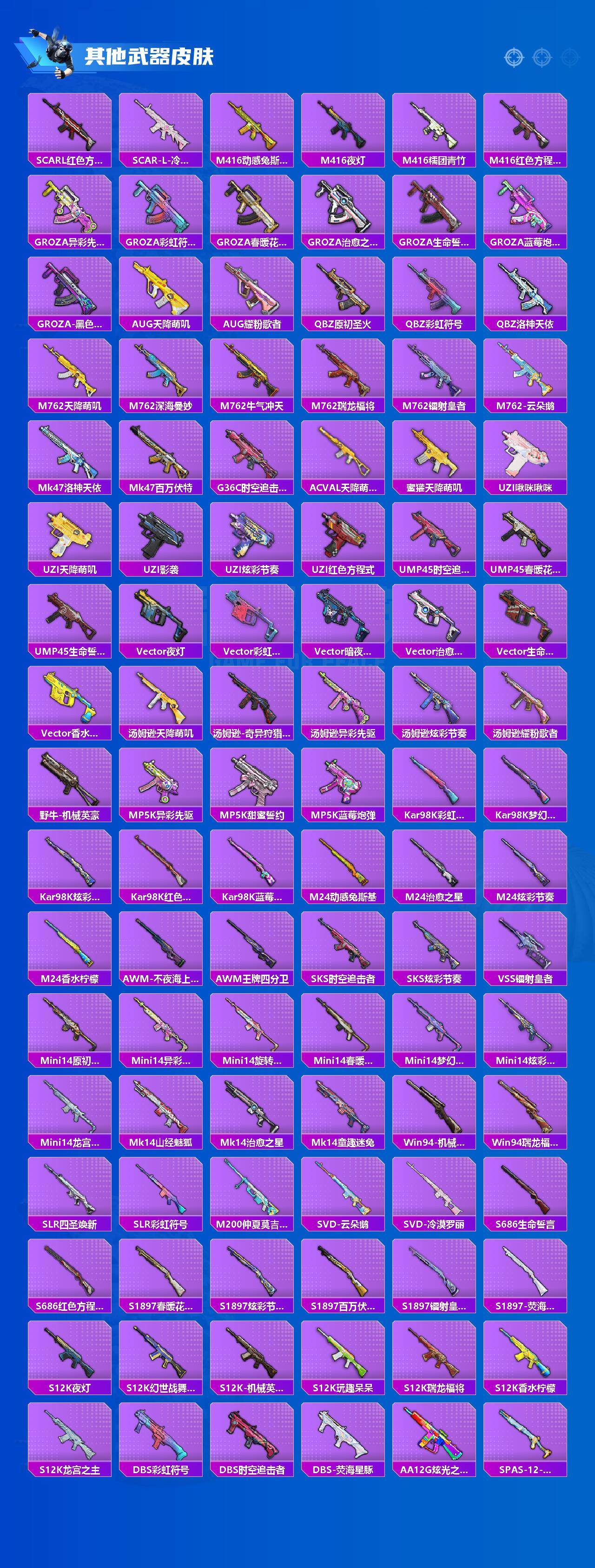 【稀有枪皮】:AKM-夜灯,AKM-奇异狩猎者,AKM-山经魅狐,AKM-春暖花开,AKM-灼热熔岩,AKM-玉龙,AKM-萌趣颜团子,AKM-虎虎生威,AKM-锦绣火鲤,AKM-霓虹街区,AKM-龙的传人,M16A4-凝视深渊,M16A4-幻世战舞者,M16A4-机械英豪,SCAR-L-暗夜玫瑰,SCAR-L-炫彩节奏,SCAR-L-玉兔迎春,SCAR-L-甜蜜誓约,SCAR-L-红色方程式,SCAR-L-冷漠罗丽,M416-动感兔斯基,M416-夜灯,M416-糯团青竹,M416-红色