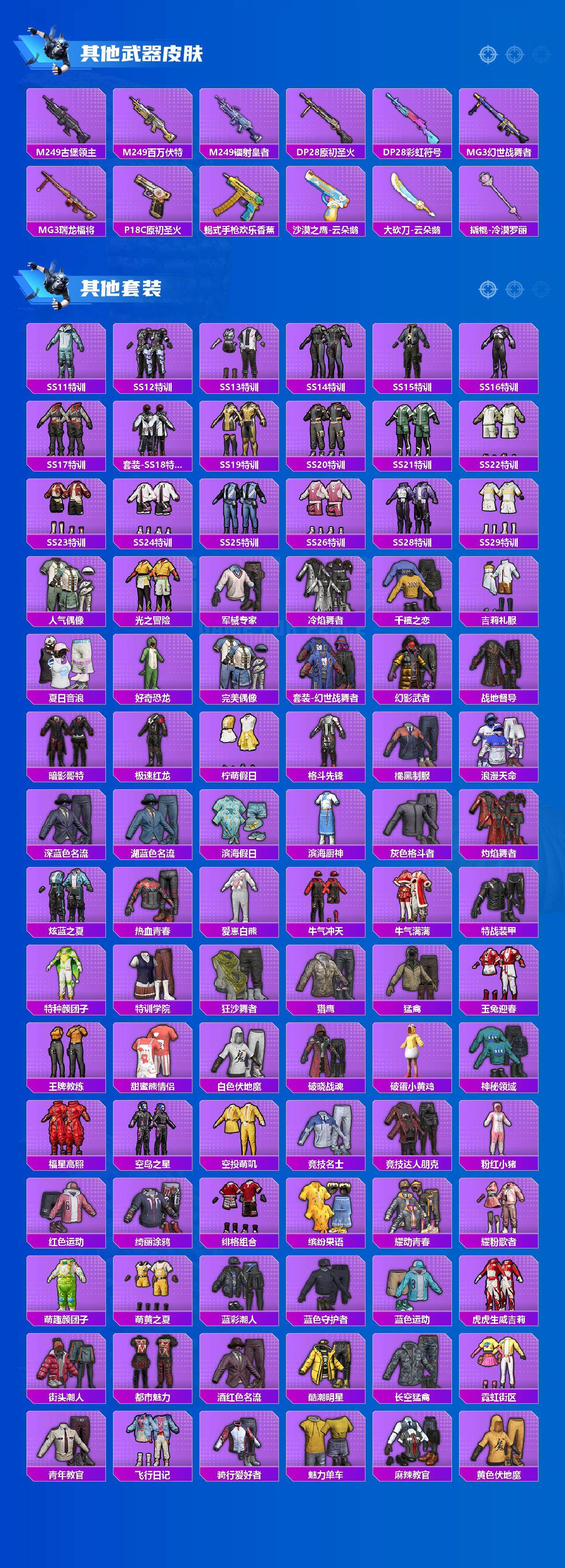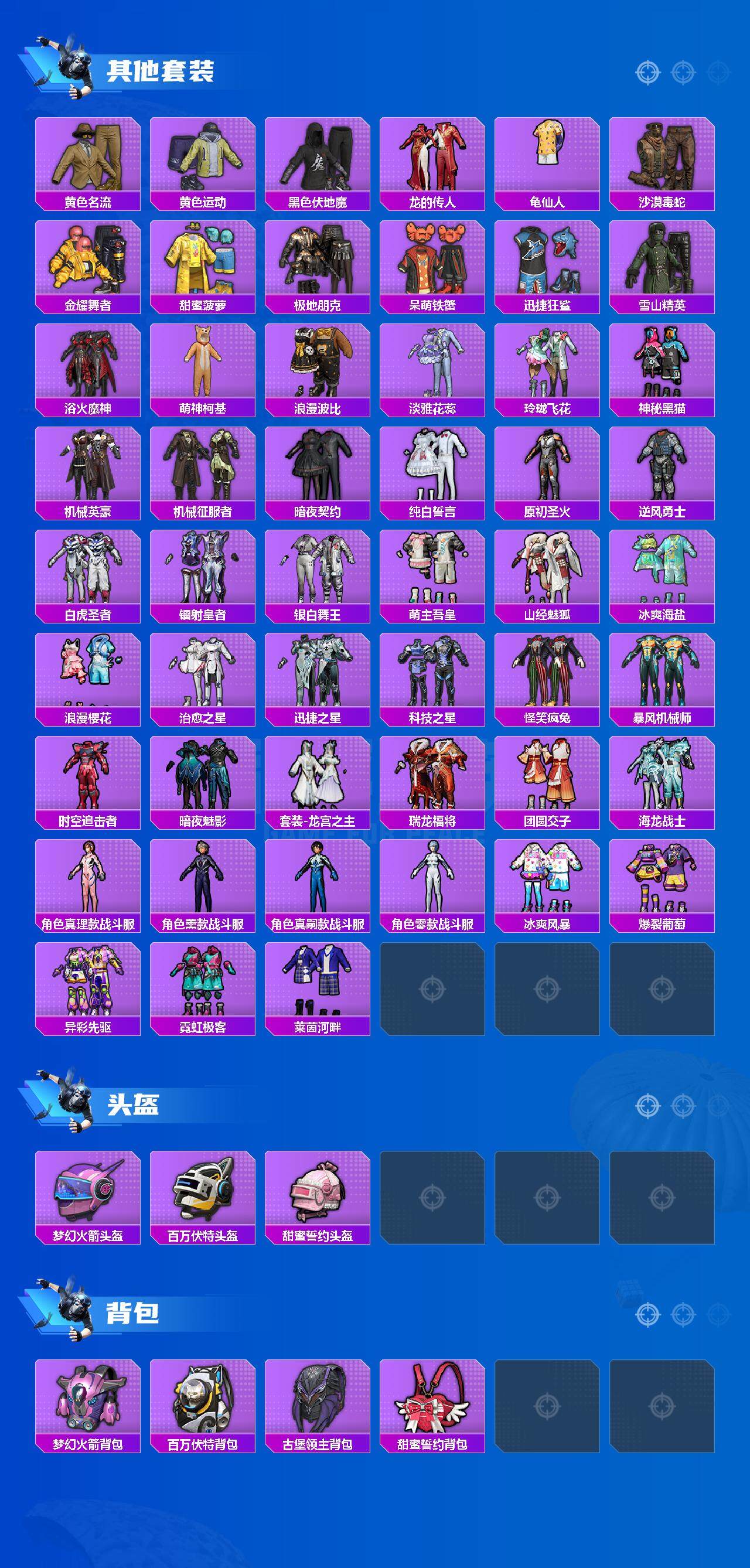 套装-浪漫天命,套装-龟仙人,套装-暗影哥特,套装-粉红小猪,套装-极速红龙,套装-狂沙舞者,套装-破蛋小黄鸡,套装-雪山精英,套装-机械英豪,套装-暗夜契约,套装-纯白誓言,套装-白虎圣者,套装-山经魅狐,套装-冰爽海盐,套装-怪笑疯兔,套装-瑞龙福将,套装-团圆交子