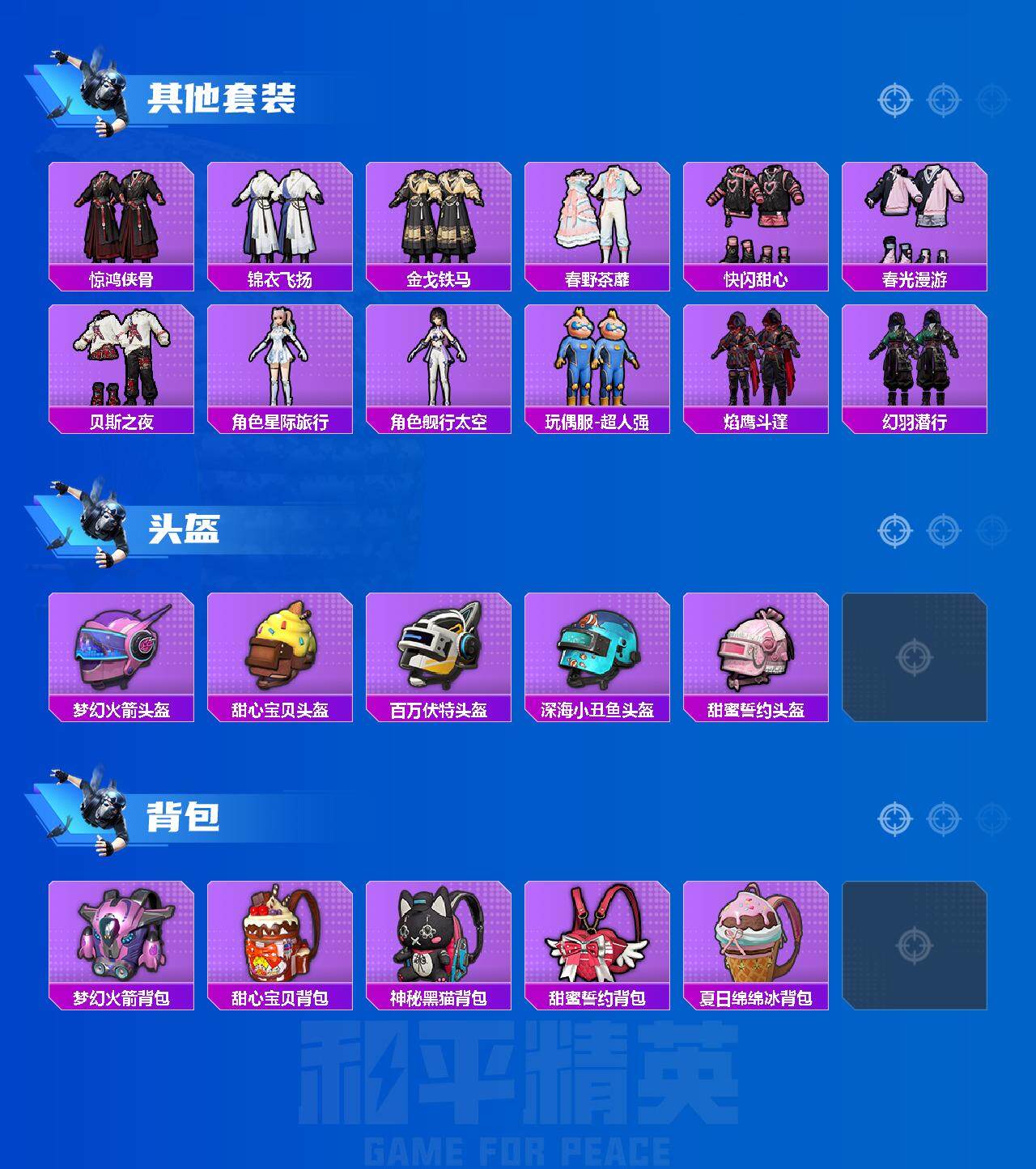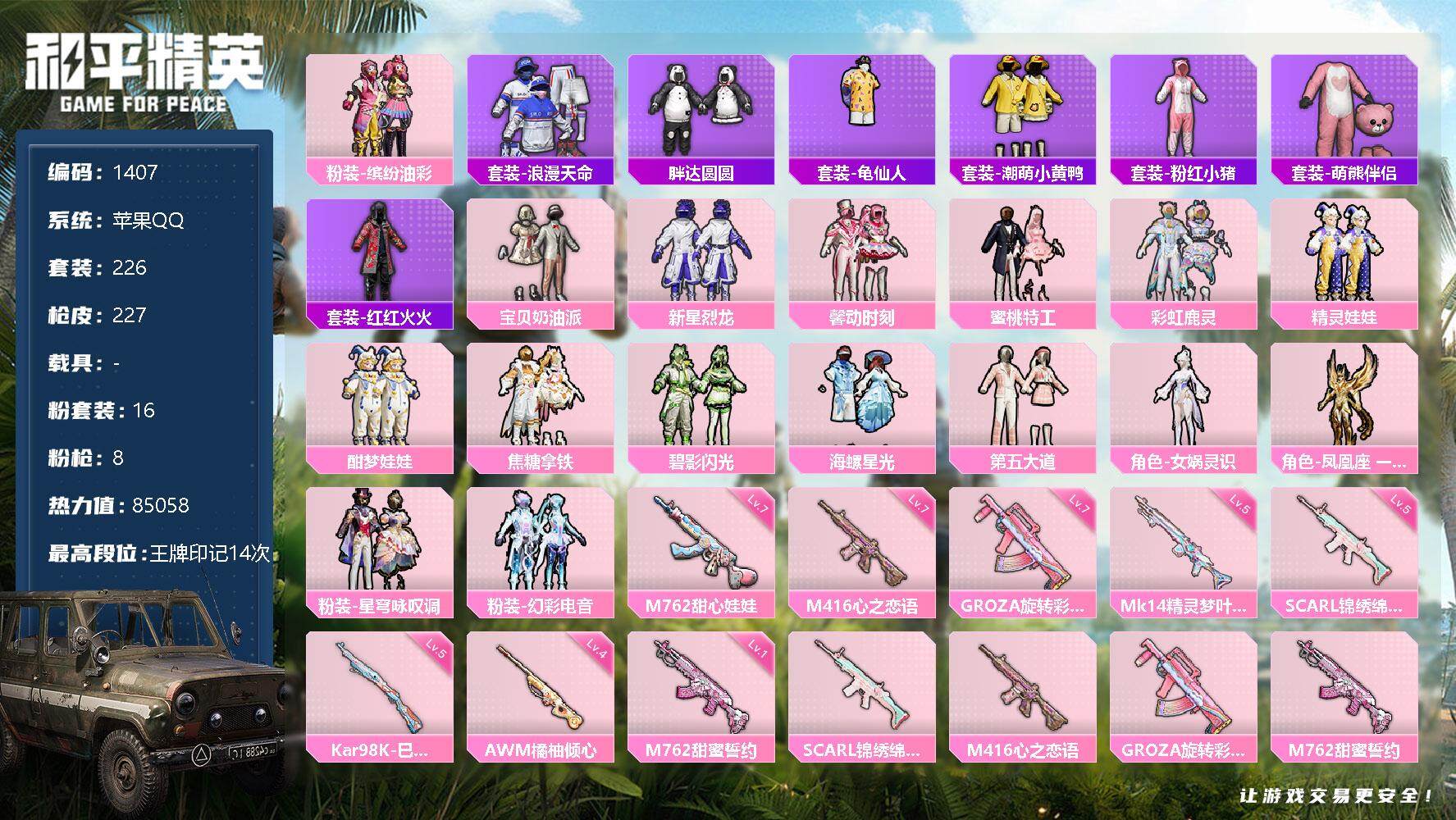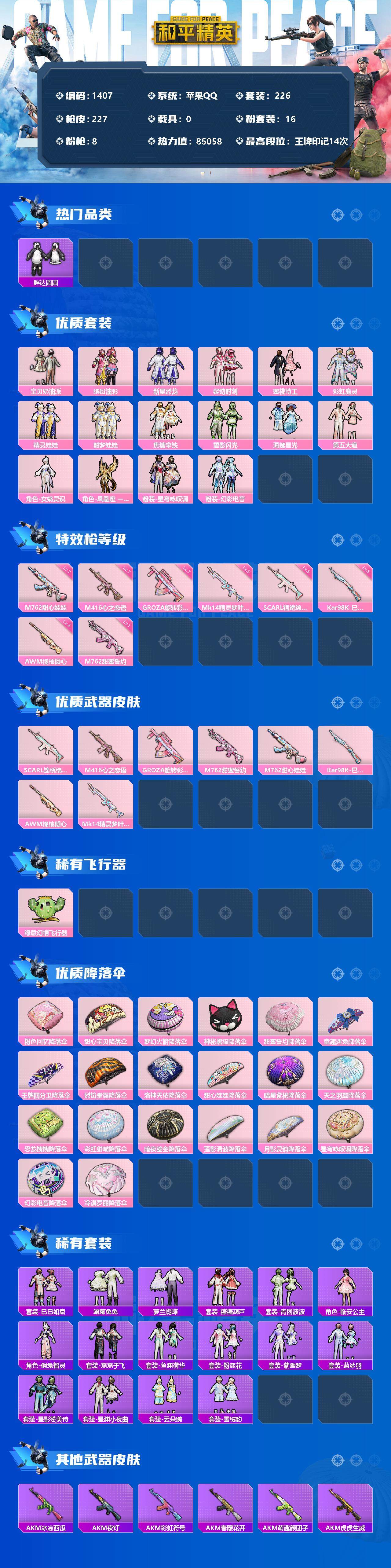[13152661]苹果 手Q-16粉装-8特效枪-0载具-1粉色飞行器-85058热力值-14王牌印记-226套装-227枪皮 【热门品类】:粉装-缤纷油彩,套装-浪漫天命,套装-胖达圆圆,套装-龟仙人,套装-潮萌小黄鸭,套装-粉红小猪,套装-萌熊伴侣,套装-红红火火 【粉色套装】:粉装-宝贝奶油派,粉装-缤纷油彩,粉装-新星烈龙,粉装-馨动时刻,粉装-蜜桃特工,粉装-彩虹鹿灵,粉装-精灵娃娃,粉装-酣梦娃娃,粉装-焦糖拿铁,粉装-碧影闪光,粉装-海螺星光,粉装-第五大道,角色-女娲灵识,角色-凤凰座 一辉,粉装-星穹咏叹调,粉装-幻彩电音 【粉色枪皮等级】:SCAR-L-锦绣绵绵(五级),M416-心之恋语(七级),GROZA-旋转彩虹(七级),M762-甜蜜誓约(一级),M762-甜心娃娃(七级),Kar98K-巳巳如意(五级),AWM-橘柚倾心(四级),Mk14-精灵梦叶罗丽(五级) 【粉色枪皮】:SCAR-L-锦绣绵绵,M416-心之恋语,GROZA-旋转彩虹,M762-甜蜜誓约,M762-甜心娃娃,Kar98K-巳巳如意,AWM-橘柚倾心,Mk14-精灵梦叶罗丽 【粉色飞行器】:绿意幻情飞行器 【粉色降落伞】:粉色回忆降落伞,甜心宝贝降落伞,梦幻火箭降落伞,神秘黑猫降落伞,甜蜜誓约降落伞,童趣迷兔降落伞,王牌四分卫降落伞,烈焰拳霸降落伞,洛神天依降落伞,甜心娃娃降落伞,暗星紫秘降落伞,天之羽翼降落伞,恐龙拽拽降落伞,彩虹甜喵降落伞,暗夜鎏金降落伞,莲影清波降落伞,月影灵韵降落伞,星穹咏叹调降落伞,幻彩电音降落伞,冷漠罗丽降落伞 【稀有套装】:套装-龟仙人,套装-巳巳如意,套装-雏菊兔兔,套装-萝兰蝴蝶,套装-糖糖葫芦,套装-青团波波,角色-临安公主,角色-俏兔智灵,套装-燕燕于飞,套装-鱼渊荷华,套装-粉恋花,套装-紫幽梦,套装-蓝冰羽,套装-星影赞美诗,套装-星渊小夜曲,套装-云朵鹅,套装-雪绒豹 【稀有枪皮】:AKM-冰凉西瓜,AKM-夜灯,AKM-彩虹符号,AKM-春暖花开,AKM-萌趣颜团子,AKM-虎虎生威,AKM-霓虹街区,AKM-龙的传人,M16A4-夜灯,M16A4-幻世战舞者,M16A4-莲影清波,SCAR-L-炫彩节奏,SCAR-L-玉兔迎春,SCAR-L-甜蜜誓约,M416-糯团青竹,M416-红色方程式,M416-蓝色火焰,GROZA-异彩先驱,G