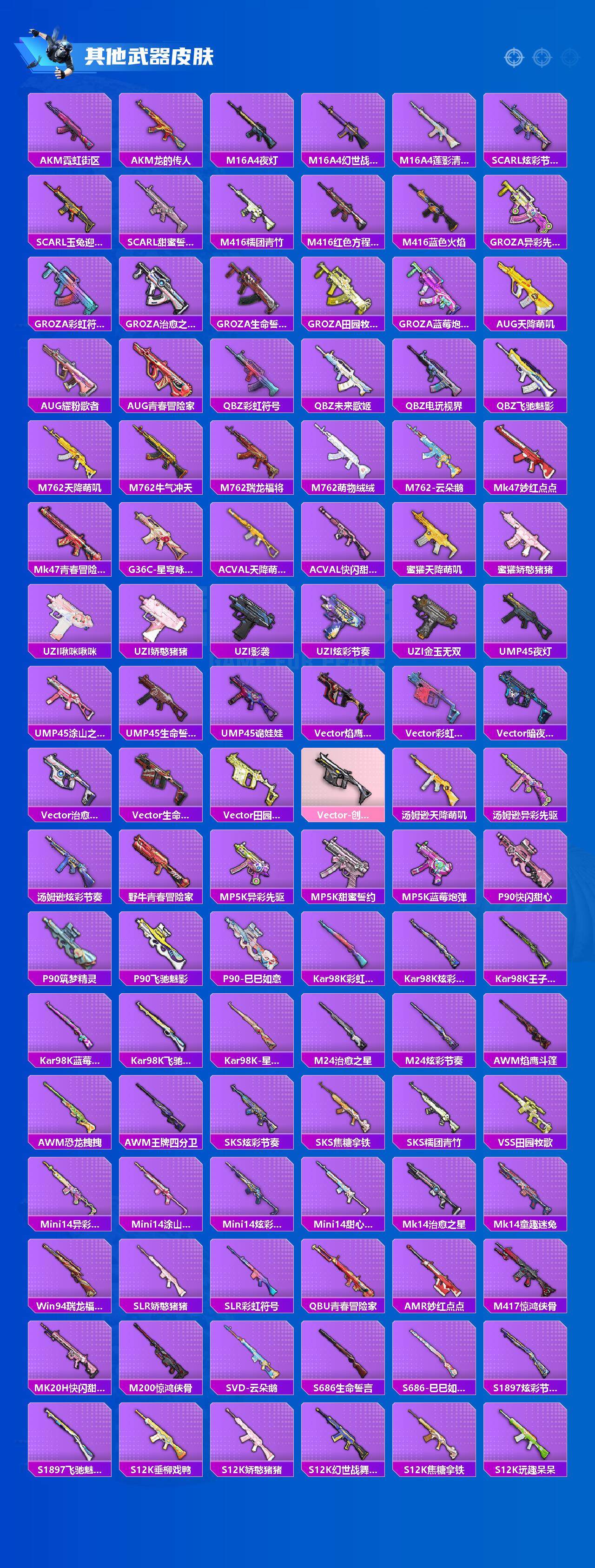 【稀有枪皮】:AKM-冰凉西瓜,AKM-夜灯,AKM-彩虹符号,AKM-春暖花开,AKM-萌趣颜团子,AKM-虎虎生威,AKM-霓虹街区,AKM-龙的传人,M16A4-夜灯,M16A4-幻世战舞者,M16A4-莲影清波,SCAR-L-炫彩节奏,SCAR-L-玉兔迎春,SCAR-L-甜蜜誓约,M416-糯团青竹,M416-红色方程式,M416-蓝色火焰,GROZA-异彩先驱,G