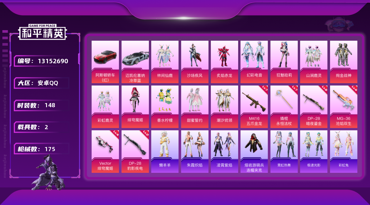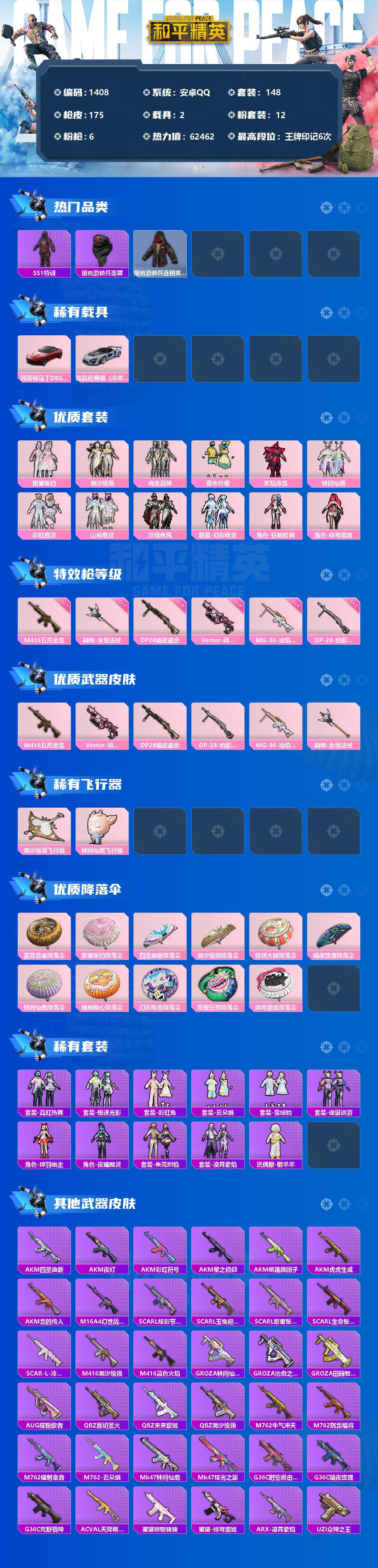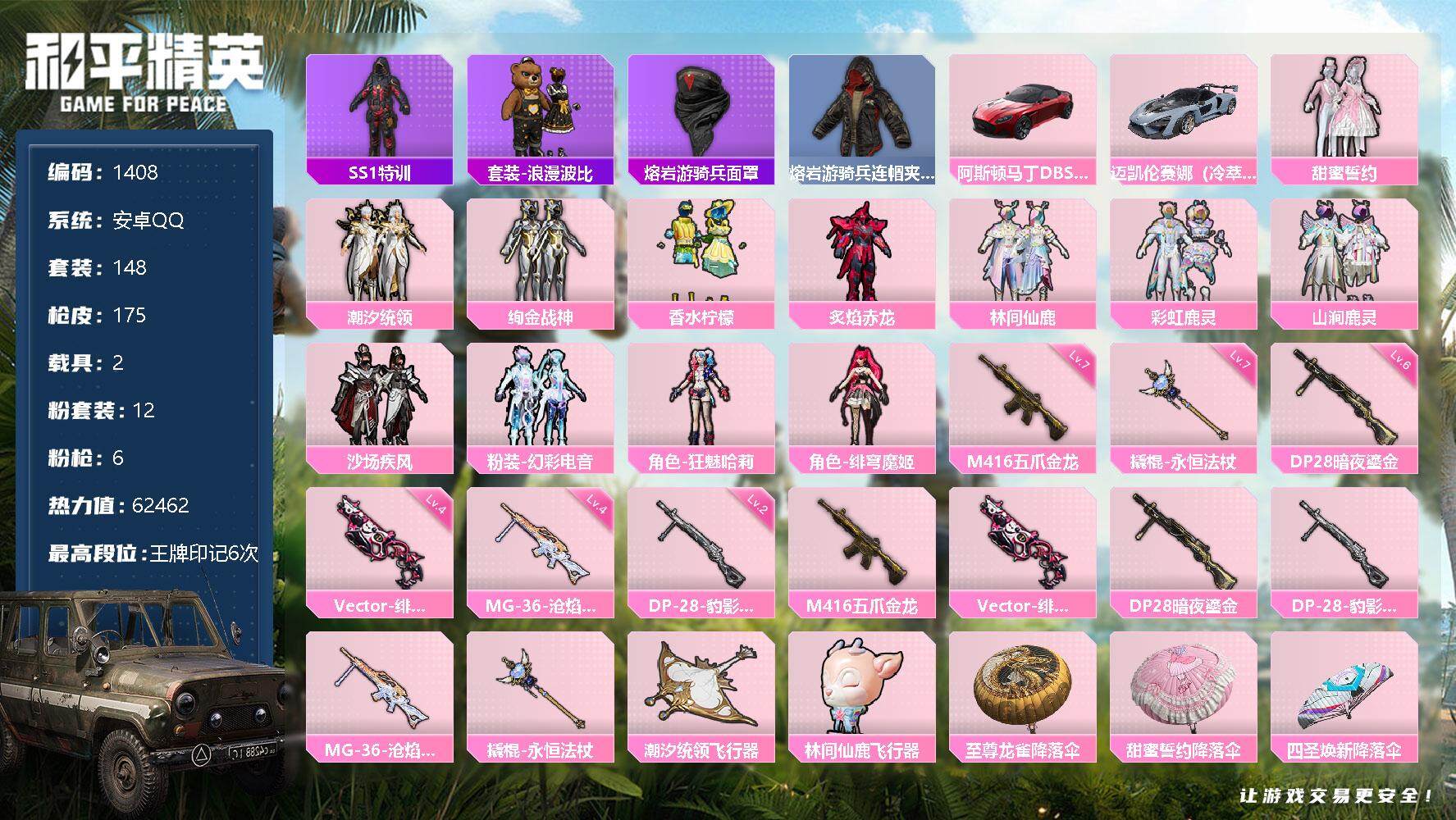 [13152690]安卓 手Q-12粉装-6特效枪-2载具-2粉色飞行器-62462热力值-6王牌印记-148套装-175枪皮