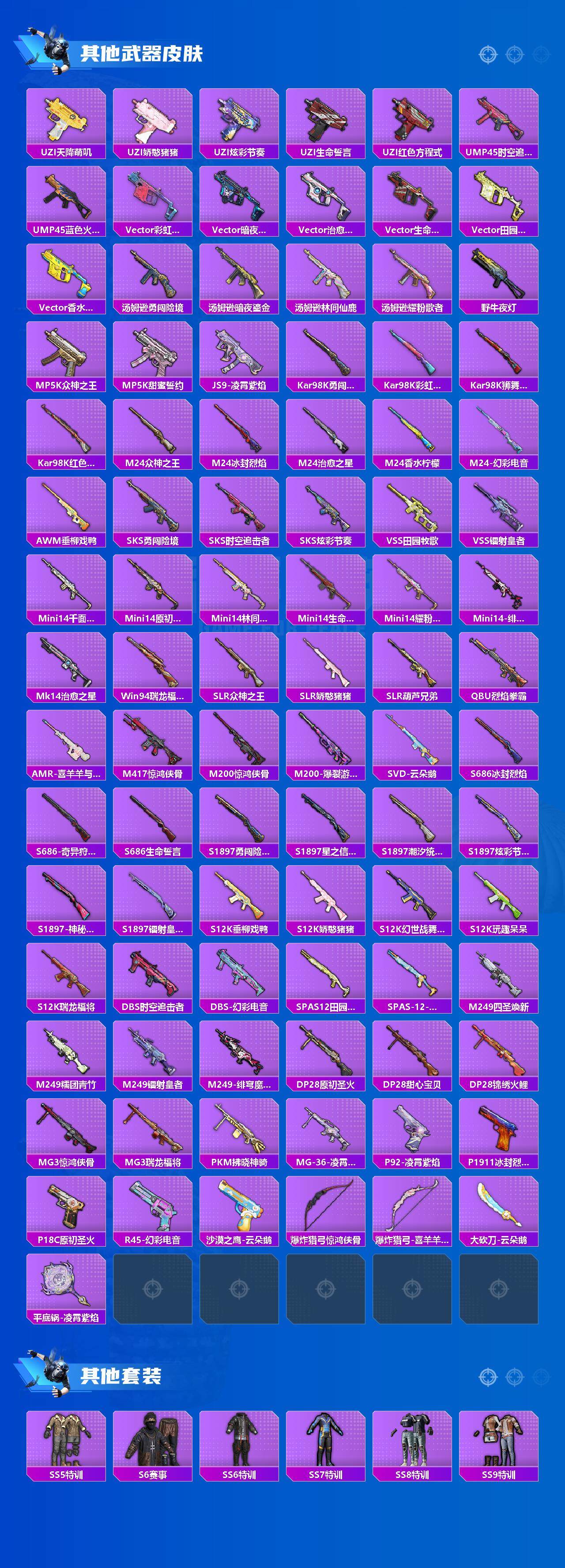 【稀有枪皮】:AKM-四圣焕新,AKM-夜灯,AKM-彩虹符号,AKM-星之信仰,AKM-萌趣颜团子,AKM-虎虎生威,AKM-龙的传人,M16A4-幻世战舞者,SCAR-L-炫彩节奏,SCAR-L-玉兔迎春,SCAR-L-甜蜜誓约,SCAR-L-生命誓言,SCAR-L-冷漠罗丽,M416-潮汐统领,M416-蓝色火焰,GROZA-林间仙鹿,GROZA-治愈之星,GROZA-田园牧歌,AUG-耀粉歌者,QBZ-原初圣火,QBZ-未来歌姬,QBZ-潮汐统领,M762-牛气冲天,M762-瑞龙福将,M762-镭射皇者,M762-云朵鹅,Mk47-林间仙鹿,Mk47-炫光之旅,G36C-时空追击者,G36C-暗夜玫瑰,G36C-荒野猎神,AC-VAL-天降萌叽,蜜獾-娇憨猪猪,蜜獾-绯穹魔姬,ARX-凌霄紫焰,UZI-众神之王,UZI-天降萌叽,UZI-娇憨猪猪,UZI-炫彩节奏