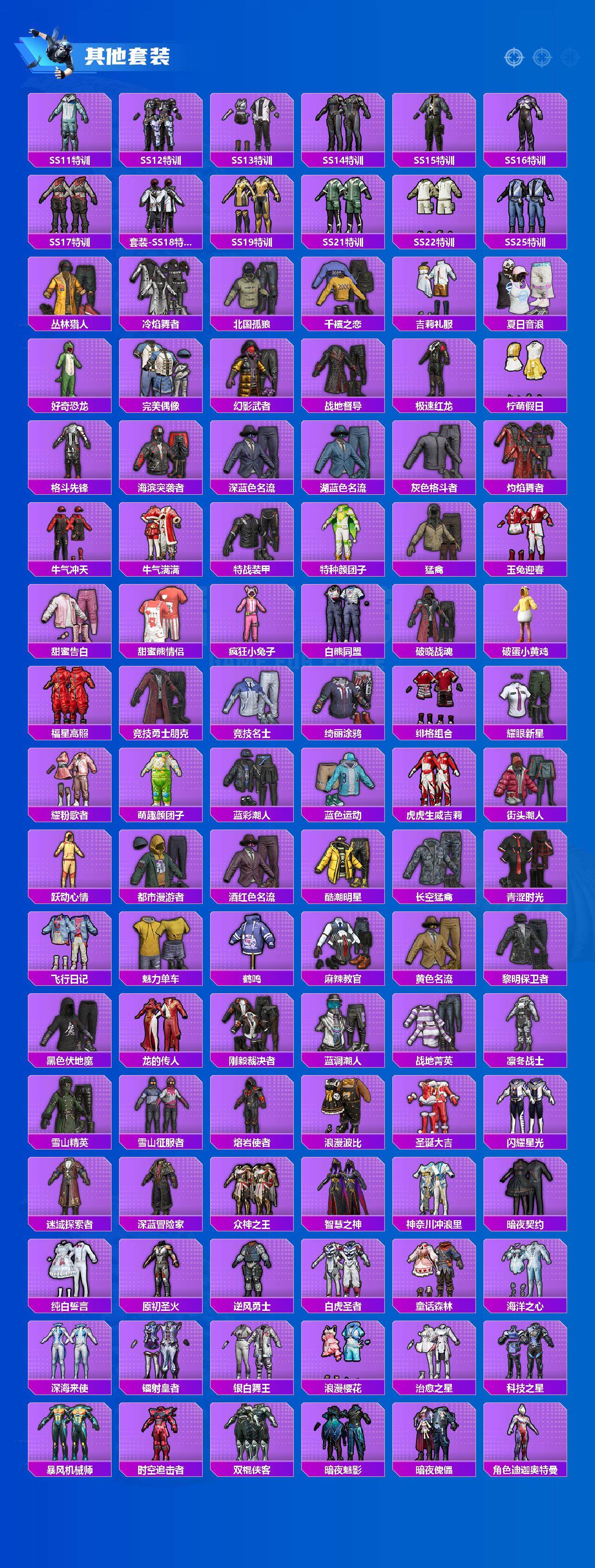 套装-极速红龙,套装-破蛋小黄鸡,套装-雪山精英,套装-暗夜契约,套装-纯白誓言,套装-白虎圣者,套装-童话森林,海洋之心套装,角色-迪迦奥特曼,套装-瑞龙福将,套装-团圆交子