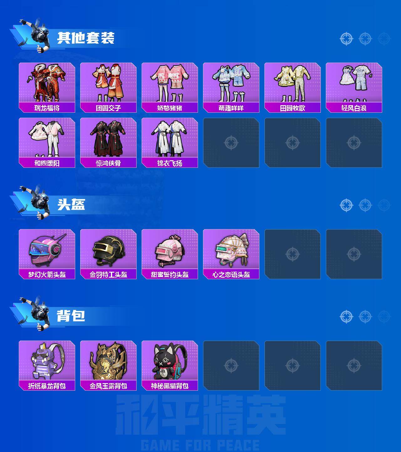 - [9854097]实名: 可修改 时装数: 196 枪械数: 65 战备数: 43 热门装扮: 宝贝奶油派,天使彩虹糖,橘柚倾心,暗夜魅影 稀有枪皮: M416风花雪月,GROZA-镜光银凌,Kar98K-巳巳如意,AUG-暖羊咩咩,MK14-甜梦熊击