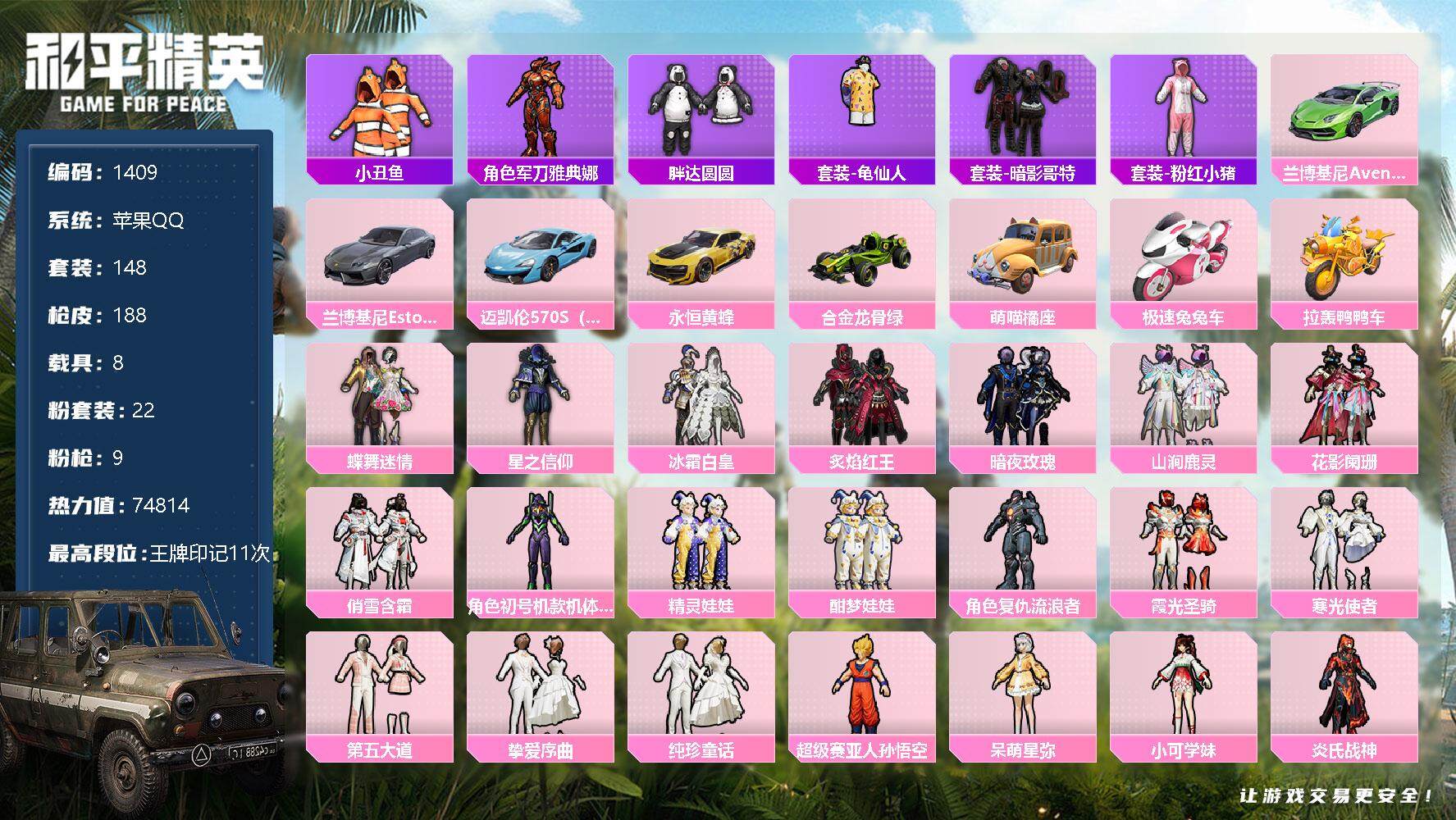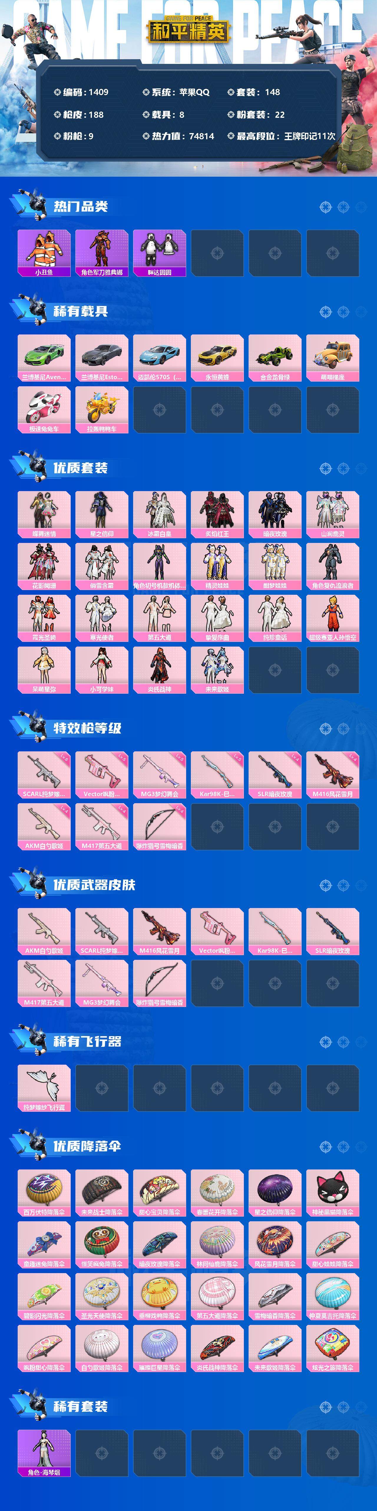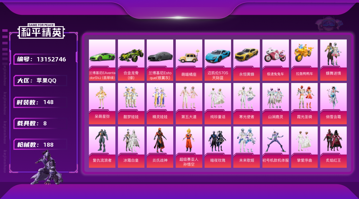 [13152746]苹果 手Q-22粉装-9特效枪-8载具-2粉色飞行器-74814热力值-11王牌印记-148套装-188枪皮 【热门品类】:套装-小丑鱼,角色-军刀雅典娜,套装-胖达圆圆,套装-龟仙人,套装-暗影哥特,套装-粉红小猪 【粉色载具】:兰博基尼Aventador SVJ(翡翠绿),兰博基尼Estoque(银翼灰),迈凯伦570S(天际蓝),永恒黄蜂,合金龙骨(绿),萌喵橘座,极速兔兔车,拉轰鸭鸭车 【粉色套装】:粉装-蝶舞迷情,粉装-星之信仰,粉装-冰霜白皇,粉装-炙焰红王,粉装-暗夜玫瑰,粉装-山涧鹿灵,粉装-花影阑珊,粉装-俏雪含霜,角色-初号机款机体服,粉装-精灵娃娃,粉装-酣梦娃娃,角色-复仇流浪者,粉装-霞光圣骑,粉装-寒光使者,粉装-第五大道,粉装-挚爱序曲,粉装-纯珍童话,超级赛亚人-孙悟空,角色-呆萌星弥,角色-小可学妹,粉装-炎氏战神,粉装-未来歌姬 【粉色枪皮等级】:AKM-白勺歌姬(四级),SCAR-L-纯梦嫁纱(六级),M416-风花雪月(四级),Vector-飒粉甜心(五级),Kar98K-巳巳如意(五级),SLR-暗夜玫瑰(四级),M417-第五大道(四级),MG3-梦幻舞会(五级),爆炸猎弓-雪梅暗香(四级) 【粉色枪皮】:AKM-白勺歌姬,SCAR-L-纯梦嫁纱,M416-风花雪月,Vector-飒粉甜心,Kar98K-巳巳如意,SLR-暗夜玫瑰,M417-第五大道,MG3-梦幻舞会,爆炸猎弓-雪梅暗香 【粉色飞行器】:纯梦嫁纱飞行翼 【粉色降落伞】:百万伏特降落伞,未来战士降落伞,甜心宝贝降落伞,春暖花开降落伞,星之信仰降落伞,神秘黑猫降落伞,童趣迷兔降落伞,怪笑疯兔降落伞,暗夜玫瑰降落伞,林间仙鹿降落伞,风花雪月降落伞,甜心娃娃降落伞,碧影闪光降落伞,圣光天使降落伞,垂柳戏鸭降落伞,第五大道降落伞,雪梅暗香降落伞,仲夏莫吉托降落伞,飒粉甜心降落伞,白勺歌姬降落伞,璀璨巨星降落伞,炎氏战神降落伞,未来歌姬降落伞,炫光之旅降落伞 【稀有套装】:套装-龟仙人,角色-海琴烟 【稀有枪皮】:AKM-彩虹符号,AKM-星之信仰,AKM-春暖花开,AKM-缤纷海域,AKM-胡桃卫兵,AKM-虎虎生威,AKM-龙的传人,M16A4-幻世战舞者,M16A4-甜心亚梦,M16A4-红色方程式,SCAR-L-炫彩节奏,SCAR-L-玉兔迎春,SCAR-L