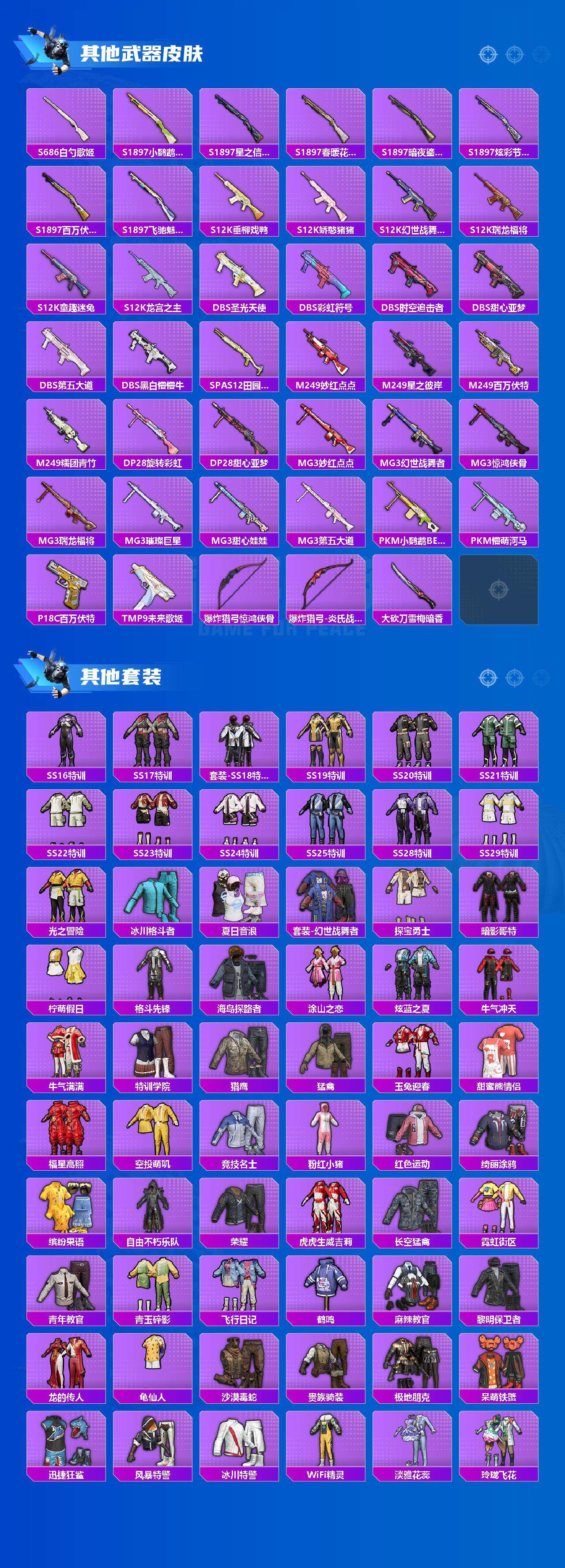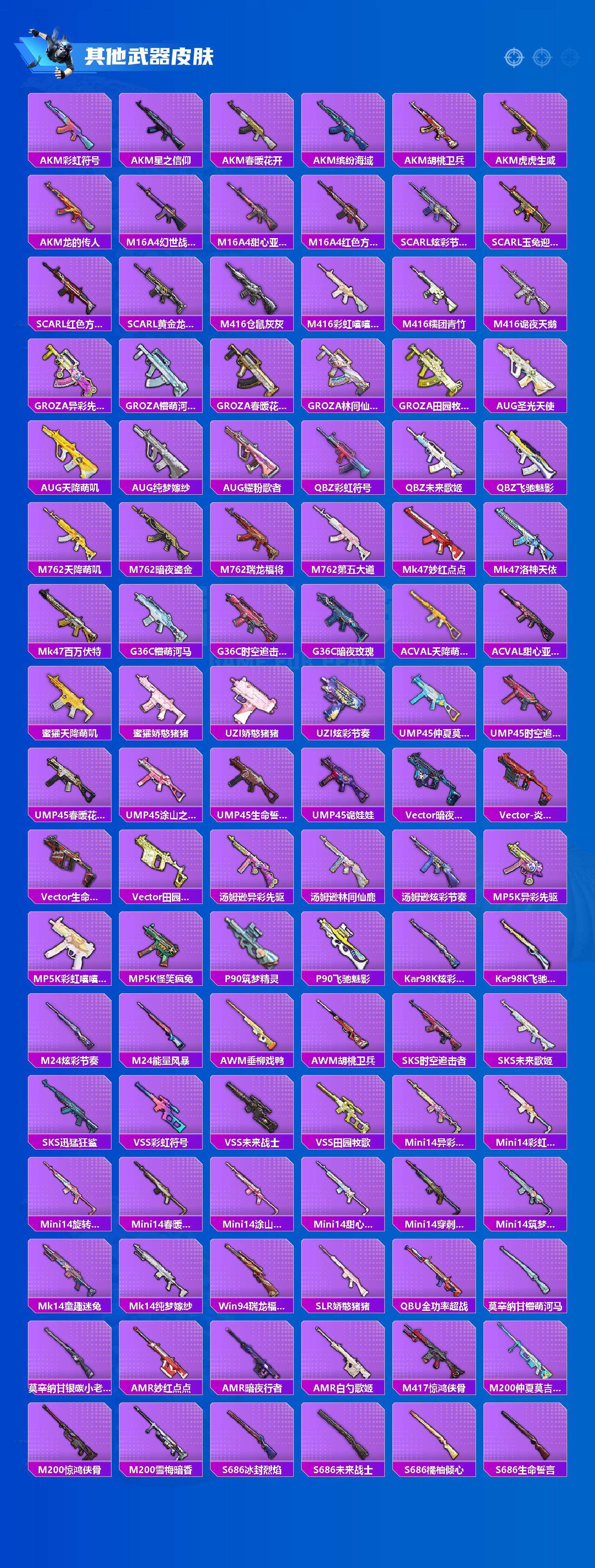 AKM-白勺歌姬,SCAR-L-纯梦嫁纱,M416-风花雪月,Vector-飒粉甜心,Kar98K-巳巳如意,SLR-暗夜玫瑰,M417-第五大道,MG3-梦幻舞会,爆炸猎弓-雪梅暗香