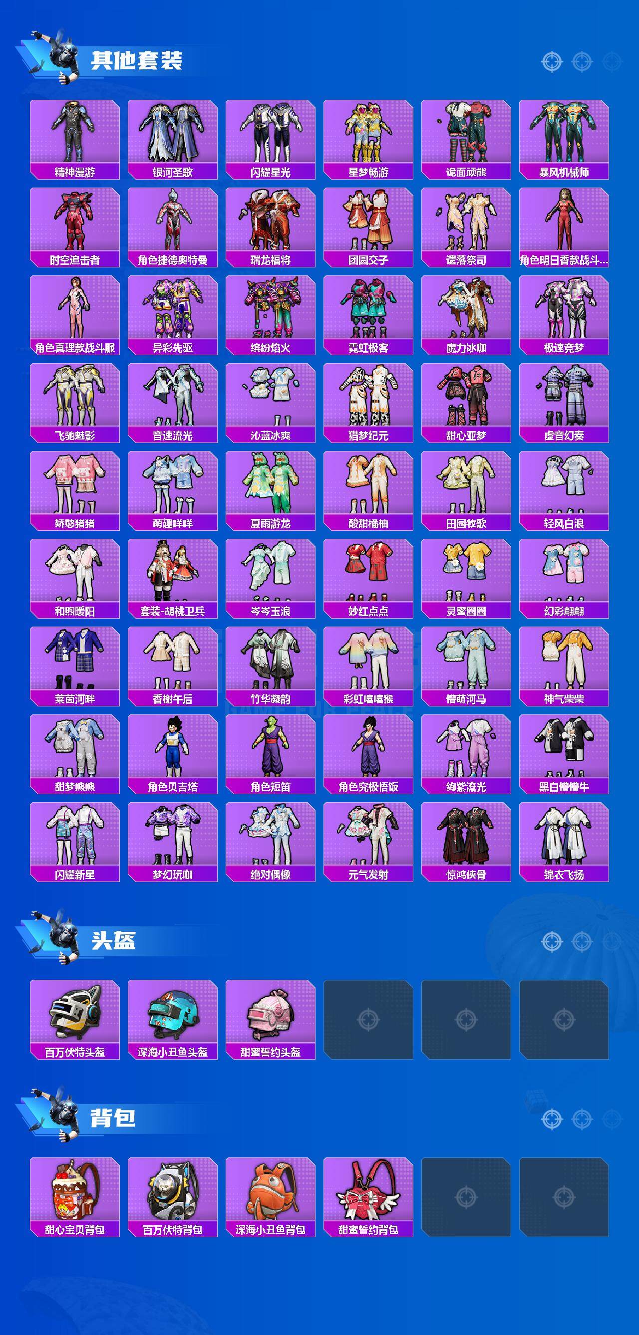 【粉色套装】:粉装-蝶舞迷情,粉装-星之信仰,粉装-冰霜白皇,粉装-炙焰红王,粉装-暗夜玫瑰,粉装-山涧鹿灵,粉装-花影阑珊,粉装-俏雪含霜,角色-初号机款机体服,粉装-精灵娃娃,粉装-酣梦娃娃,角色-复仇流浪者,粉装-霞光圣骑,粉装-寒光使者,粉装-第五大道,粉装-挚爱序曲,粉装-纯珍童话,超级赛亚人-孙悟空,角色-呆萌星弥,角色-小可学妹,粉装-炎氏战神,粉装-未来歌姬