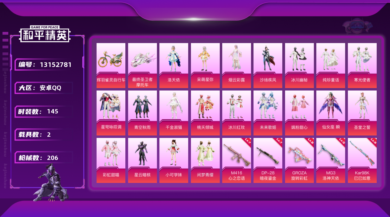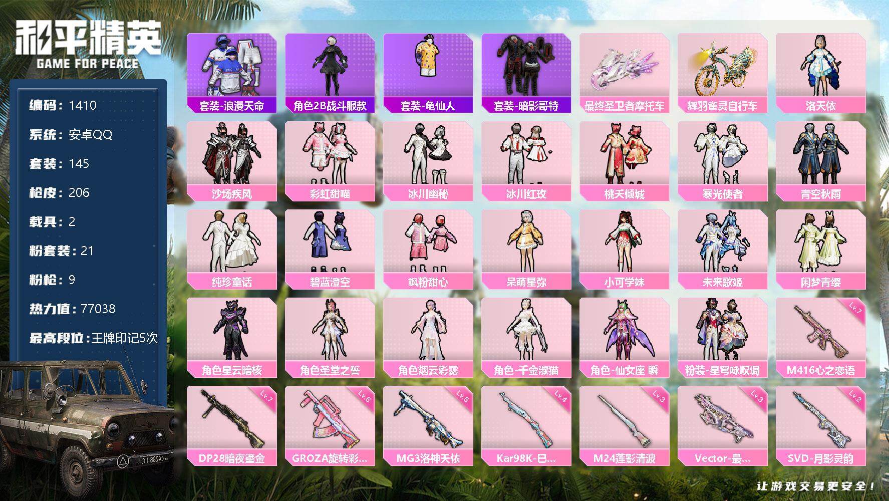 [13152781]安卓 手Q-21粉装-9特效枪-2载具-6粉色飞行器-77038热力值-5王牌印记-145套装-206枪皮