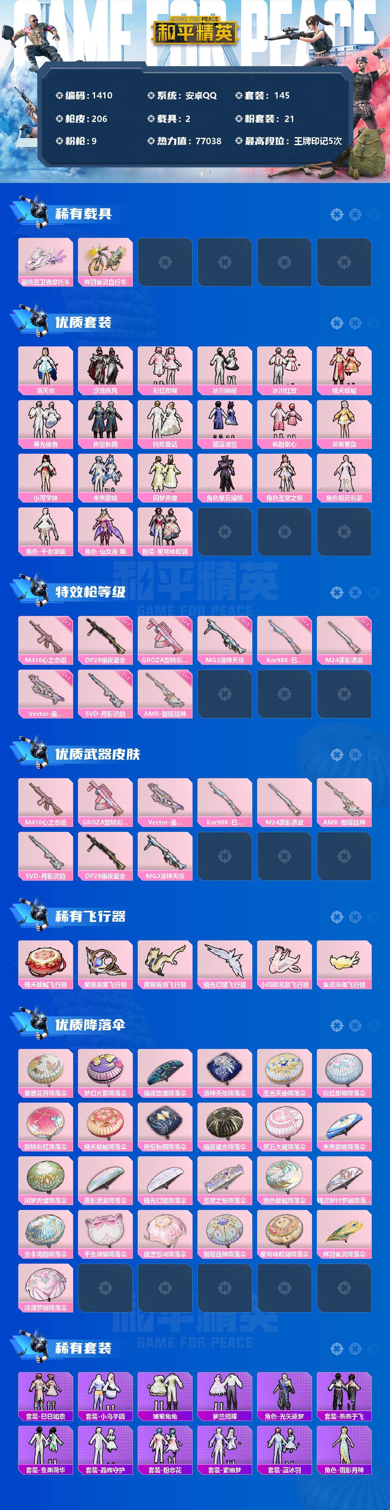 [13152781]安卓 手Q-21粉装-9特效枪-2载具-6粉色飞行器-77038热力值-5王牌印记-145套装-206枪皮 【热门品类】:套装-浪漫天命,角色-2B战斗服款,套装-龟仙人,套装-暗影哥特 【粉色载具】:最终圣卫者摩托车,辉羽雀灵自行车 【粉色套装】:角色-洛天依,粉装-沙场疾风,粉装-彩虹甜喵,粉装-冰川幽秘,粉装-冰川红玫,粉装-桃夭倾城,粉装-寒光使者,粉装-青空秋雨,粉装-纯珍童话,粉装-碧蓝澄空,粉装-飒粉甜心,角色-呆萌星弥,角色-小可学妹,粉装-未来歌姬,粉装-闲梦青缨,角色-星云暗核,角色-圣堂之誓,角色-烟云彩露,角色-千金淑猫,角色-仙女座 瞬,粉装-星穹咏叹调 【粉色枪皮等级】:M416-心之恋语(七级),GROZA-旋转彩虹(六级),Vector-最终圣卫者(三级),Kar98K-巳巳如意(四级),M24-莲影清波(三级),AMR-智耀战神(一级),SVD-月影灵韵(二级),DP-28-暗夜鎏金(七级),MG3-洛神天依(五级) 【粉色枪皮】:M416-心之恋语,GROZA-旋转彩虹,Vector-最终圣卫者,Kar98K-巳巳如意,M24-莲影清波,AMR-智耀战神,SVD-月影灵韵,DP-28-暗夜鎏金,MG3-洛神天依 【粉色飞行器】:桃夭倾城飞行器,星际浪客飞行器,黄族统领飞行器,镜光幻境飞行翼,小叽联名款飞行器,雀灵庇佑飞行器 【粉色降落伞】:春暖花开降落伞,梦幻火箭降落伞,暗夜玫瑰降落伞,洛神天依降落伞,圣光天使降落伞,彩虹甜喵降落伞,旋转彩虹降落伞,桃夭倾城降落伞,青空秋雨降落伞,暗夜鎏金降落伞,第五大道降落伞,未来歌姬降落伞,闲梦青缨降落伞,莲影清波降落伞,镜光幻境降落伞,圣堂之誓降落伞,绝色倾城降落伞,精灵梦叶罗丽降落伞,金丰海韵降落伞,千金淑猫降落伞,盛世惊鸿降落伞,智耀战神降落伞,星穹咏叹调降落伞,辉羽雀灵降落伞,冷漠罗丽降落伞 【稀有套装】:套装-龟仙人,套装-巳巳如意,套装-小鸟芋圆,套装-雏菊兔兔,套装-萝兰蝴蝶,角色-光矢逐梦,套装-燕燕于飞,套装-鱼渊荷华,套装-晶辉守护,套装-粉恋花,套装-紫幽梦,套装-蓝冰羽,角色-猎影月神,角色-瑰梦爱神,套装-星渊小夜曲,套装-霓虹热舞,套装-云朵鹅,套装-雪绒豹,角色-乐音 【稀有枪皮】:AKM-2P战斗服款,AKM-墨染幽兰,AKM-恐龙拽拽,AKM-春暖花开,AK