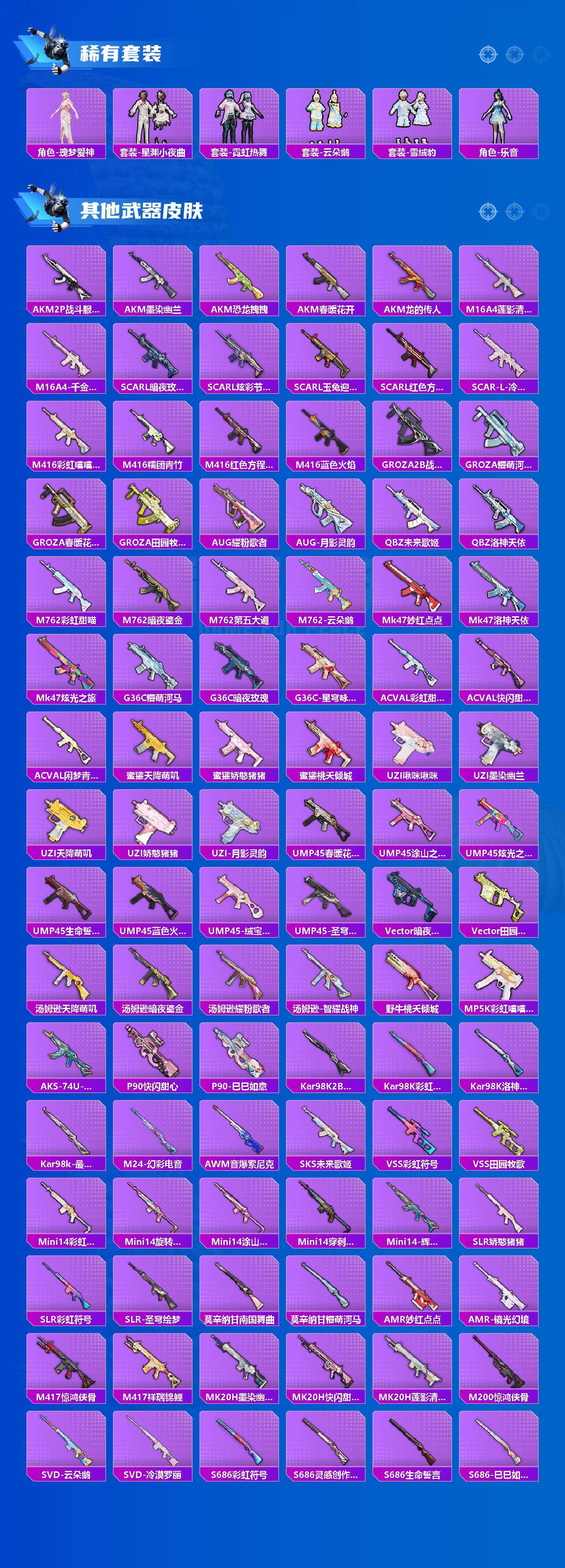【粉色枪皮】:M416-心之恋语,GROZA-旋转彩虹,Vector-最终圣卫者,Kar98K-巳巳如意,M24-莲影清波,AMR-智耀战神,SVD-月影灵韵,DP-28-暗夜鎏金,MG3-洛神天依