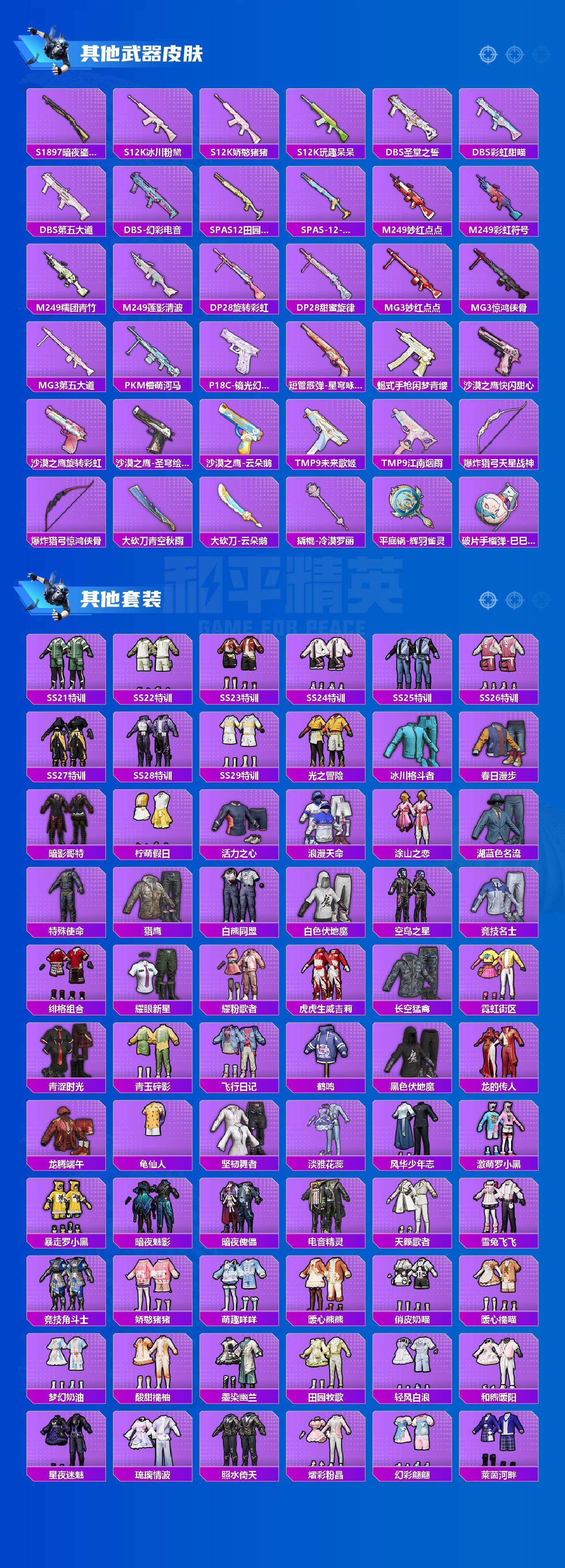 M416-心之恋语,GROZA-旋转彩虹,Kar98K-巳巳如意,M24-莲影清波,SVD-月影灵韵,DP-28-暗夜鎏金,MG3-洛神天依