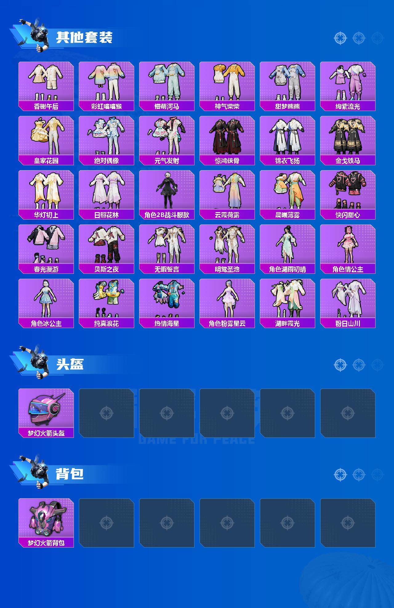 【粉色套装】:角色-洛天依,粉装-沙场疾风,粉装-彩虹甜喵,粉装-冰川幽秘,粉装-冰川红玫,粉装-桃夭倾城,粉装-寒光使者,粉装-青空秋雨,粉装-纯珍童话,粉装-碧蓝澄空,粉装-飒粉甜心,角色-呆萌星弥,角色-小可学妹,粉装-未来歌姬,粉装-闲梦青缨,角色-星云暗核,角色-圣堂之誓,角色-烟云彩露,角色-千金淑猫,角色-仙女座 瞬,粉装-星穹咏叹调