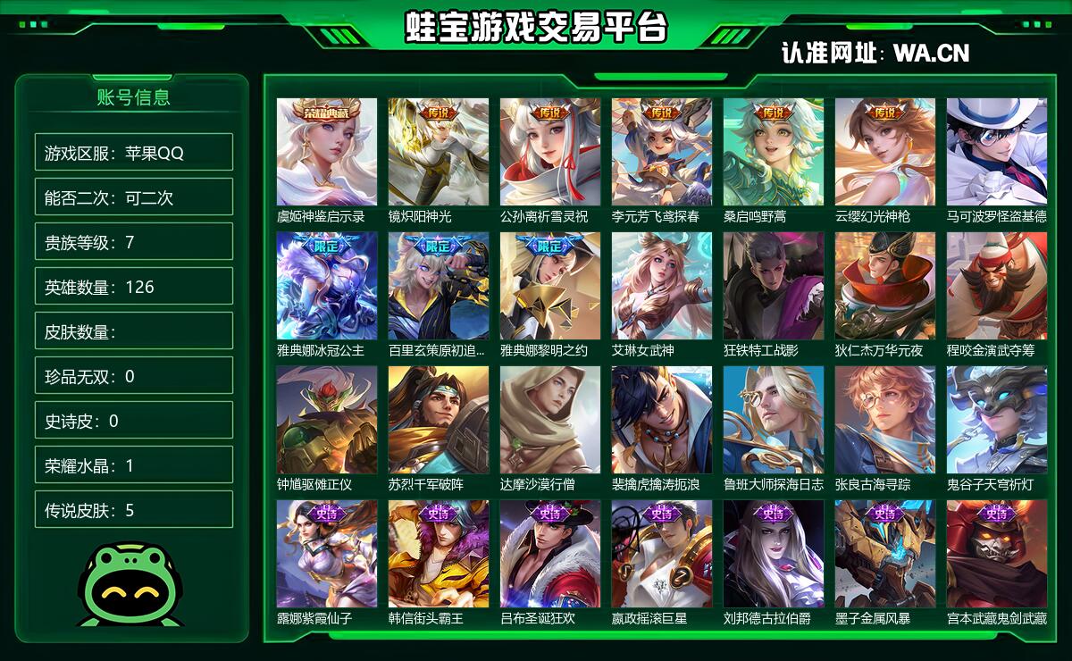 苹果QQ 可二次 贵族7 段位非凡王者 皮肤价值100180 英雄数量126 皮肤数量 荣耀水晶1 传说皮肤5 珍品1 限定皮肤3 无双皮肤0 内测2 赛季皮肤9 史诗皮肤18 普通皮肤14 其他205