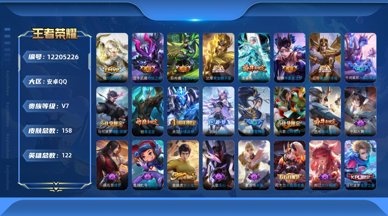 - [11883803]V7 1典藏 1珍品传说 11传说 124英雄 198皮肤 可修改实名 优质装备:神鉴启示录,器灵·落星盏,黄金狮子座,超时空战士-狄仁杰,浮生妄,百相守梦(张飞),霜月吟 珍宝阁皮:妄想食味 限定皮:愿照·岁时盈(虞姬年限),愿照·山河定(司空震年限),愿照·千秋盛(女娲年限),映山客,鸣野蒿,太华(伽罗年限),李小龙,寅虎·心曲(虎婆),神器·万象笔,山海·玄木吟(马可年限) 史诗皮:器灵·浮梦炉,化蝶舞,星界战将,龙之律动,石田雨龙,茶境仙,破空之剑,蒙犽顽岩魄,海诺心动手记,夜落电台,乘龙·聚宝船(安琪拉年限),百相守梦-黄忠,织梦人,遇见神鹿,特工魅影,真我赫兹(百里守约),闲日渔趣,蒙恬荣光圣徽,冰冠公主,偶像歌手,白蛇,电玩·兔顽号,电玩·爆裂旋风,银翎春语,龙骑士(小龙虾),末日机甲-吕布,猫狗日记-孙策,猫狗日记-大乔,乱世虎臣,摇滚巨星,水果甜心,时之奇旅-安琪拉,德古拉伯爵,幽灵船长,鬼剑武藏,心灵战警,乐园奇幻夜,舞动绿茵,乘风破浪,逐浪之夏,金属风暴,鹰眼统帅,魅力维加斯,滕王阁序,千筹问战