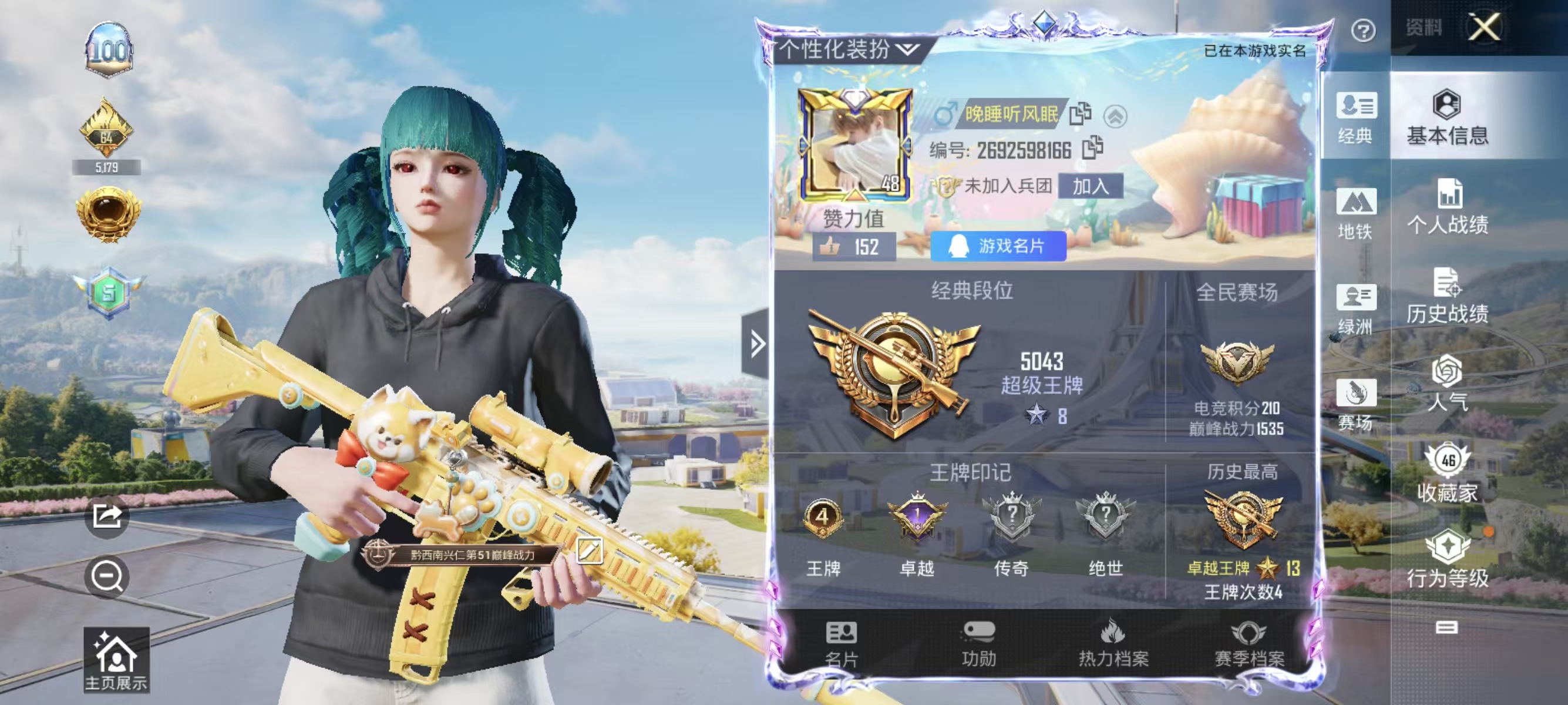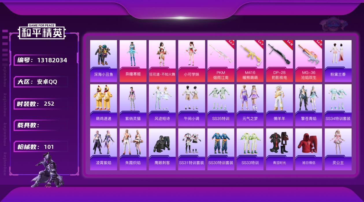 [13182034]实名: 可修改 时装数: 252 枪械数: 101 战备数: 68 热门装扮: 深海小丑鱼,鹰眼刺客,小可学妹,狂花道·不知火舞,异瞳寒姬 稀有枪皮: M416暖熊萌萌,PKM江南烟雨,DP-28-豹影疾电,MG-36-沧焰双生