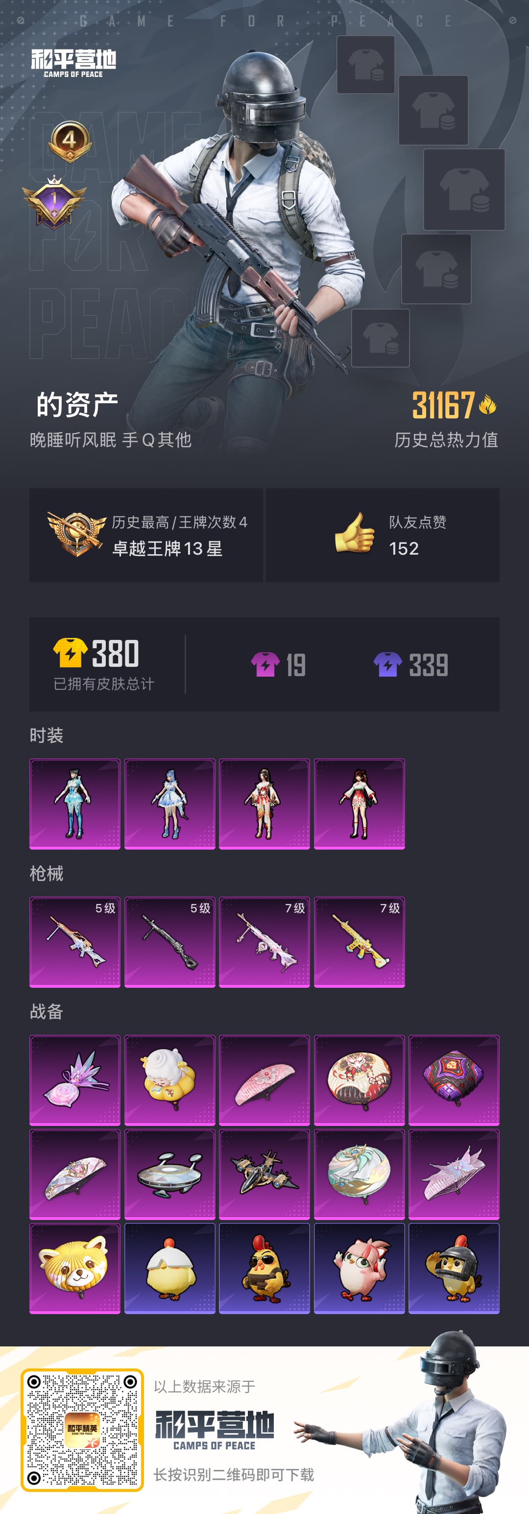 - [12941734]AK3654英雄角色数-150英雄武器数 【王者系列】:王者之蝶,王者之狱 【热门武器】:KSG-孟获,81式-阿波罗,CZS2-仲康 【角色】:审判者,葵,炽天使-X,零-新生 【英雄武器】:AK47-火麒麟*2,AK47-猩红传说,AK47-燎天净火,AK47-血武士,AK47-黑鲨,AK47-木兰,AK47-雅韵青花,AK47-塔罗牌觉醒,AK47-谜城烟火,M4A1-雷神,M4A1-死神*2,M4A1-龙血,M4A1-机械迷城,M4A1-海骑士,M4A1-冰锋觉醒,M4A1-猎神,M4A1-太白诗仙,SCAR Light-白虎,SCAR-探星者,SCAR-心动PICK,AN94-赳赳秦师,AUG-机械纪元,9A91-魔蜥觉醒*2,M14EBR-拂影,M14EBR-葫芦山庄,QBZ03-金色蔷薇,QBZ03-死神*2,QBZ03-玉面羞花,HK416-极光,QBZ19-天使,QBZ97-浩瀚征途,QBZ191-封神榜,AWM-裁决,AWM-天使,AWM-指南针觉醒,巴雷特-毁灭*3,巴雷特-极光*2,巴雷特-朱雀,M200-心动次元觉醒,09式狙-天神,98K-黑骑士,98K-星神,MR1-幽暗骑士,VSK-94-九黎兵主觉醒,加特林-堡垒*3,加特林-蟒蛇*2,QBB95-极光,QBB95-再战涿鹿,汤姆逊-烈龙*3,双持斯泰尔-天使,CBJ-MS-毒蜂*2,CZS2-仲康,DDM4-PDW-星际宇航觉醒,地狱火,嗜血金鲨,地狱烈炎,AA12-火药,KSG-孟获,Origin12-机变奇蛇觉醒,USP-神罚,USP-机械迷城,USP-仁德,沙鹰-修罗*4,沙鹰-神兵修罗,沙鹰-宇航兔兔,双持沙鹰-元让,蚩尤战弓觉醒,改装GLOCK-木兰,蟒蛇-鼓龙,左轮-卧龙觉醒,双持GLOCK18-本初,GLOCK18-猎神,QSZ92-天使,柯尔特-仲达,CZ75-策,掠夺者P365-虹舞,蝴蝶刀-天神,炽芒蝶刃,匕首-浩瀚征途,血阳,手斧-机械迷城*2,气勇胆烈戟,屠龙*4,血月,穷奇铁扇,唐刀-大唐荣耀,擎天