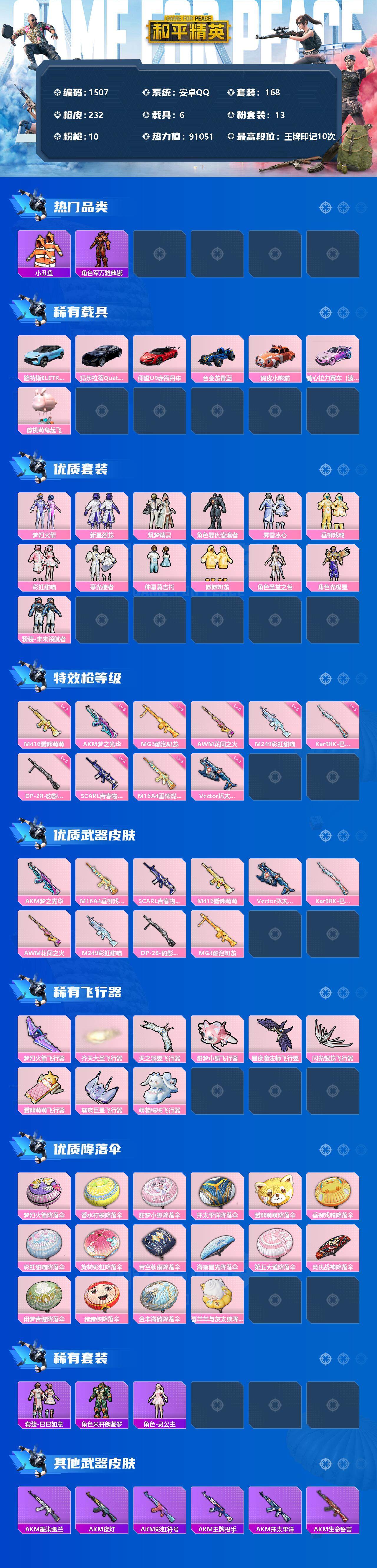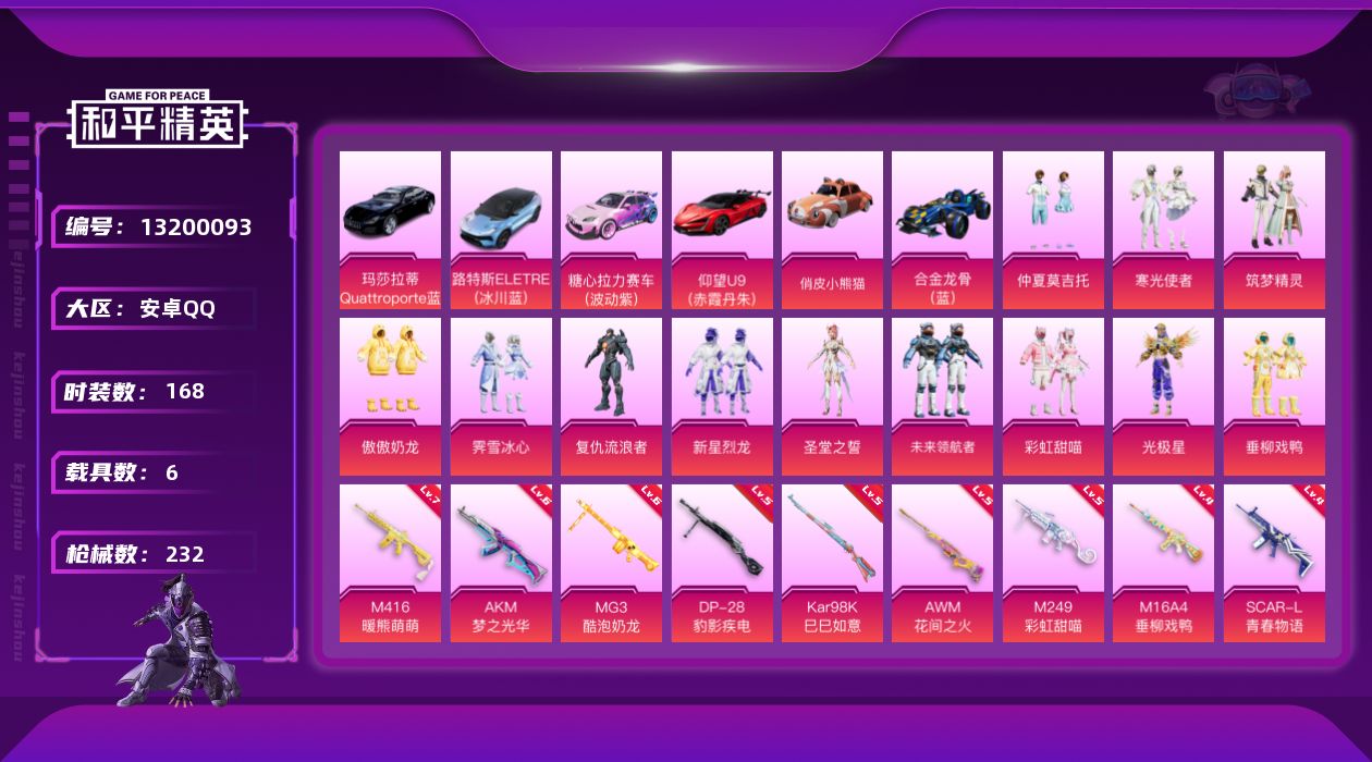 [13200093]安卓 手Q-13粉装-10特效枪-6载具-9粉色飞行器-91051热力值-10王牌印记-168套装-232枪皮 【热门品类】:粉装-梦幻火箭,套装-深海小丑鱼,套装-小丑鱼,套装-奇异狩猎者,角色-军刀雅典娜,套装-龟仙人,套装-暗影哥特,套装-粉红小猪 【粉色载具】:路特斯ELETRE(冰川蓝),玛莎拉蒂Quattroporte(夜幕蓝),仰望U9(赤霞丹朱),合金龙骨(蓝),俏皮小熊猫,糖心拉力赛车(波动紫),僚机-萌兔起飞 【粉色套装】:粉装-梦幻火箭,粉装-新星烈龙,粉装-筑梦精灵,角色-复仇流浪者,粉装-霁雪冰心,粉装-垂柳戏鸭,粉装-彩虹甜喵,粉装-寒光使者,粉装-仲夏莫吉托,粉装-傲傲奶龙,角色-圣堂之誓,角色-光极星,粉装-未来领航者 【粉色枪皮等级】:AKM-梦之光华(六级),M16A4-垂柳戏鸭(四级),SCAR-L-青春物语(四级),M416-暖熊萌萌(七级),Vector-环太平洋(四级),Kar98K-巳巳如意(五级),AWM-花间之火(五级),M249-彩虹甜喵(五级),DP-28-豹影疾电(五级),MG3-酷泡奶龙(六级) 【粉色枪皮】:AKM-梦之光华,M16A4-垂柳戏鸭,SCAR-L-青春物语,M416-暖熊萌萌,Vector-环太平洋,Kar98K-巳巳如意,AWM-花间之火,M249-彩虹甜喵,DP-28-豹影疾电,MG3-酷泡奶龙 【粉色飞行器】:梦幻火箭飞行器,齐天大圣飞行器,天之羽翼飞行器,甜梦小狐飞行器,星夜魔法师飞行翼,闪光银龙飞行器,暖熊萌萌飞行器,璀璨巨星飞行器,萌物绒绒飞行器 【粉色降落伞】:梦幻火箭降落伞,香水柠檬降落伞,甜梦小狐降落伞,环太平洋降落伞,暖熊萌萌降落伞,垂柳戏鸭降落伞,彩虹甜喵降落伞,旋转彩虹降落伞,青空秋雨降落伞,海螺星光降落伞,第五大道降落伞,炎氏战神降落伞,闲梦青缨降落伞,猪猪侠降落伞,金丰海韵降落伞,喜羊羊与灰太狼降落伞 【稀有套装】:套装-龟仙人,套装-巳巳如意,角色-米开朗基罗,角色-灵公主 【稀有枪皮】:AKM-墨染幽兰,AKM-夜灯,AKM-彩虹符号,AKM-王牌投手,AKM-环太平洋,AKM-生命誓言,AKM-破晓战魂,AKM-缤纷海域,AKM-虎虎生威,AKM-霓虹街区,AKM-龙的传人,M16A4-幻世战舞者,M16A4-甜心亚梦,M16A4-红色方程式,SCAR-L-