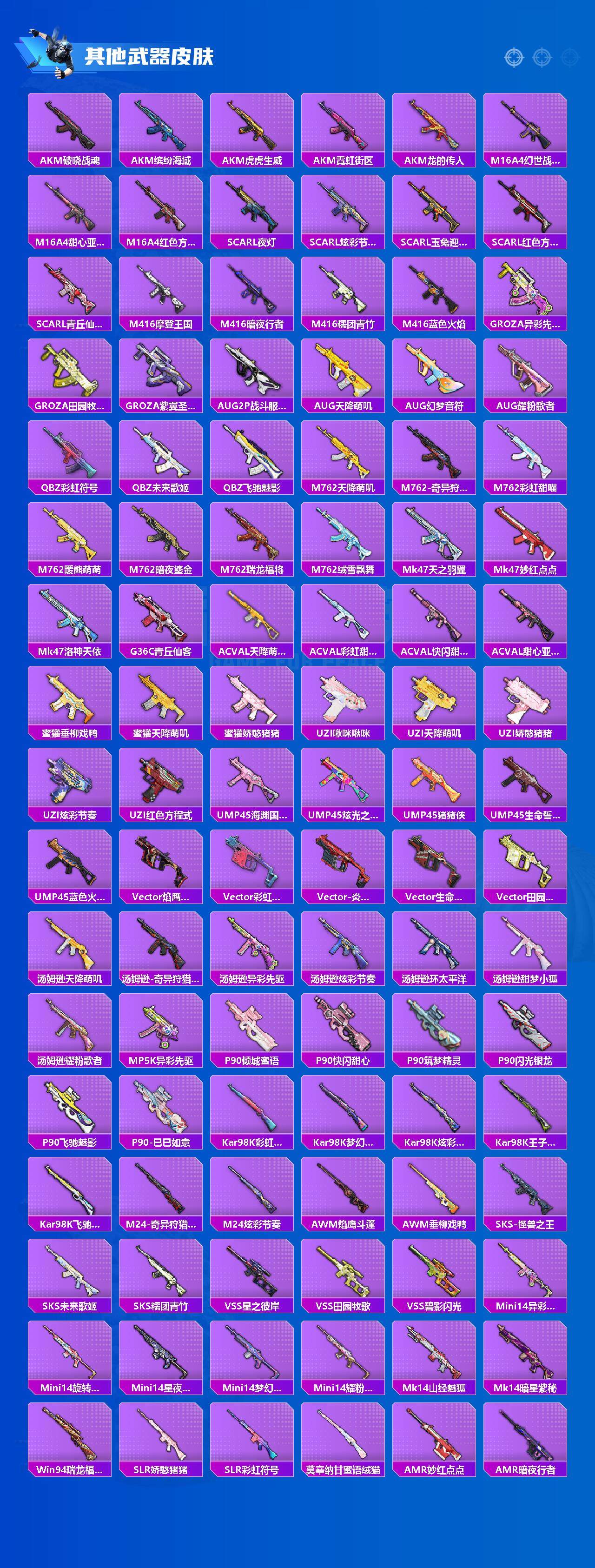 【粉色枪皮】:AKM-梦之光华,M16A4-垂柳戏鸭,SCAR-L-青春物语,M416-暖熊萌萌,Vector-环太平洋,Kar98K-巳巳如意,AWM-花间之火,M249-彩虹甜喵,DP-28-豹影疾电,MG3-酷泡奶龙
