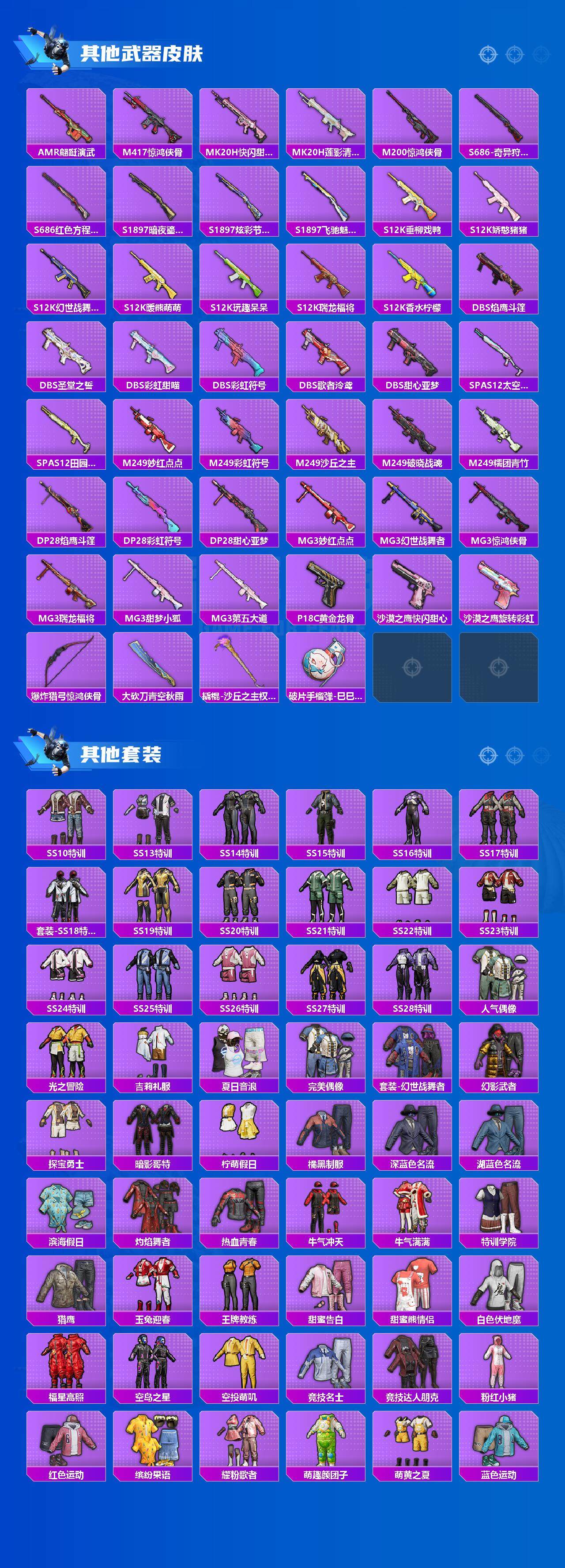 AKM-梦之光华,M16A4-垂柳戏鸭,SCAR-L-青春物语,M416-暖熊萌萌,Vector-环太平洋,Kar98K-巳巳如意,AWM-花间之火,M249-彩虹甜喵,MG3-酷泡奶龙