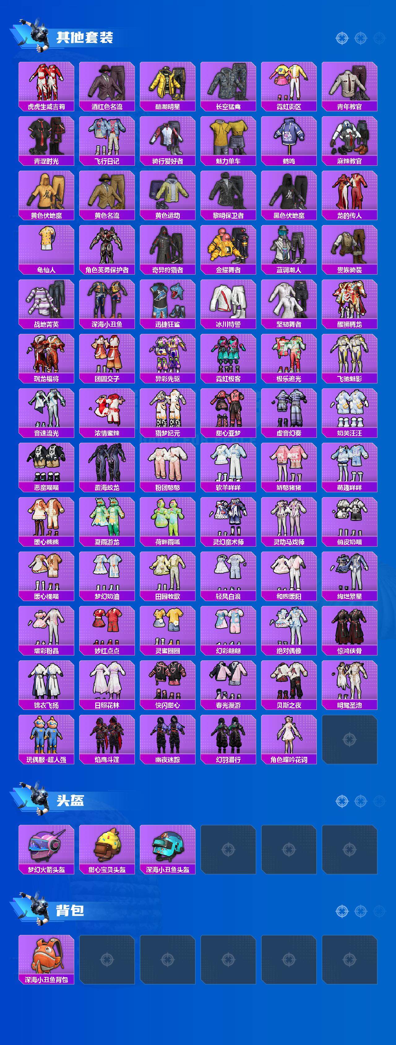 【粉色套装】:粉装-梦幻火箭,粉装-新星烈龙,粉装-筑梦精灵,角色-复仇流浪者,粉装-霁雪冰心,粉装-垂柳戏鸭,粉装-彩虹甜喵,粉装-寒光使者,粉装-仲夏莫吉托,粉装-傲傲奶龙,角色-圣堂之誓,角色-光极星,粉装-未来领航者