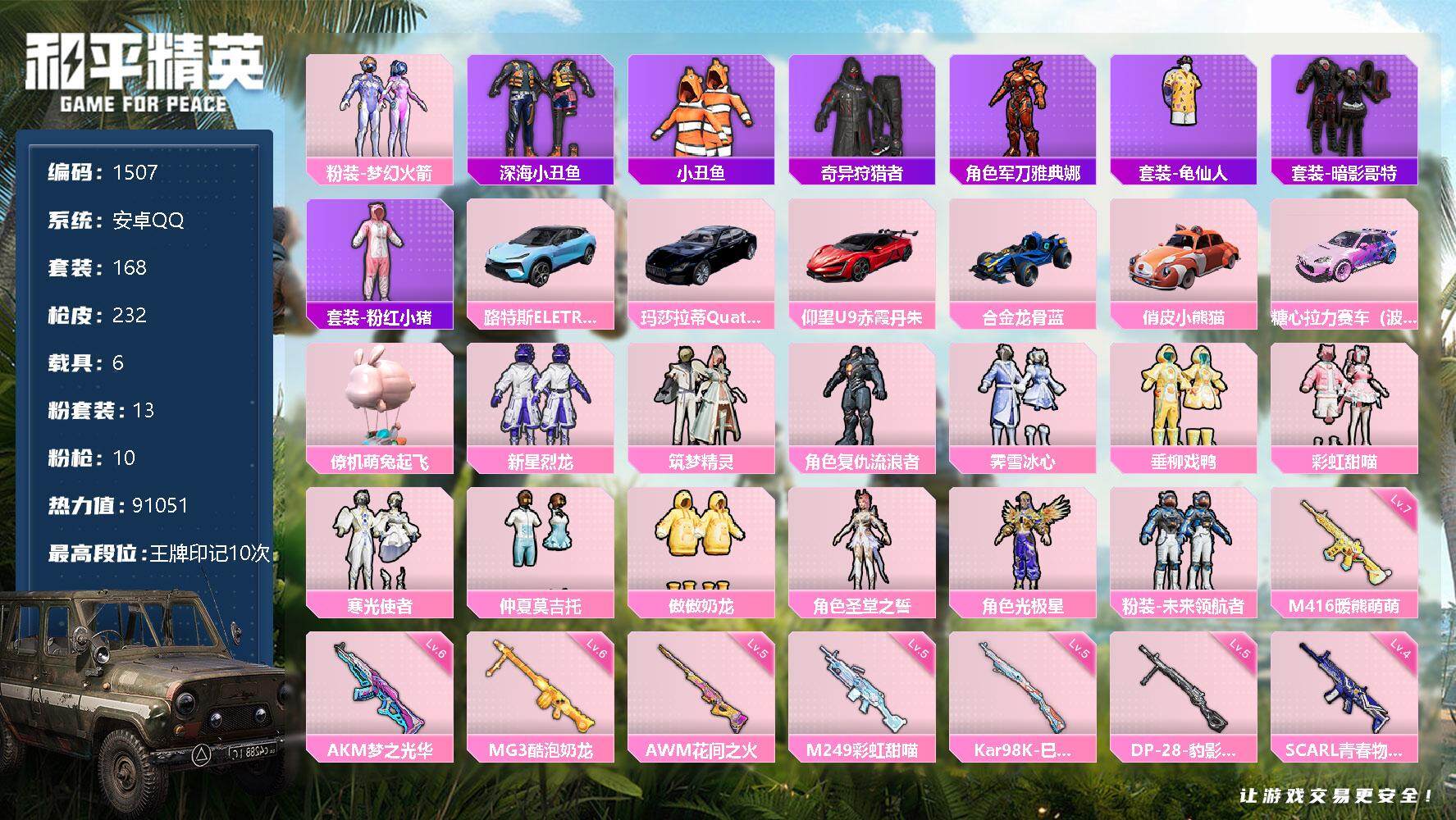 [13200093]安卓 手Q-13粉装-10特效枪-6载具-9粉色飞行器-91051热力值-10王牌印记-168套装-232枪皮