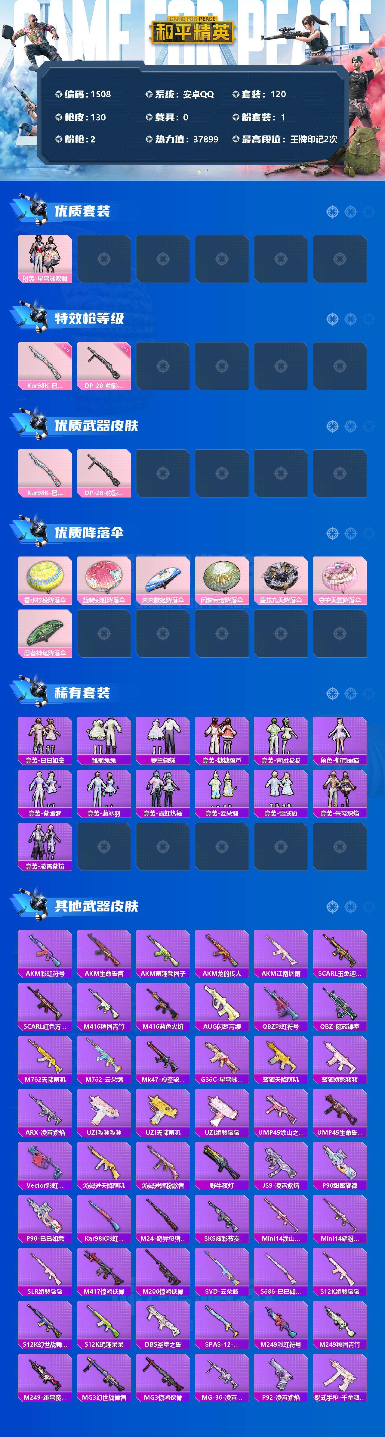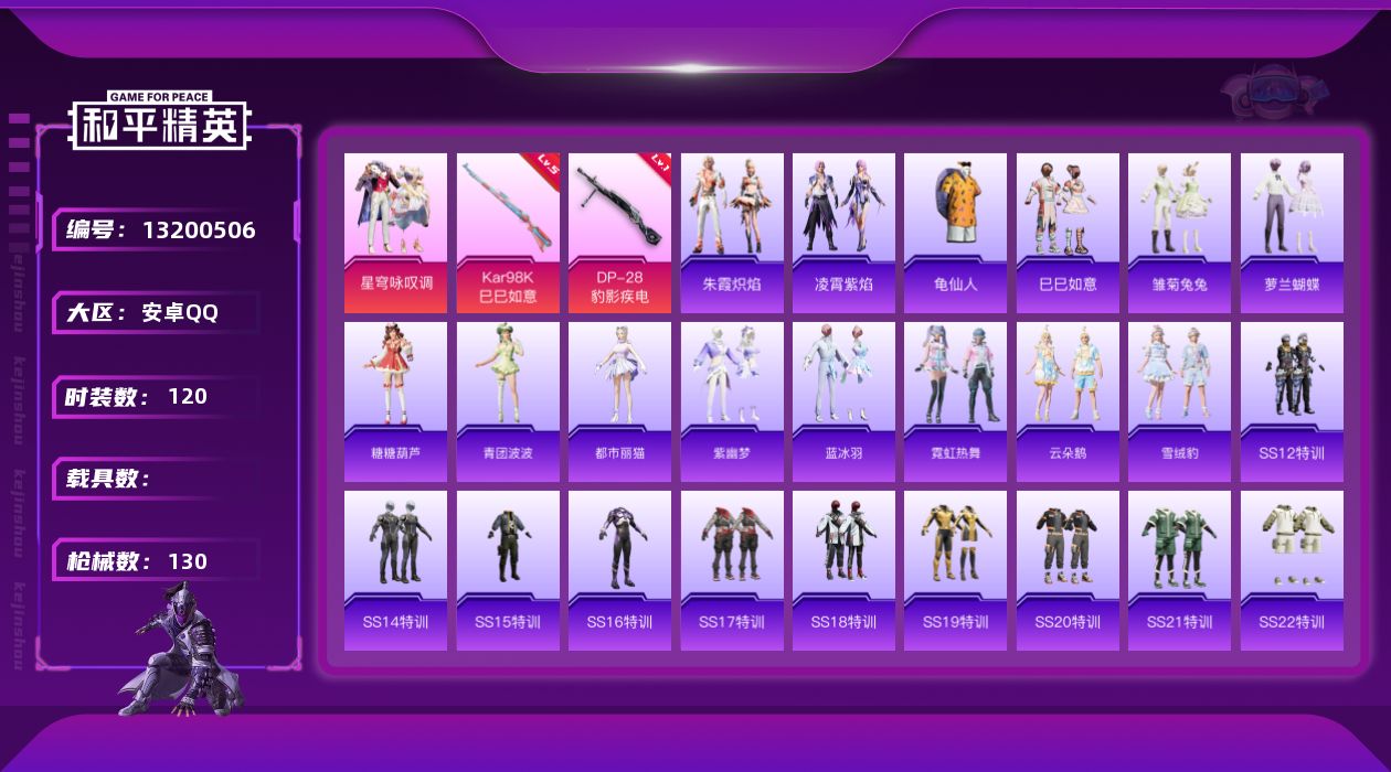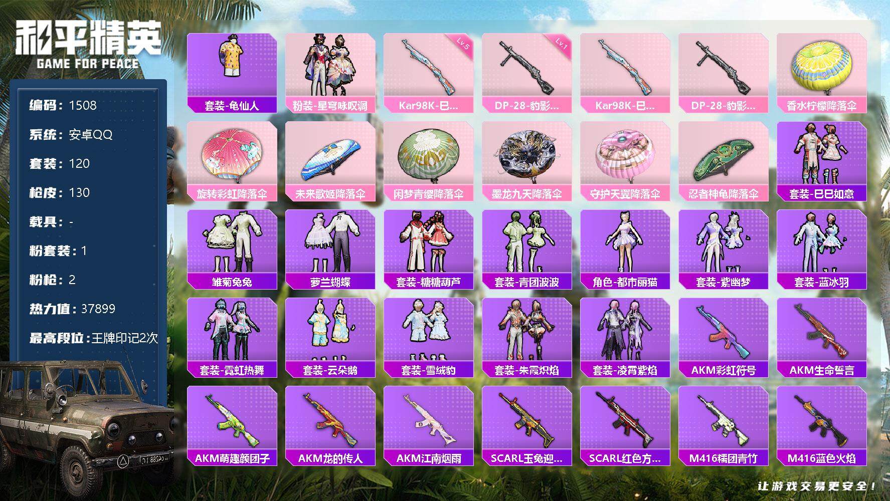 [13200506]安卓 手Q-1粉装-2特效枪-0载具-0粉色飞行器-37899热力值-2王牌印记-120套装-130枪皮 【热门品类】:套装-龟仙人 【粉色套装】:粉装-星穹咏叹调 【粉色枪皮等级】:Kar98K-巳巳如意(五级),DP-28-豹影疾电(一级) 【粉色枪皮】:Kar98K-巳巳如意,DP-28-豹影疾电 【粉色降落伞】:香水柠檬降落伞,旋转彩虹降落伞,未来歌姬降落伞,闲梦青缨降落伞,墨龙九天降落伞,守护天翼降落伞,忍者神龟降落伞 【稀有套装】:套装-龟仙人,套装-巳巳如意,套装-雏菊兔兔,套装-萝兰蝴蝶,套装-糖糖葫芦,套装-青团波波,角色-都市丽猫,套装-紫幽梦,套装-蓝冰羽,套装-霓虹热舞,套装-云朵鹅,套装-雪绒豹,套装-朱霞炽焰,套装-凌霄紫焰 【稀有枪皮】:AKM-彩虹符号,AKM-江南烟雨,AKM-生命誓言,AKM-萌趣颜团子,AKM-龙的传人,SCAR-L-玉兔迎春,SCAR-L-红色方程式,M416-糯团青竹,M416-蓝色火焰,AUG-闲梦青缨,QBZ-彩虹符号,QBZ-魔药课室,M762-天降萌叽,M762-云朵鹅,Mk47-虚空骇客,G36C-星穹咏叹调,蜜獾-天降萌叽,蜜獾-娇憨猪猪,ARX-凌霄紫焰,UZI-啾咪啾咪,UZI-天降萌叽,UZI-娇憨猪猪,UMP45-涂山之恋,UMP45-生命誓言,Vector-彩虹符号,汤姆逊-天降萌叽,汤姆逊-耀粉歌者,野牛-夜灯,JS9-凌霄紫焰,P90-甜蜜旋律,P90-巳巳如意,Kar98K-彩虹符号,M24-奇异狩猎者,SKS-炫彩节奏,Mini14-涂山之恋,Mini14-耀粉歌者,SLR-娇憨猪猪,M417-惊鸿侠骨,M200-惊鸿侠骨,SVD-云朵鹅,S686-巳巳如意,S12K-玩趣呆呆,S12K-娇憨猪猪,S12K-幻世战舞者,DBS-圣堂之誓,SPAS-12-云朵鹅,M249-彩虹符号,M249-糯团青竹,M249-绯穹魔姬,MG3-幻世战舞者,MG3-惊鸿侠骨,MG-36-凌霄紫焰,P92-凌霄紫焰,蝎式手枪-千金淑猫,沙漠之鹰-云朵鹅,TMP-9-雪月幻音,爆炸猎弓-天星战神,爆炸猎弓-惊鸿侠骨,大砍刀-云朵鹅,大砍刀-鬼刀,撬棍-冷漠罗丽,平底锅-凌霄紫焰,破片手榴弹-巳巳如意 【其他套装】:套装-SS12特训,套装-SS14特训,套装-SS15特训,套装-SS16特训,套装-