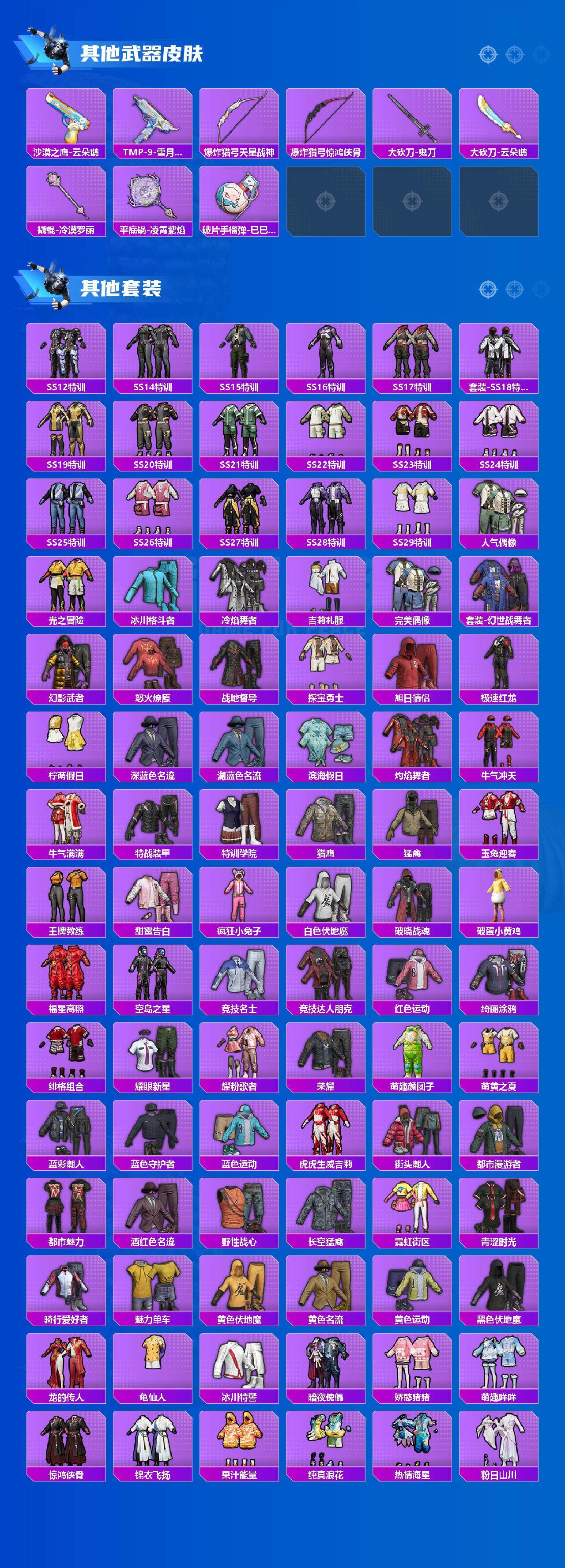 【稀有枪皮】:AKM-彩虹符号,AKM-江南烟雨,AKM-生命誓言,AKM-萌趣颜团子,AKM-龙的传人,SCAR-L-玉兔迎春,SCAR-L-红色方程式,M416-糯团青竹,M416-蓝色火焰,AUG-闲梦青缨,QBZ-彩虹符号,QBZ-魔药课室,M762-天降萌叽,M762-云朵鹅,Mk47-虚空骇客,G36C-星穹咏叹调,蜜獾-天降萌叽,蜜獾-娇憨猪猪,ARX-凌霄紫焰,UZI-啾咪啾咪,UZI-天降萌叽,UZI-娇憨猪猪,UMP45-涂山之恋,UMP45-生命誓言,Vector-彩虹符号,汤姆逊-天降萌叽,汤姆逊-耀粉歌者,野牛-夜灯,JS9-凌霄紫焰,P90-甜蜜旋律,P90-巳巳如意,Kar98K-彩虹符号,M24-奇异狩猎者,SKS-炫彩节奏,Mini14-涂山之恋,Mini14-耀粉歌者,SLR-娇憨猪猪,M417-惊鸿侠骨,M200-惊鸿侠骨,SVD-云朵鹅,S686-巳巳如意,S12K-玩趣呆呆,S12K-娇憨猪猪,S12K-幻世战舞者,DBS-圣堂之誓,SPAS-12-云朵鹅,M249-彩虹符号,M249-糯团青竹,M249-绯穹魔姬,MG3-幻世战舞者,MG3-惊鸿侠骨,MG-36-凌霄紫焰,P92-凌霄紫焰,蝎式手枪-千金淑猫,沙漠之鹰-云朵鹅,TMP-9-雪月幻音,爆炸猎弓-天星战神,爆炸猎弓-惊鸿侠骨,大砍刀-云朵鹅,大砍刀-鬼刀,撬棍-冷漠罗丽,平底锅-凌霄紫焰,破片手榴弹-巳巳如意