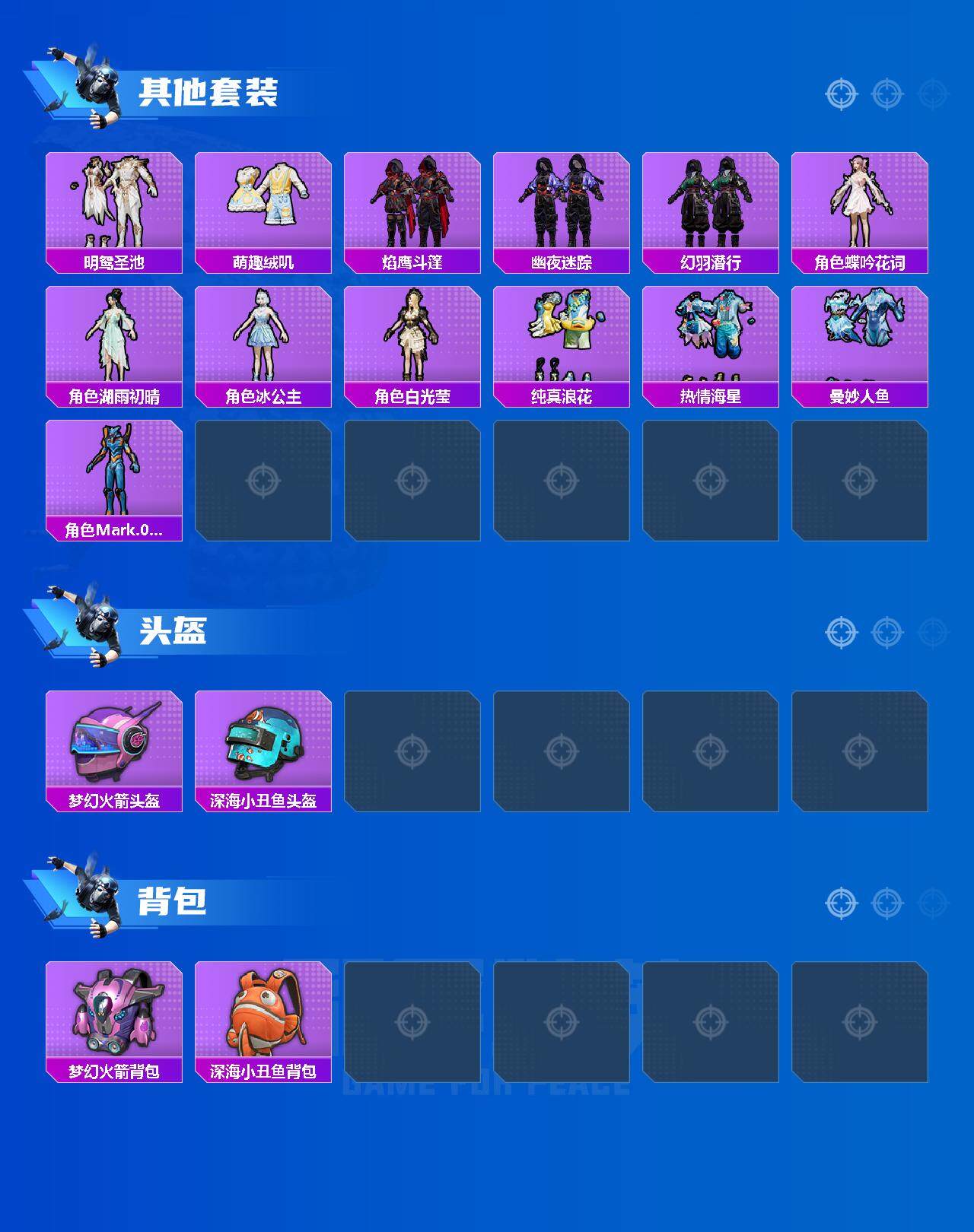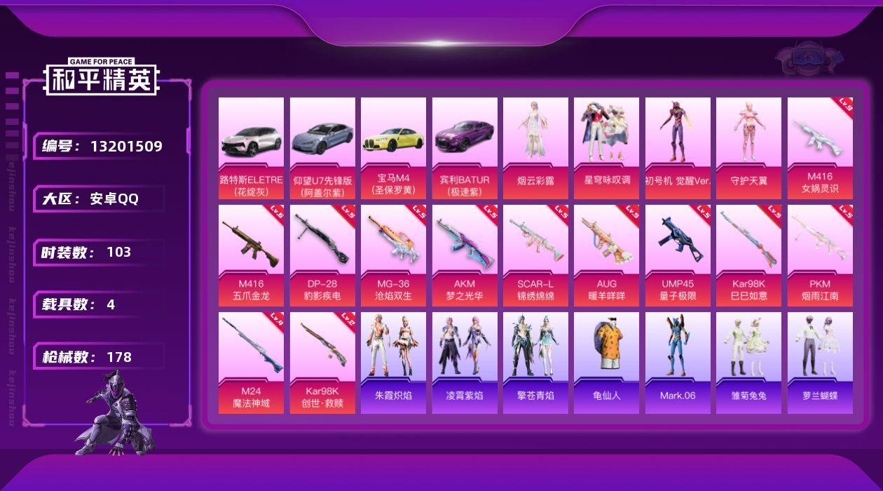 [13201509]安卓 手Q-5粉装-12特效枪-4载具-2粉色飞行器-62896热力值-9王牌印记-103套装-178枪皮 【热门品类】:粉装-梦幻火箭,套装-深海小丑鱼,套装-龟仙人,角色-Mark.06 【粉色载具】:路特斯ELETRE(花绽灰),宾利BATUR(极速紫),仰望U7(阿盖尔紫),宝马M4(圣保罗黄),僚机-萌兔起飞 【粉色套装】:粉装-梦幻火箭,角色-烟云彩露,角色-守护天翼,角色-初号机 觉醒Ver.,粉装-星穹咏叹调 【粉色枪皮等级】:AKM-梦之光华(五级),SCAR-L-锦绣绵绵(五级),M416-五爪金龙(六级),M416-女娲灵识(九级),AUG-暖羊咩咩(五级),UMP45-量子极限(五级),Kar98K-创世·救赎(二级),Kar98K-巳巳如意(五级),M24-魔法神域(四级),DP-28-豹影疾电(五级),PKM-江南烟雨(五级),MG-36-沧焰双生(五级) 【粉色枪皮】:AKM-梦之光华,SCAR-L-锦绣绵绵,M416-五爪金龙,M416-女娲灵识,AUG-暖羊咩咩,UMP45-量子极限,Kar98K-创世·救赎,Kar98K-巳巳如意,M24-魔法神域,DP-28-豹影疾电,PKM-江南烟雨,MG-36-沧焰双生 【粉色飞行器】:镜域双华-灵镜之阶,凤舞九天飞行器 【粉色降落伞】:梦幻火箭降落伞,齐天大圣降落伞,千面幻镜降落伞,第五大道降落伞,天星战神降落伞,莲影清波降落伞,镜域双华降落伞,江南烟雨降落伞,精灵梦叶罗丽降落伞,初号机 觉醒Ver.降落伞,忍者神龟降落伞,BEARBRICK降落伞,未来领航者降落伞,异瞳寒姬降落伞 【稀有套装】:套装-龟仙人,套装-雏菊兔兔,套装-萝兰蝴蝶,角色-多纳泰罗,套装-糖糖葫芦,套装-青团波波,角色-摩登魅猫,角色-临安公主,套装-燕燕于飞,套装-鱼渊荷华,套装-风舞幻音,套装-粉恋花,套装-紫幽梦,套装-蓝冰羽,套装-星影赞美诗,套装-星渊小夜曲,套装-彩虹兔,套装-云朵鹅,套装-雪绒豹,套装-朱霞炽焰,套装-凌霄紫焰,套装-擎苍青焰 【稀有枪皮】:AKM-彩虹符号,AKM-江南烟雨,AKM-破晓战魂,AKM-霓虹街区,AKM-龙的传人,M16A4-幻世战舞者,SCAR-L-红色方程式,M416-糯团青竹,M416-蓝色火焰,GROZA-影袭,GROZA-懵萌河马,GROZA-酷泡奶龙,AU