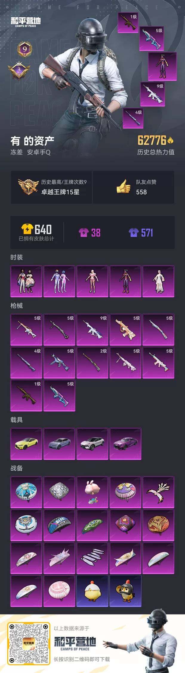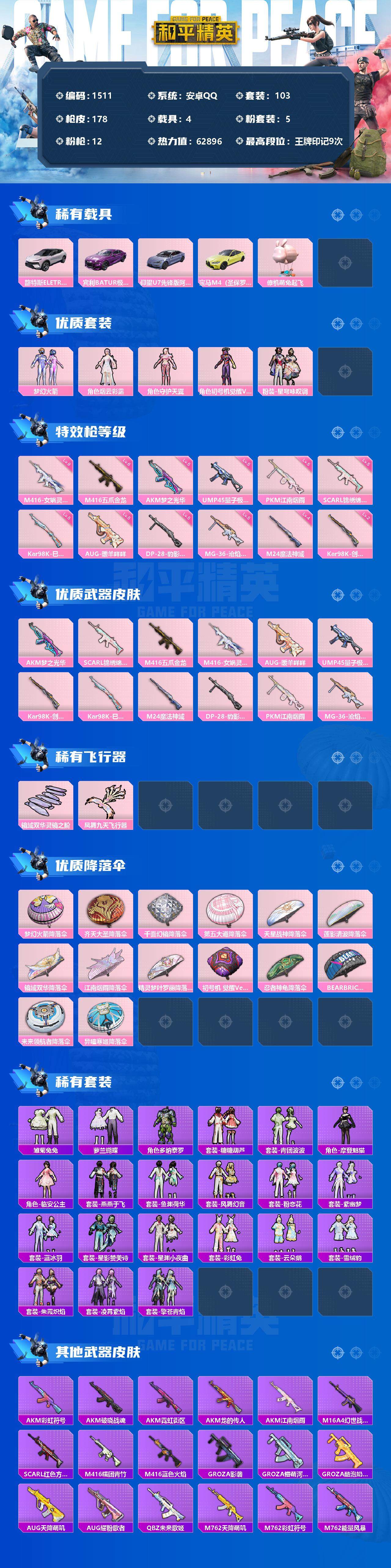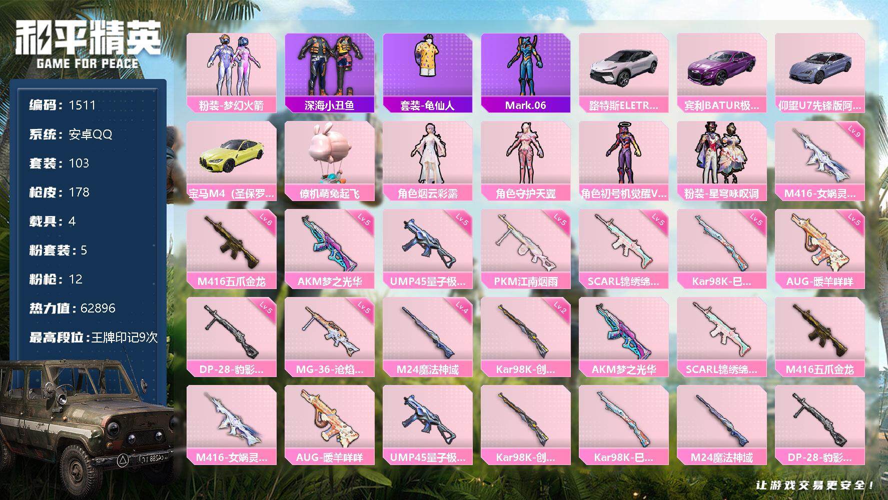 [13201509]安卓 手Q-5粉装-12特效枪-4载具-2粉色飞行器-62896热力值-9王牌印记-103套装-178枪皮