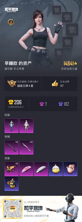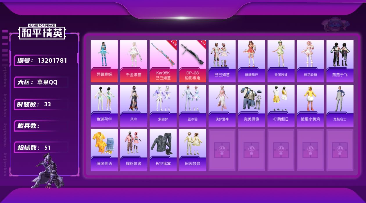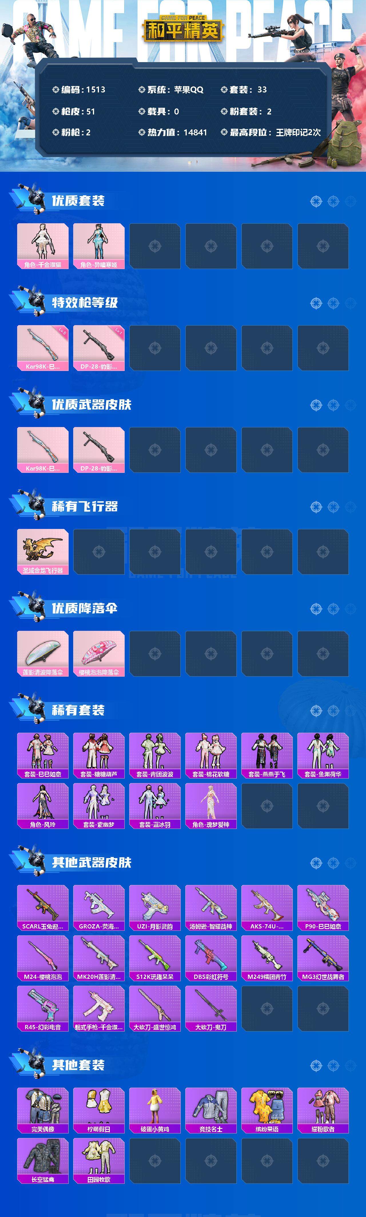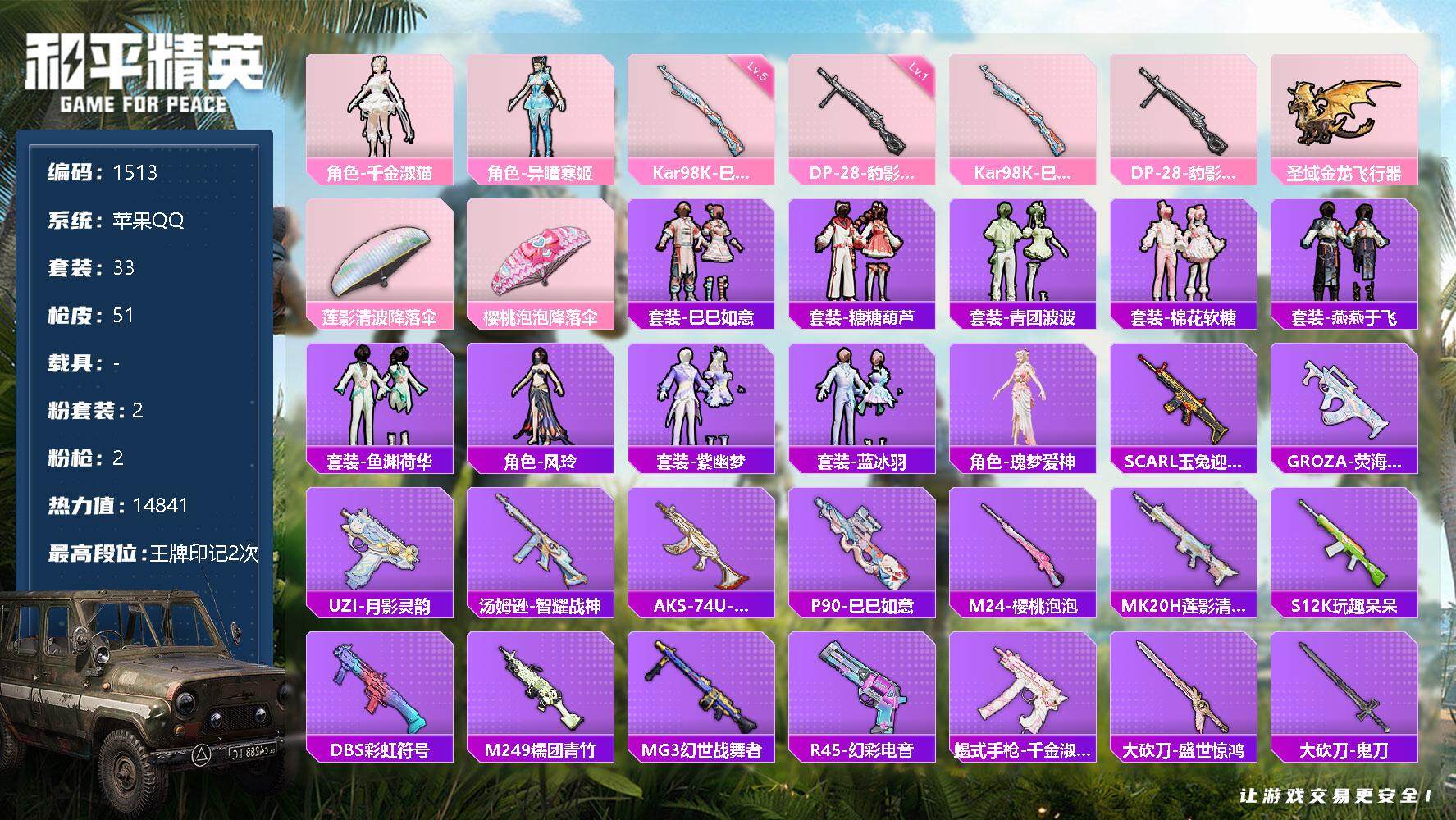 [13201781]苹果 手Q-2粉装-2特效枪-0载具-1粉色飞行器-14841热力值-2王牌印记-33套装-51枪皮 【粉色套装】:角色-千金淑猫,角色-异瞳寒姬 【粉色枪皮等级】:Kar98K-巳巳如意(五级),DP-28-豹影疾电(一级) 【粉色枪皮】:Kar98K-巳巳如意,DP-28-豹影疾电 【粉色飞行器】:圣域金龙飞行器 【粉色降落伞】:莲影清波降落伞,樱桃泡泡降落伞 【稀有套装】:套装-巳巳如意,套装-糖糖葫芦,套装-青团波波,套装-棉花软糖,套装-燕燕于飞,套装-鱼渊荷华,角色-风玲,套装-紫幽梦,套装-蓝冰羽,角色-瑰梦爱神 【稀有枪皮】:SCAR-L-玉兔迎春,GROZA-荧海星豚,UZI-月影灵韵,汤姆逊-智耀战神,AKS-74U-鬼刀,P90-巳巳如意,M24-樱桃泡泡,MK20-H-莲影清波,S12K-玩趣呆呆,DBS-彩虹符号,M249-糯团青竹,MG3-幻世战舞者,R45-幻彩电音,蝎式手枪-千金淑猫,大砍刀-盛世惊鸿,大砍刀-鬼刀 【其他套装】:套装-完美偶像,套装-柠萌假日,套装-破蛋小黄鸡,套装-竞技名士,套装-缤纷果语,套装-耀粉歌者,套装-长空猛禽,套装-田园牧歌 【营地ID】:993288252