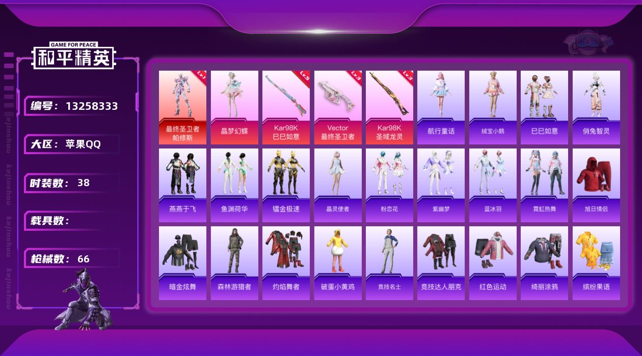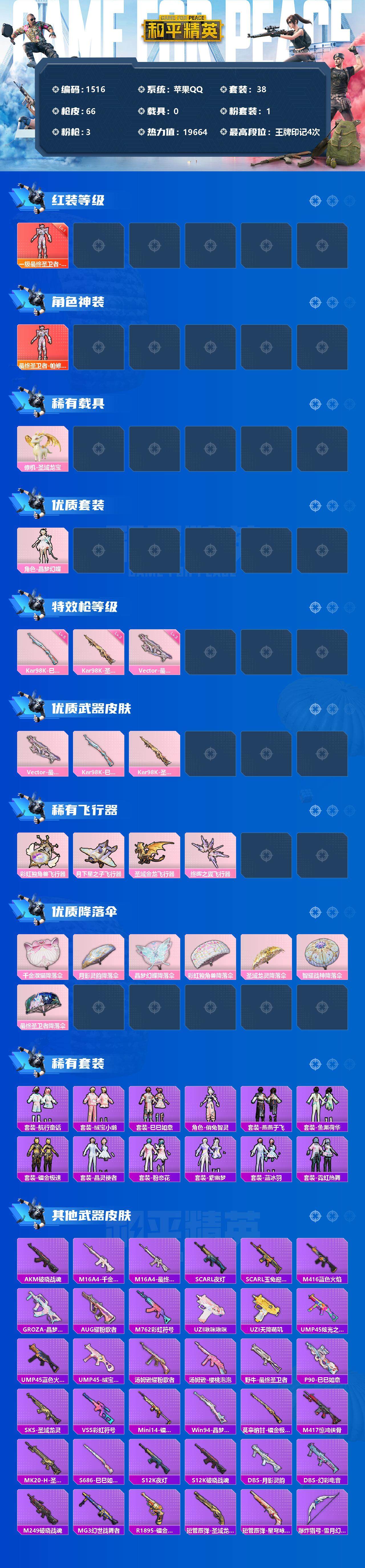 [13258333]苹果 手Q-1神装-1粉装-3特效枪-0载具-4粉色飞行器-19664热力值-4王牌印记-38套装-66枪皮 【红色神装等级】:最终圣卫者-帕修斯(一级) 【红色角色神装】:最终圣卫者-帕修斯 【粉色载具】:僚机-圣域龙宝 【粉色套装】:角色-晶梦幻蝶 【粉色枪皮等级】:Vector-最终圣卫者(三级),Kar98K-巳巳如意(五级),Kar98K-圣域龙灵(三级) 【粉色枪皮】:Vector-最终圣卫者,Kar98K-巳巳如意,Kar98K-圣域龙灵 【粉色飞行器】:彩虹独角兽飞行器,月下星之子飞行器,圣域金龙飞行器,终晖之翼飞行器 【粉色降落伞】:千金淑猫降落伞,月影灵韵降落伞,晶梦幻蝶降落伞,彩虹独角兽降落伞,圣域龙灵降落伞,智耀战神降落伞,最终圣卫者降落伞 【稀有套装】:套装-航行童话,套装-绒宝小鹅,套装-巳巳如意,角色-俏兔智灵,套装-燕燕于飞,套装-鱼渊荷华,套装-镭金极速,套装-晶灵使者,套装-粉恋花,套装-紫幽梦,套装-蓝冰羽,套装-霓虹热舞 【稀有枪皮】:AKM-破晓战魂,M16A4-最终圣卫者,M16A4-千金淑猫,SCAR-L-夜灯,SCAR-L-玉兔迎春,M416-蓝色火焰,GROZA-晶梦幻蝶,AUG-耀粉歌者,M762-彩虹符号,UZI-啾咪啾咪,UZI-天降萌叽,UMP45-炫光之旅,UMP45-蓝色火焰,UMP45-绒宝小鹅,汤姆逊-耀粉歌者,汤姆逊-樱桃泡泡,野牛-最终圣卫者,P90-巳巳如意,SKS-圣域龙灵,VSS-彩虹符号,Mini14-镭金极速,Win94-晶梦幻蝶,莫辛纳甘-镭金极速,M417-惊鸿侠骨,MK20-H-圣域龙灵,S686-巳巳如意,S12K-破晓战魂,S12K-夜灯,DBS-幻彩电音,DBS-月影灵韵,M249-破晓战魂,MG3-幻世战舞者,R1895-镭金极速,短管霰弹-圣域龙灵,短管霰弹-星穹咏叹调,爆炸猎弓-雪月幻音,破片手榴弹-巳巳如意 【其他套装】:套装-旭日情侣,套装-暗金炫舞,套装-森林游猎者,套装-灼焰舞者,套装-破蛋小黄鸡,套装-竞技名士,套装-竞技达人朋克,套装-红色运动,套装-绮丽涂鸦,套装-缤纷果语,套装-长空猛禽,套装-黄色伏地魔 【营地ID】:972207671