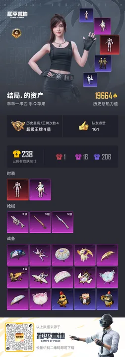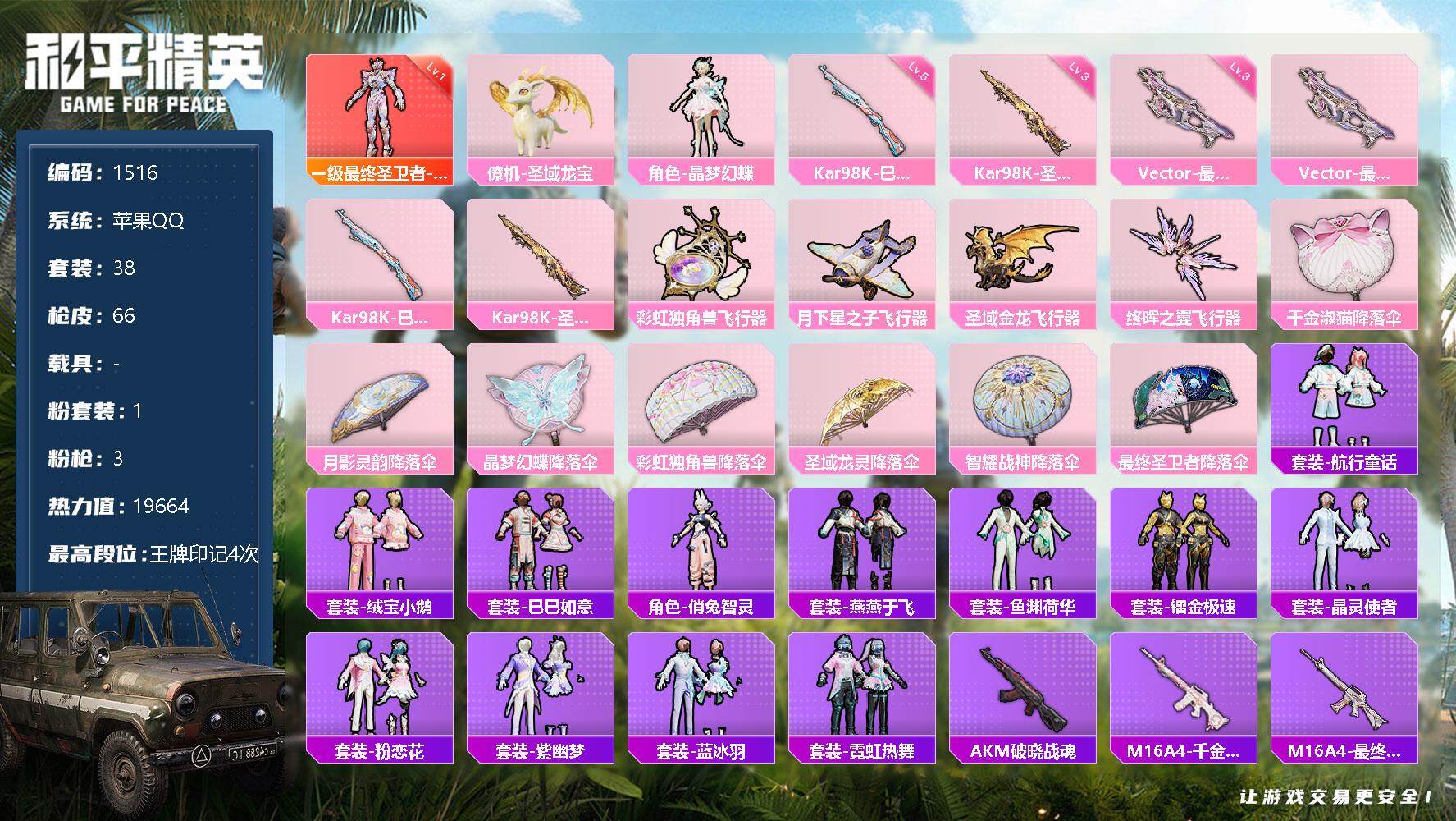 [13258333]苹果 手Q-1神装-1粉装-3特效枪-0载具-4粉色飞行器-19664热力值-4王牌印记-38套装-66枪皮