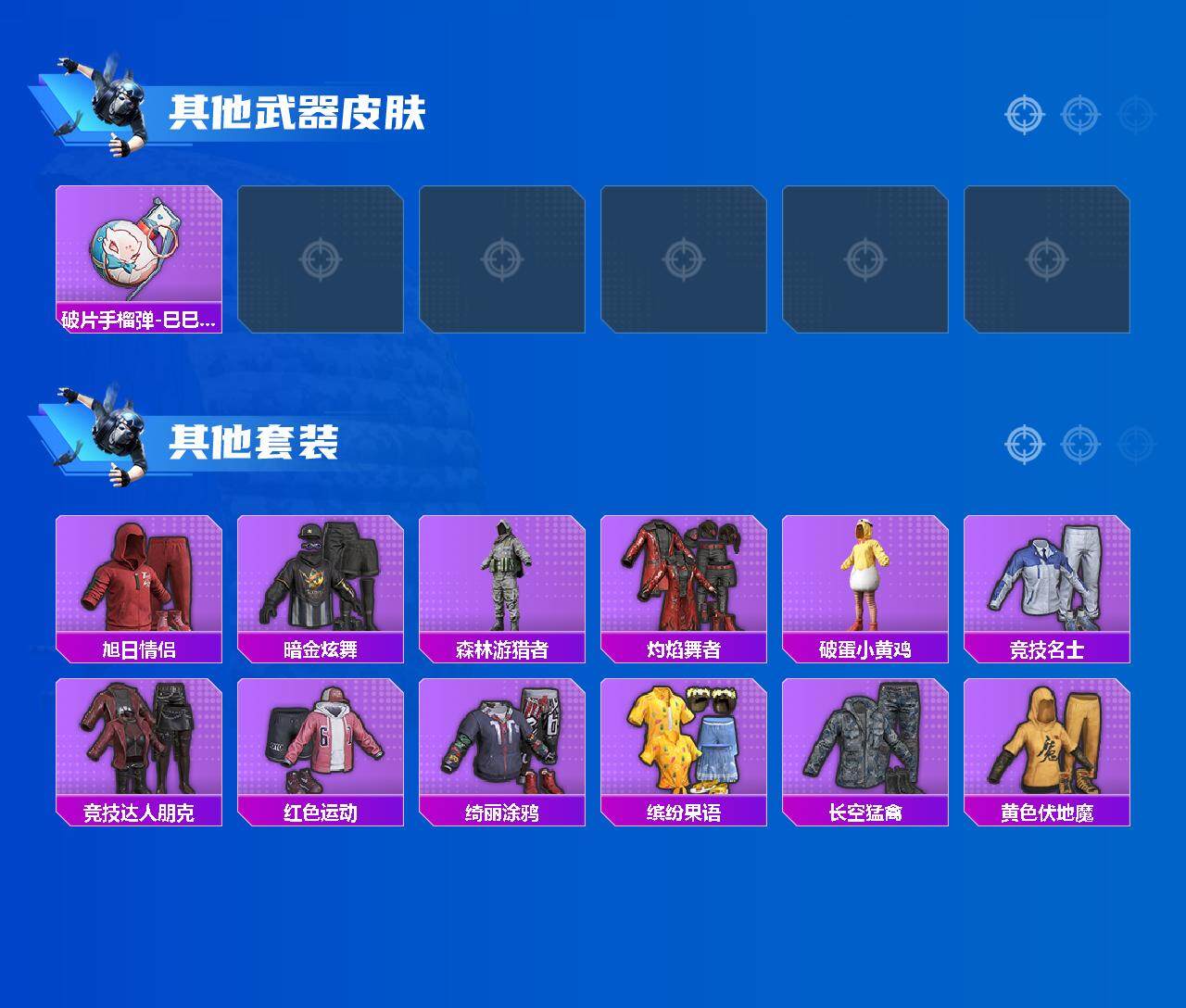 【其他套装】:套装-旭日情侣,套装-暗金炫舞,套装-森林游猎者,套装-灼焰舞者,套装-破蛋小黄鸡,套装-竞技名士,套装-竞技达人朋克,套装-红色运动,套装-绮丽涂鸦,套装-缤纷果语,套装-长空猛禽,套装-黄色伏地魔