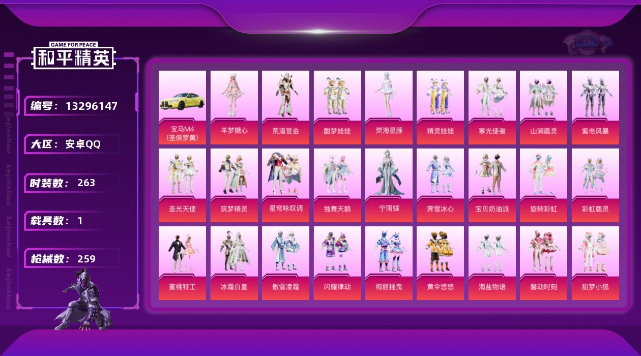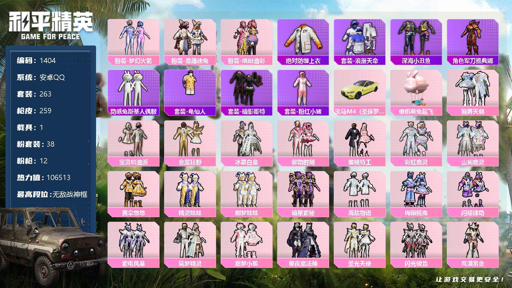 [13296147]安卓 手Q-无敌战神框-38粉装-12特效枪-1载具-11粉色飞行器-106513热力值-15王牌印记-263套装-259枪皮