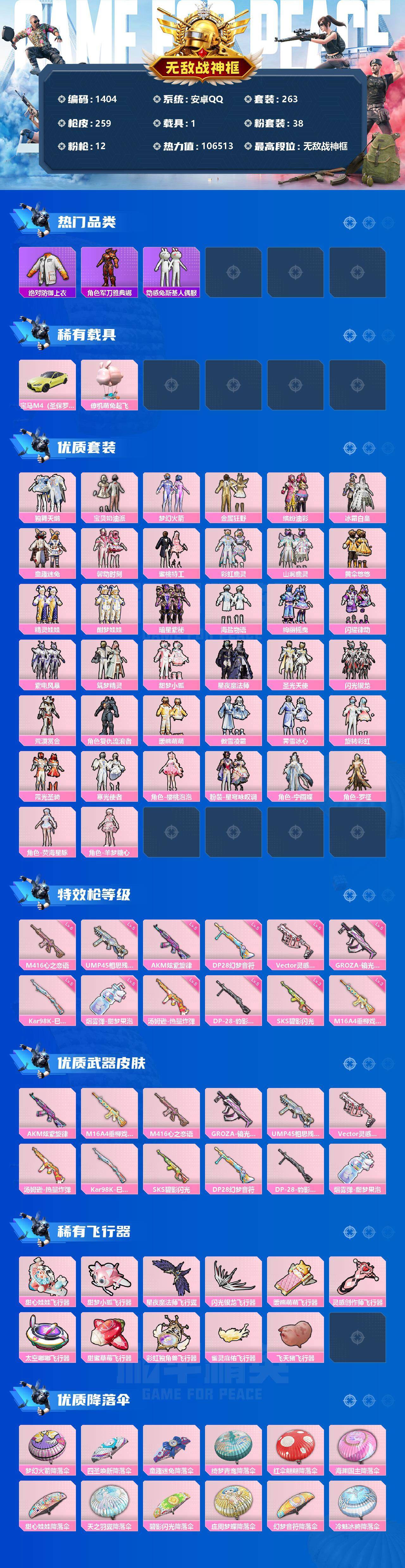 [13296147]安卓 手Q-无敌战神框-38粉装-12特效枪-1载具-11粉色飞行器-106513热力值-15王牌印记-263套装-259枪皮 【热门品类】:粉装-梦幻火箭,粉装-童趣迷兔,粉装-缤纷油彩,绝对防御上衣,套装-浪漫天命,套装-深海小丑鱼,角色-军刀雅典娜,套装-动感兔斯基人偶服,套装-龟仙人,套装-暗影哥特,套装-粉红小猪 【粉色载具】:宝马M4(圣保罗黄),僚机-萌兔起飞 【粉色套装】:粉装-独舞天鹅,粉装-宝贝奶油派,粉装-梦幻火箭,粉装-金属狂野,粉装-缤纷油彩,粉装-冰霜白皇,粉装-童趣迷兔,粉装-馨动时刻,粉装-蜜桃特工,粉装-彩虹鹿灵,粉装-山涧鹿灵,粉装-黄伞悠悠,粉装-精灵娃娃,粉装-酣梦娃娃,粉装-暗星紫秘,粉装-海盐物语,粉装-绚丽摇曳,粉装-闪耀律动,粉装-紫电风暴,粉装-筑梦精灵,粉装-甜梦小狐,粉装-星夜魔法师,粉装-圣光天使,粉装-闪光银龙,粉装-荒漠赏金,角色-复仇流浪者,粉装-暖熊萌萌,粉装-傲雪凌霜,粉装-霁雪冰心,粉装-旋转彩虹,粉装-霞光圣骑,粉装-寒光使者,角色-樱桃泡泡,粉装-星穹咏叹调,角色-宁雨蝶,角色-罗征,角色-荧海星豚,角色-羊梦糖心 【粉色枪皮等级】:AKM-炫紫旋律(五级),M16A4-垂柳戏鸭(三级),M416-心之恋语(六级),GROZA-镜光银凌(五级),UMP45-相思残雪(五级),Vector-灵感创作师(五级),汤姆逊-热量炸弹(五级),Kar98K-巳巳如意(五级),SKS-碧影闪光(三级),DP-28-幻梦音符(五级),DP-28-豹影疾电(五级),烟雾弹-甜梦果泡(五级) 【粉色枪皮】:AKM-炫紫旋律,M16A4-垂柳戏鸭,M416-心之恋语,GROZA-镜光银凌,UMP45-相思残雪,Vector-灵感创作师,汤姆逊-热量炸弹,Kar98K-巳巳如意,SKS-碧影闪光,DP-28-幻梦音符,DP-28-豹影疾电,烟雾弹-甜梦果泡 【粉色飞行器】:甜心娃娃飞行器,甜梦小狐飞行器,星夜魔法师飞行翼,闪光银龙飞行器,暖熊萌萌飞行器,灵感创作师飞行器,太空嘟嘟飞行器,甜蜜草莓飞行器,彩虹独角兽飞行器,雀灵庇佑飞行器,飞天猪飞行器 【粉色降落伞】:梦幻火箭降落伞,四圣焕新降落伞,童趣迷兔降落伞,绮梦青鸾降落伞,红伞翩翩降落伞,海渊国主降落伞,甜心娃娃降落伞,天之羽翼降落伞,碧影闪光降落伞,庄周梦蝶