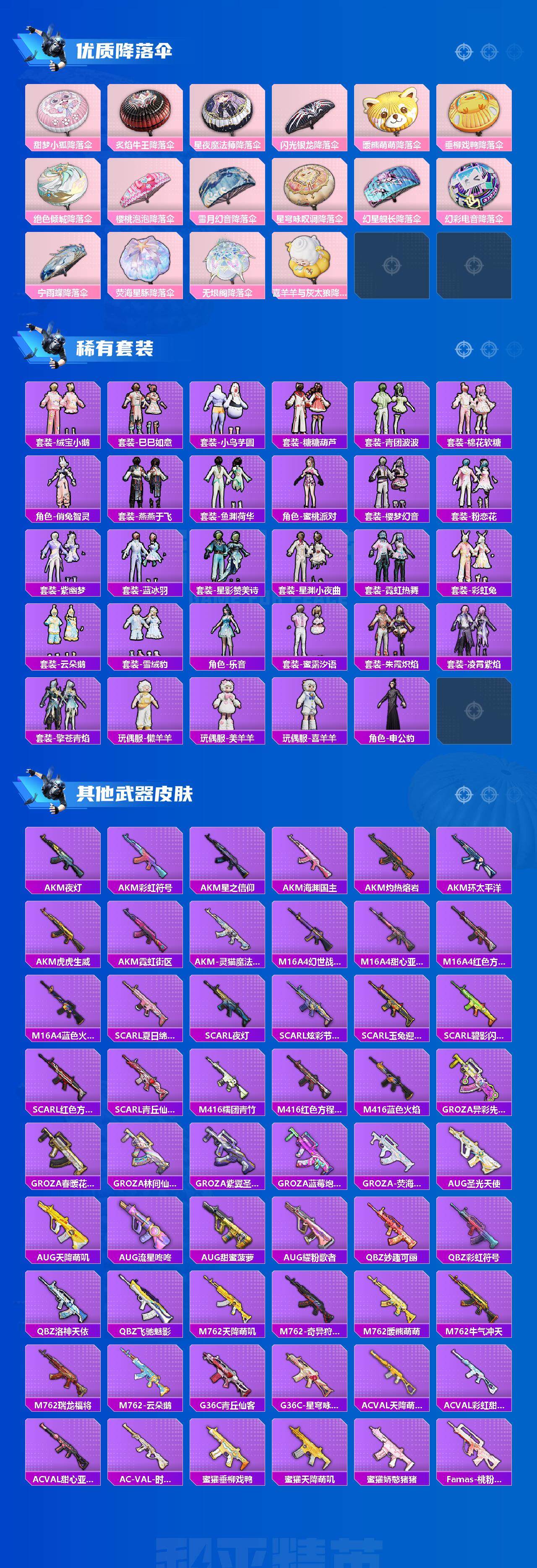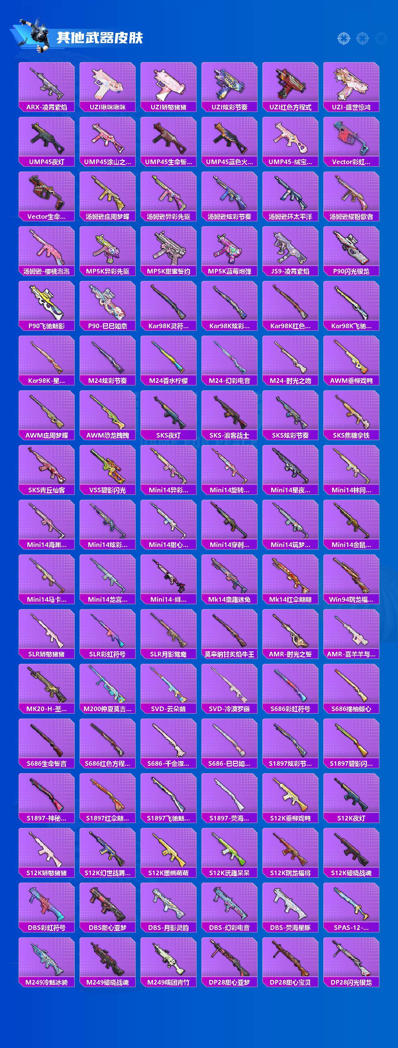 【粉色枪皮】:AKM-炫紫旋律,M16A4-垂柳戏鸭,M416-心之恋语,GROZA-镜光银凌,UMP45-相思残雪,Vector-灵感创作师,汤姆逊-热量炸弹,Kar98K-巳巳如意,SKS-碧影闪光,DP-28-幻梦音符,DP-28-豹影疾电,烟雾弹-甜梦果泡
