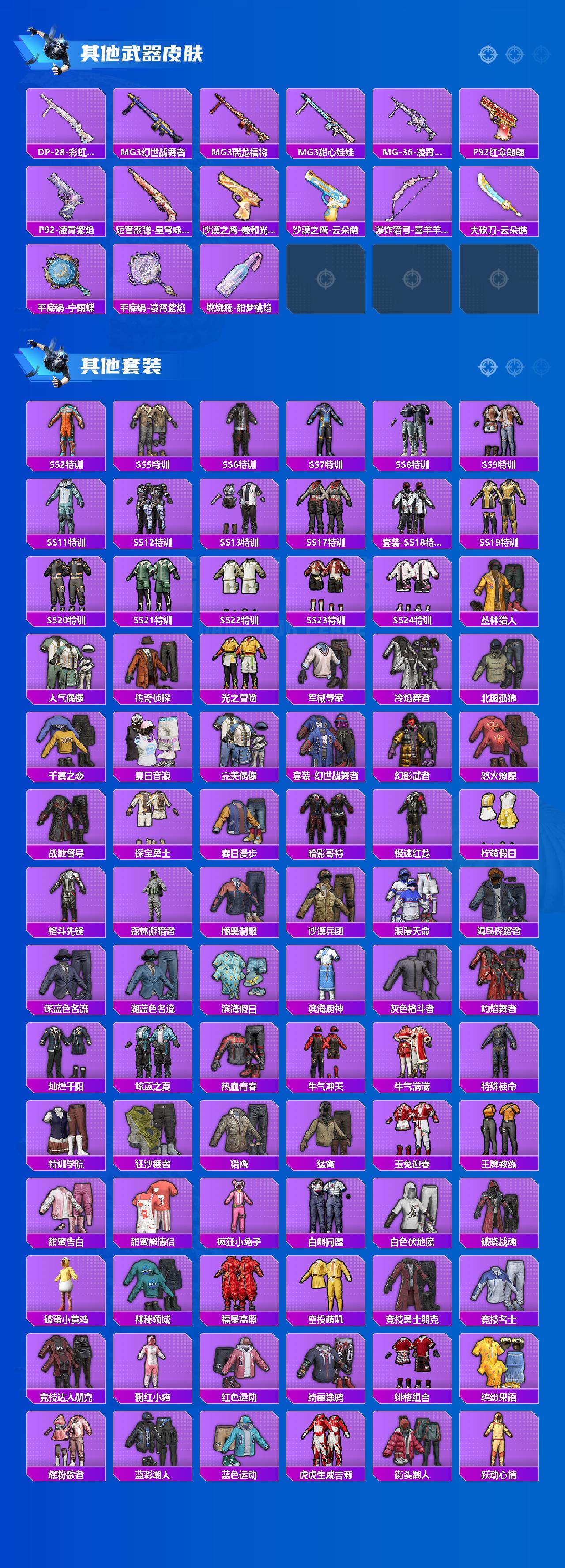 套装-荒漠赏金,套装-酣梦娃娃,套装-精灵娃娃,套装-寒光使者,套装-山涧鹿灵,套装-紫电风暴,套装-圣光天使,套装-筑梦精灵,独舞天鹅套装,套装-霁雪冰心,套装-宝贝奶油派,套装-旋转彩虹,套装-彩虹鹿灵,套装-蜜桃特工,套装-傲雪凌霜,套装-闪耀律动,套装-绚丽摇曳,套装-黄伞悠悠,套装-海盐物语,套装-馨动时刻,套装-甜梦小狐,套装-闪光银龙,套装-霞光圣骑,套装-金属狂野,套装-暖熊萌萌,套装-暗星紫秘,套装-缤纷油彩,角色-复仇流浪者,角色-樱桃泡泡,套装-星夜魔法师